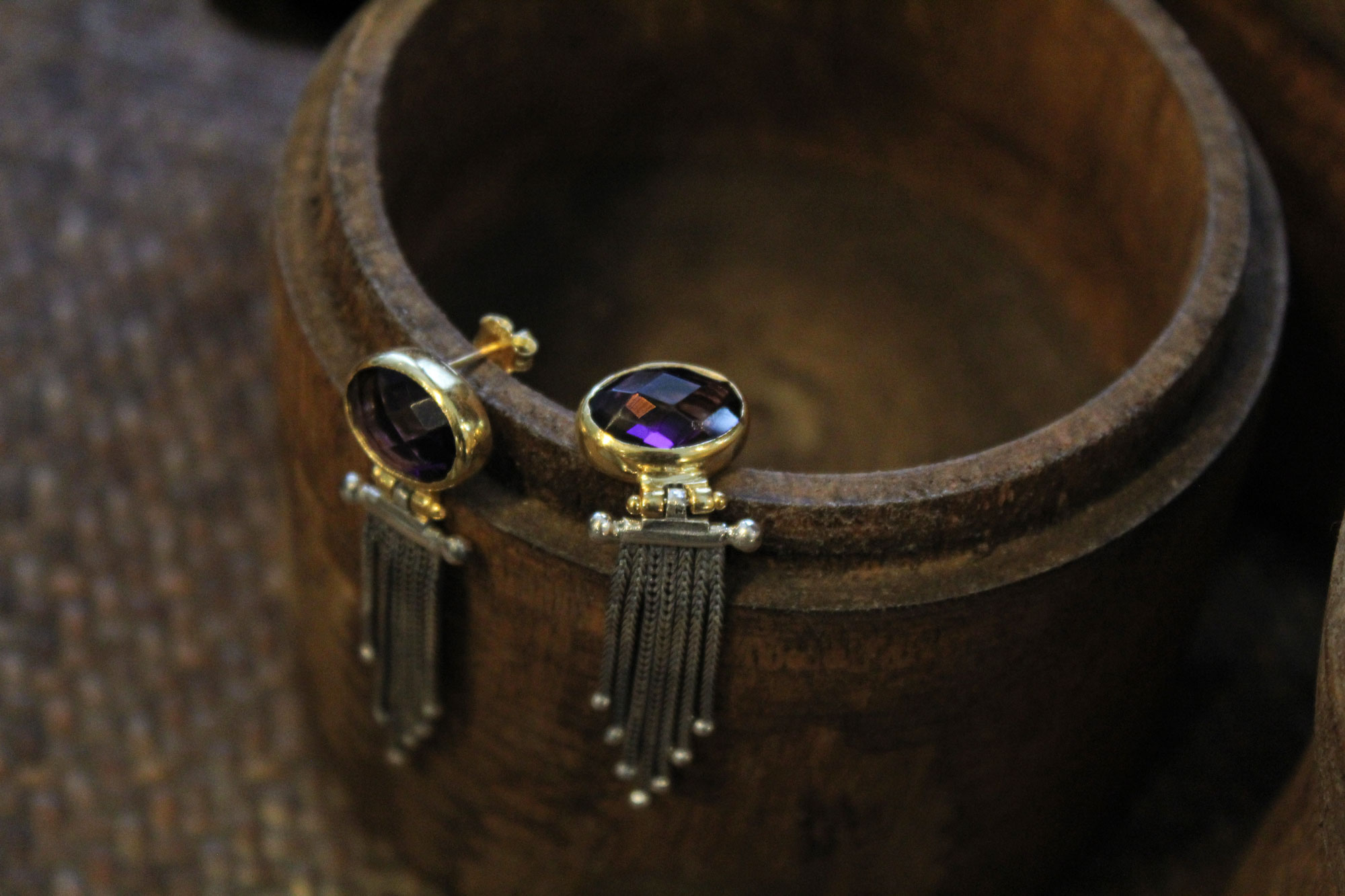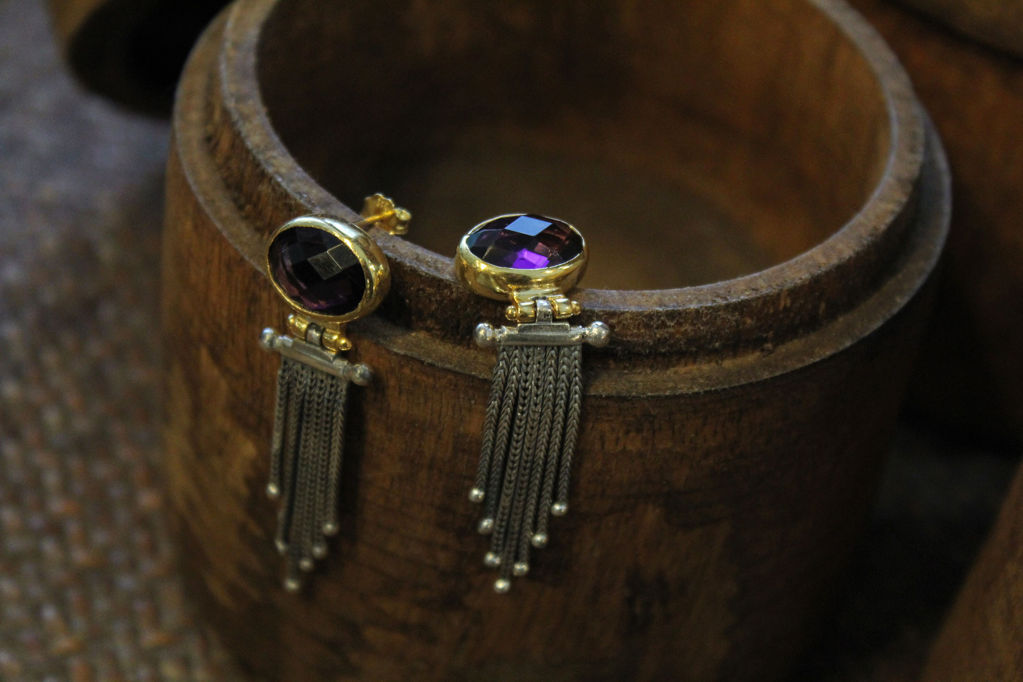 Μοναδικά, χειροποίητα σκουλαρίκια με κρόσια κατασκευασμένα από ασήμι με επιχρυσωμένα μέρη και φυσικά πετρώματα αμέθυστου σε κοπή ταγιέ.