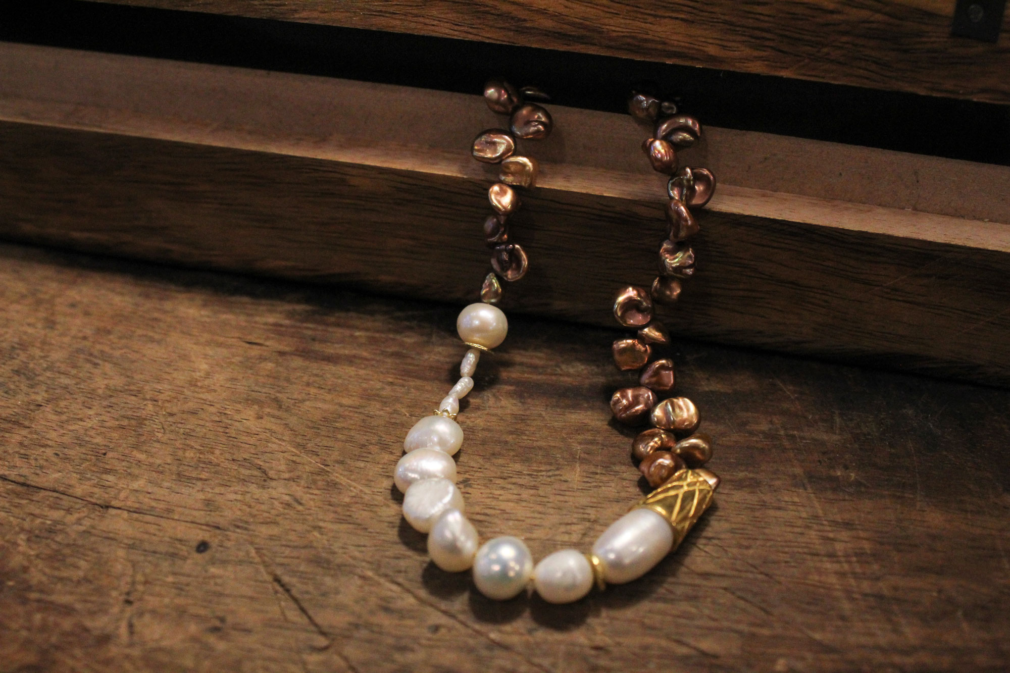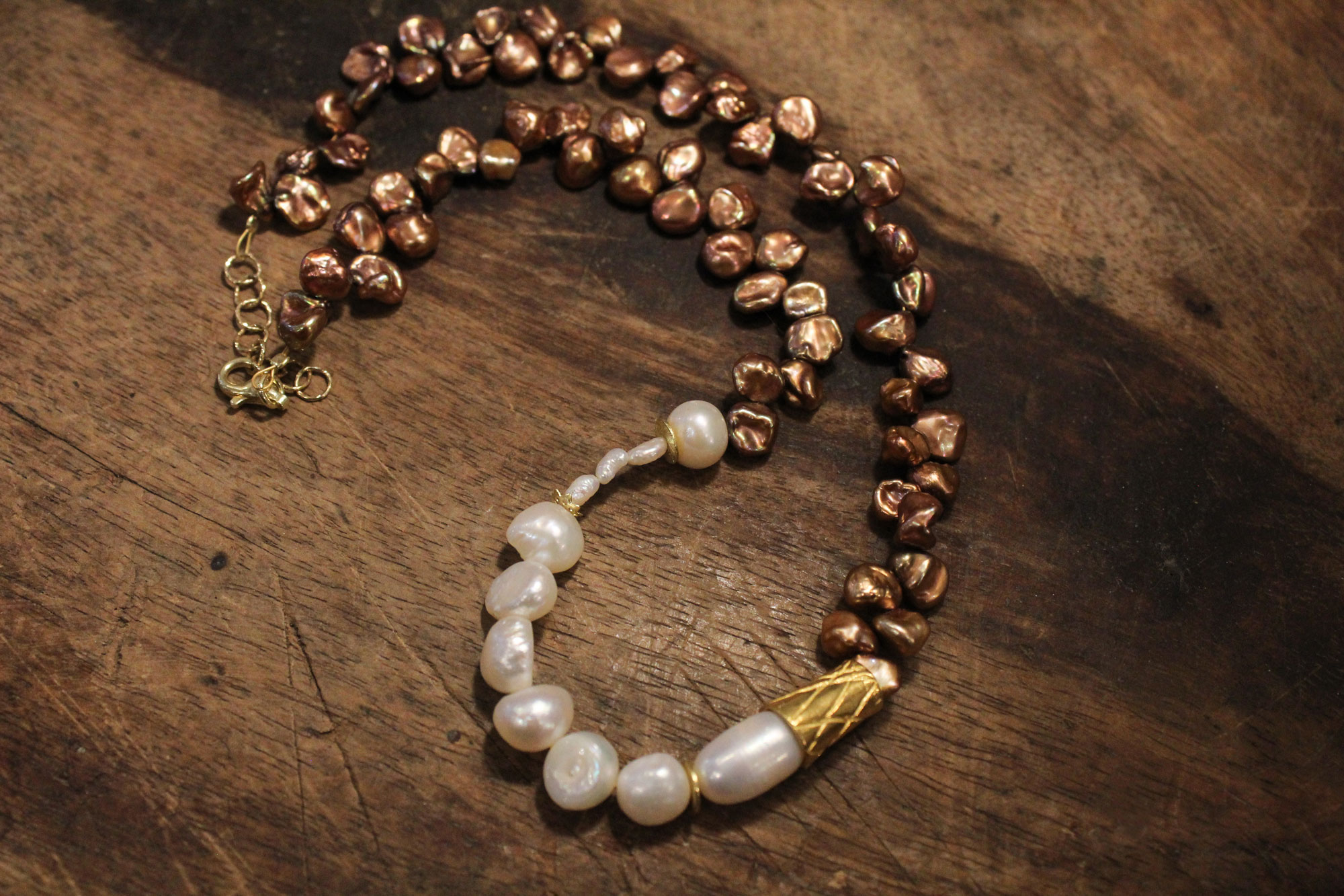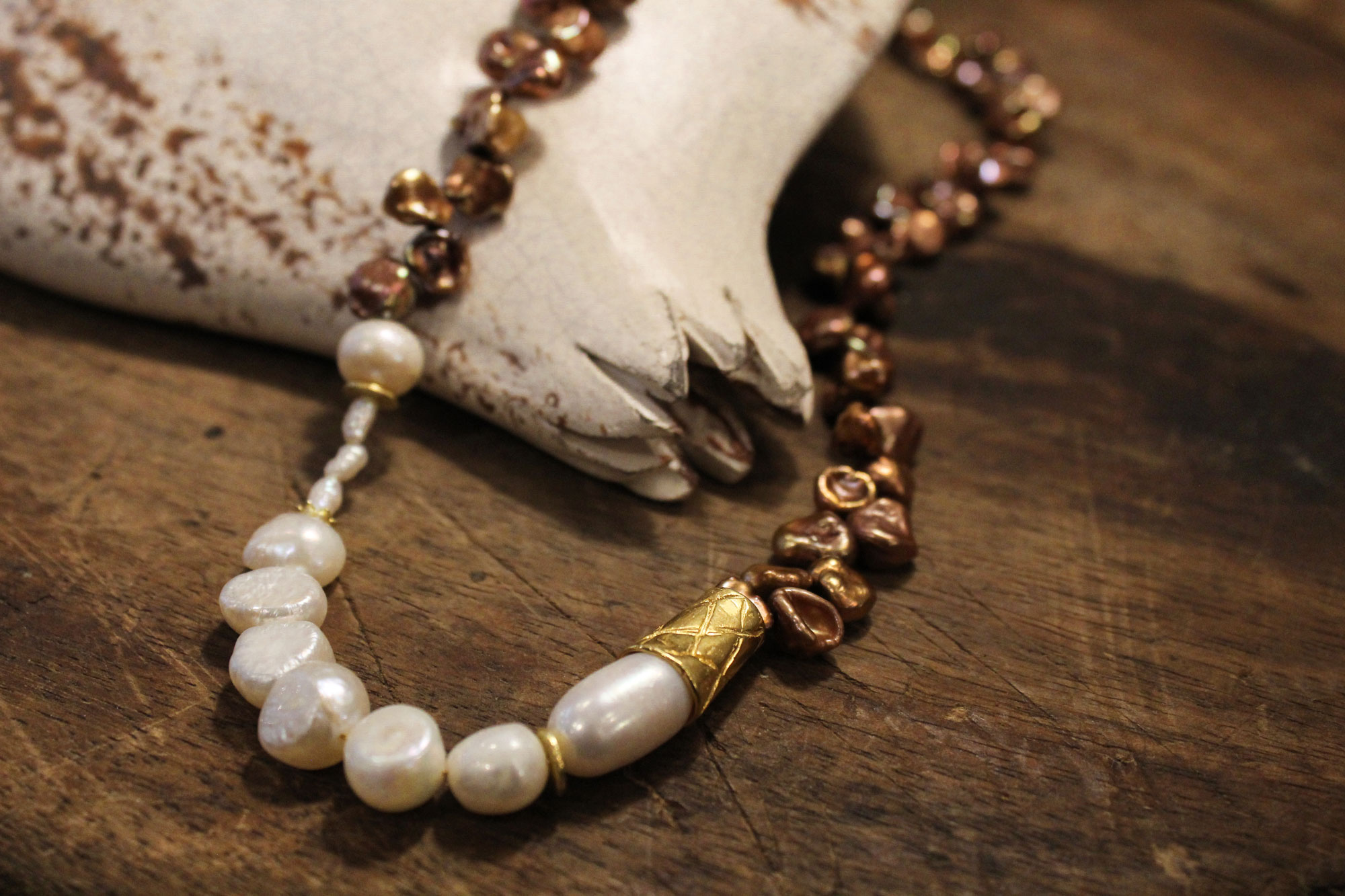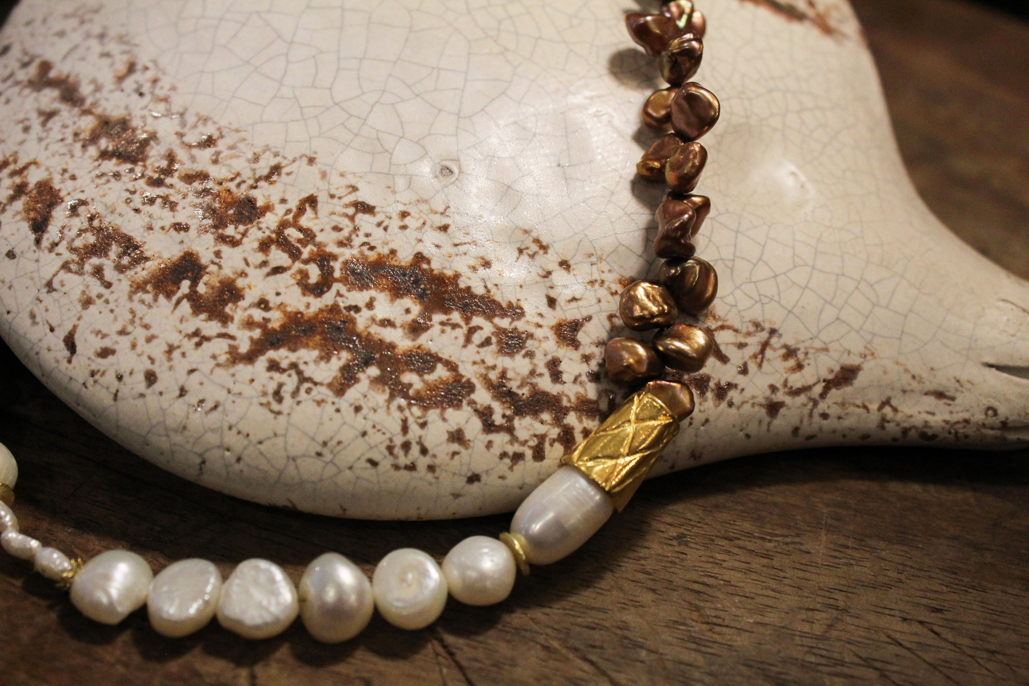 MIKA GRIVAKI χειροποίητο κολιέ με δύο ειδών μαργαριτάρια, Keshi και Καλλιέργειας γλυκού νερού δεμένα με ασήμι και επίχρυσα στοιχεία!