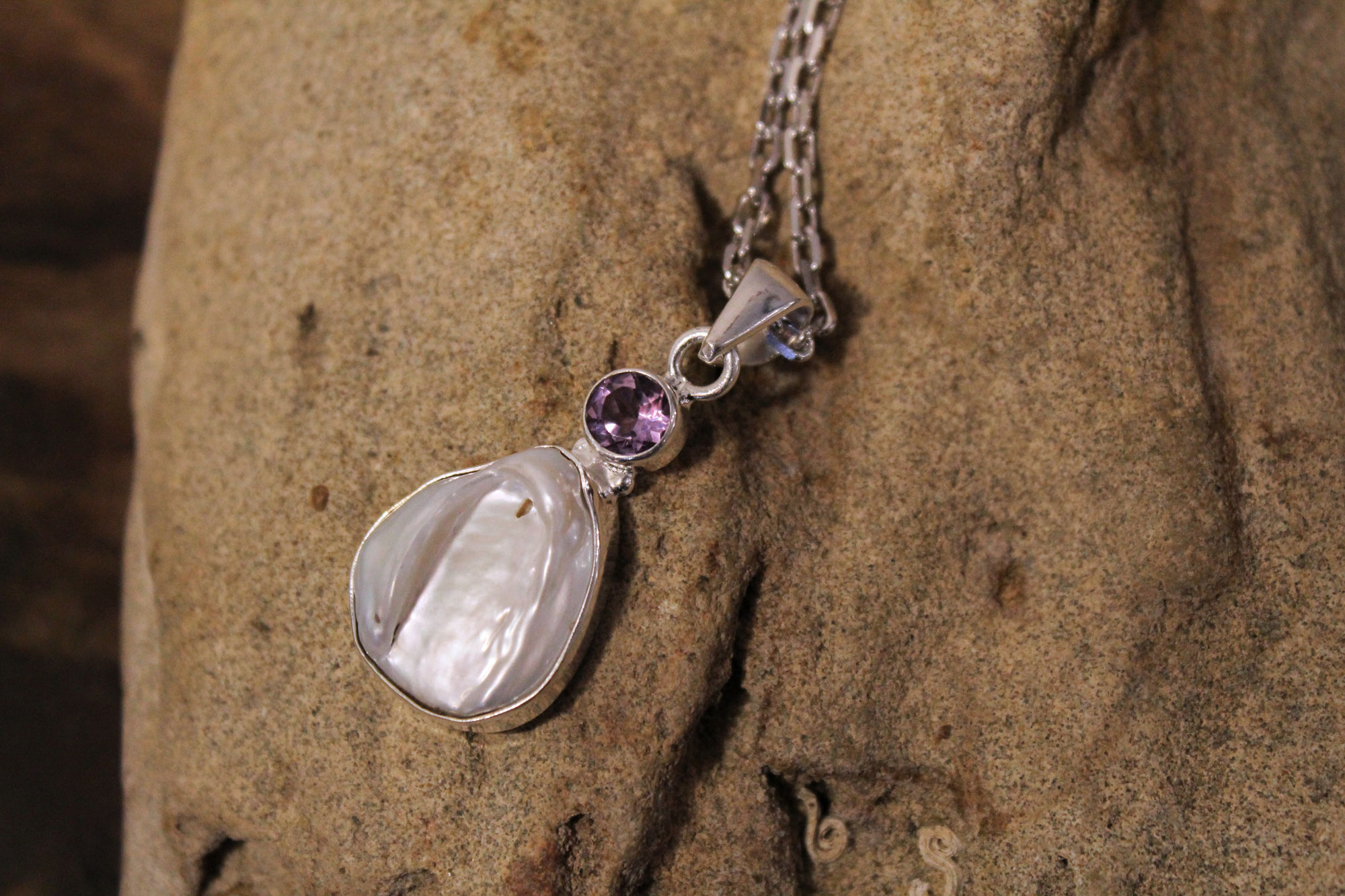 Ασημένιο μενταγιόν εισαγωγής με μοναδικό μεγάλο μαργαριτάρι baroque και μικρό ταγιέ πέτρωμα αμέθυστου στο επάνω μέρος.