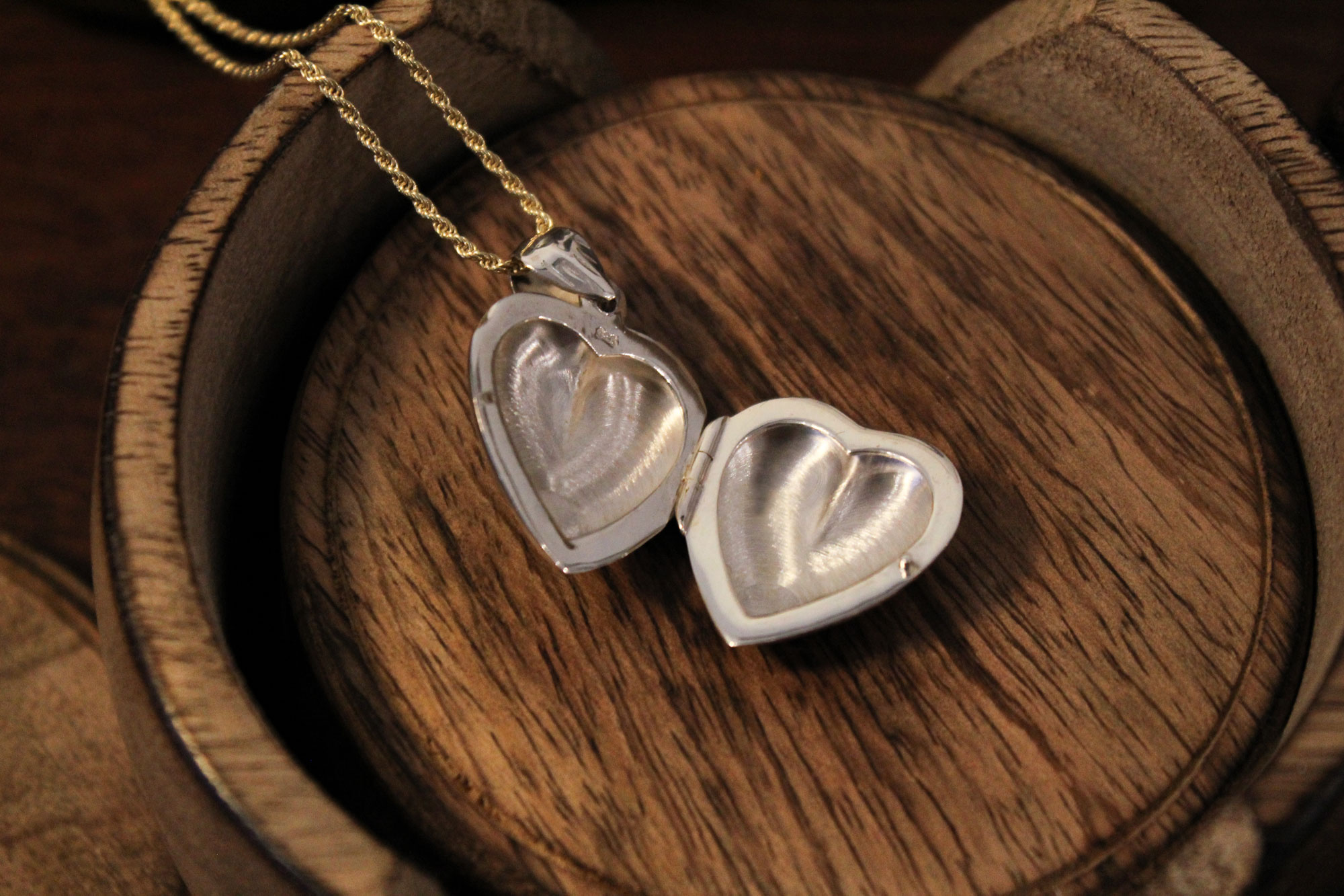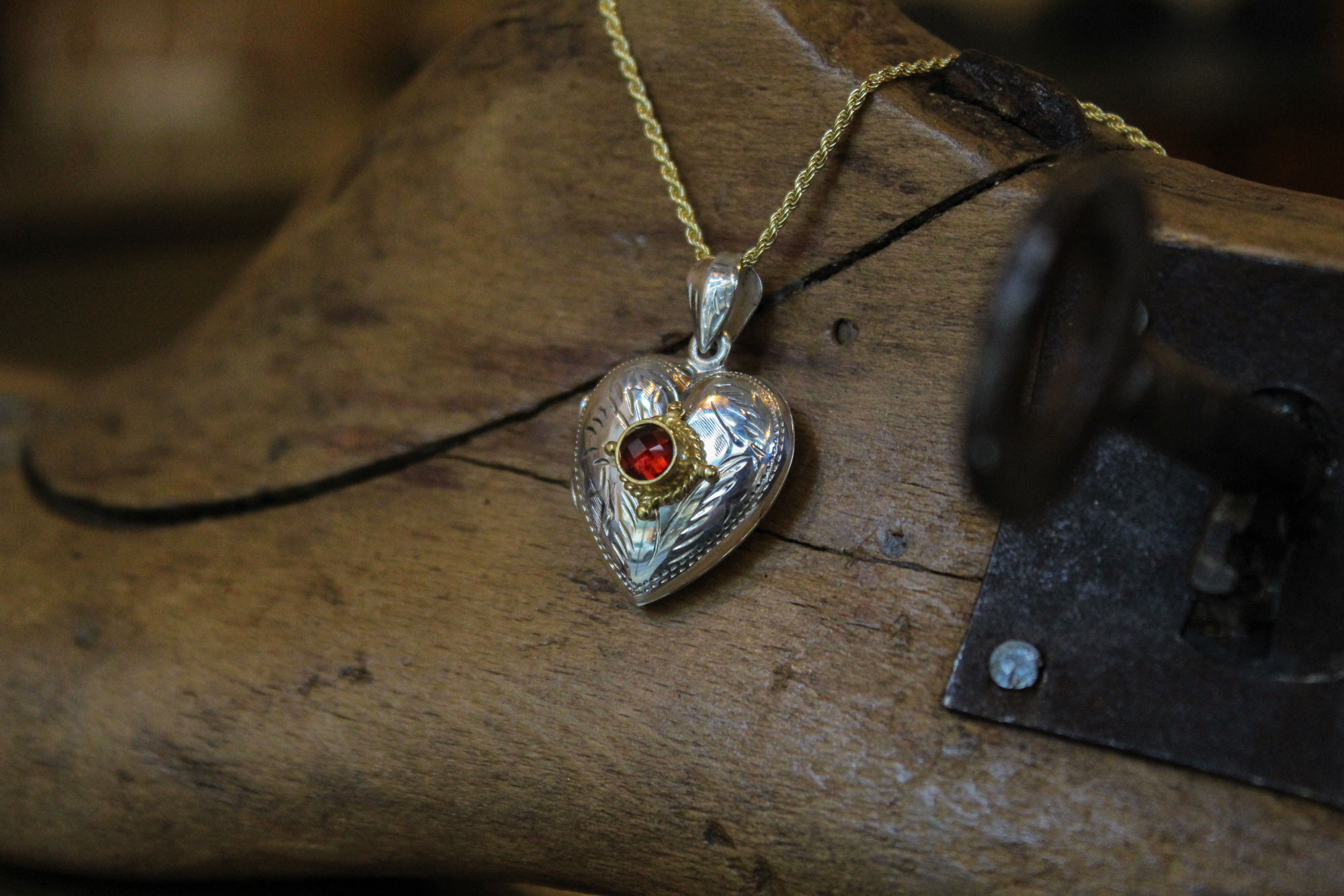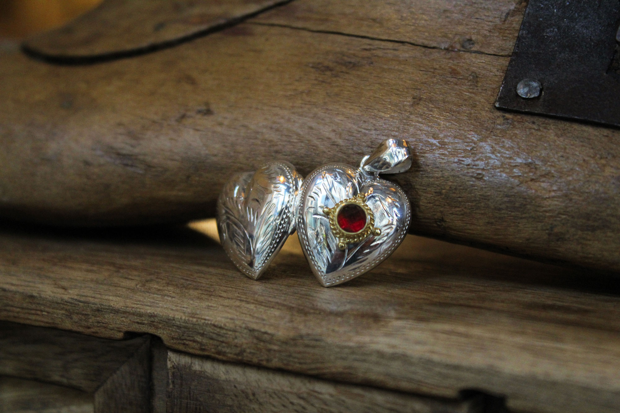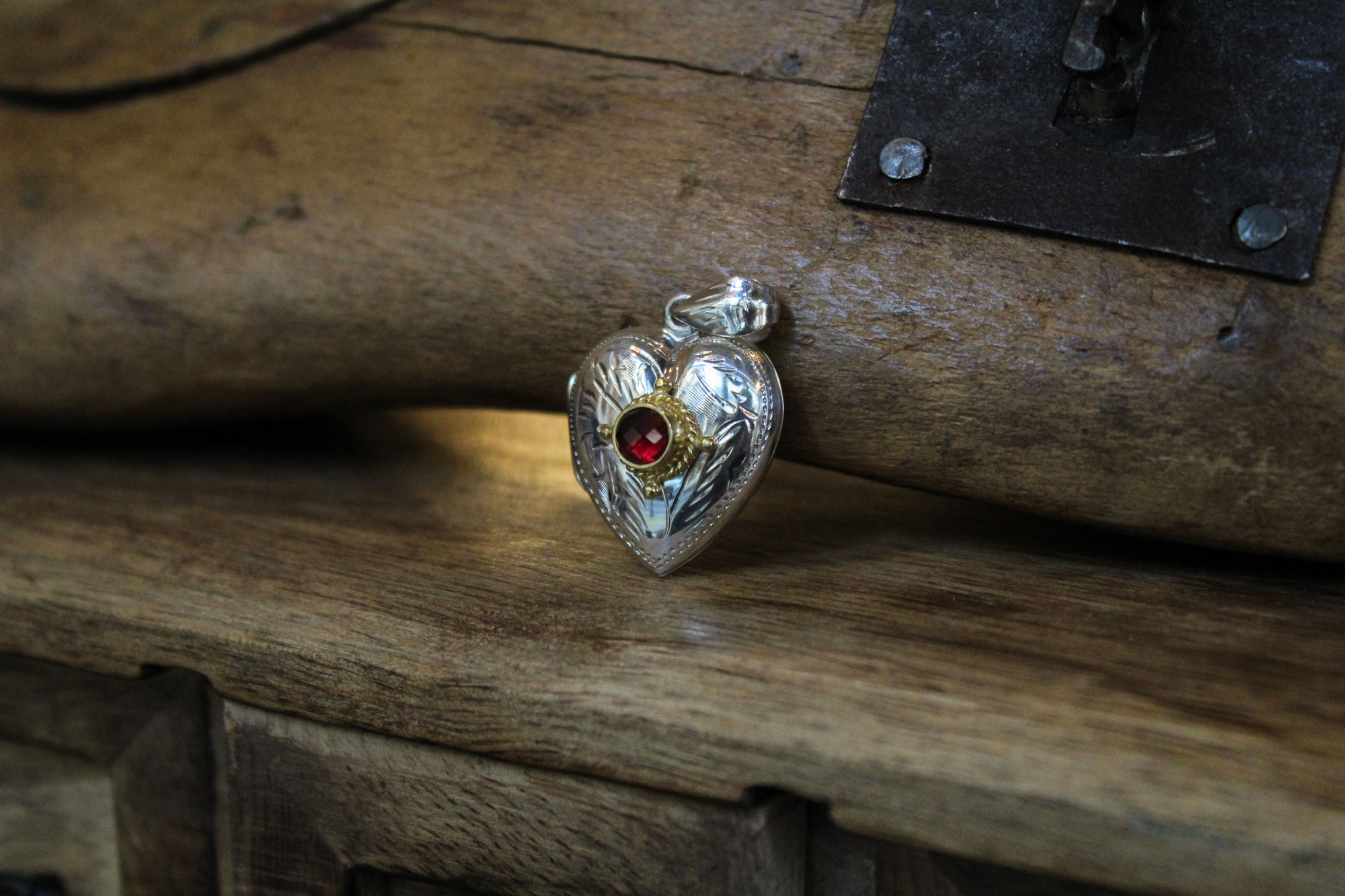 SAVATI JEWELRY χειροποίητο ανοιγόμενο μενταγιόν σε σχήμα καρδιάς κατασκευασμένο από ασήμι με εγχάρακτο σχεδιασμό και επίχρυσα μέρη. Κοσμείται από ταγιαρισμένο στρογγυλό πέτρωμα γρανάδας (4mm).