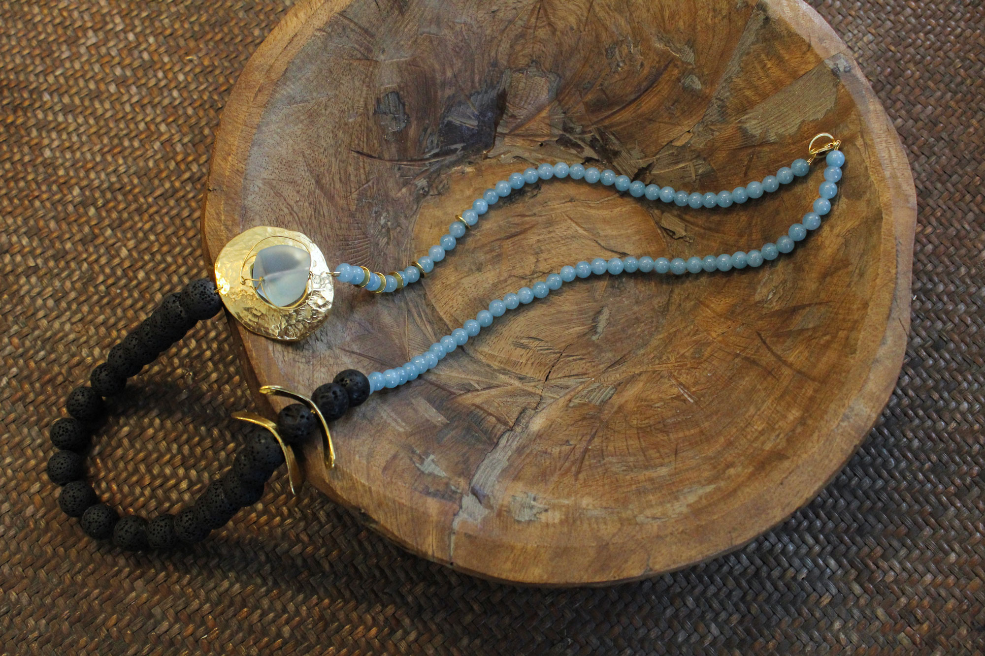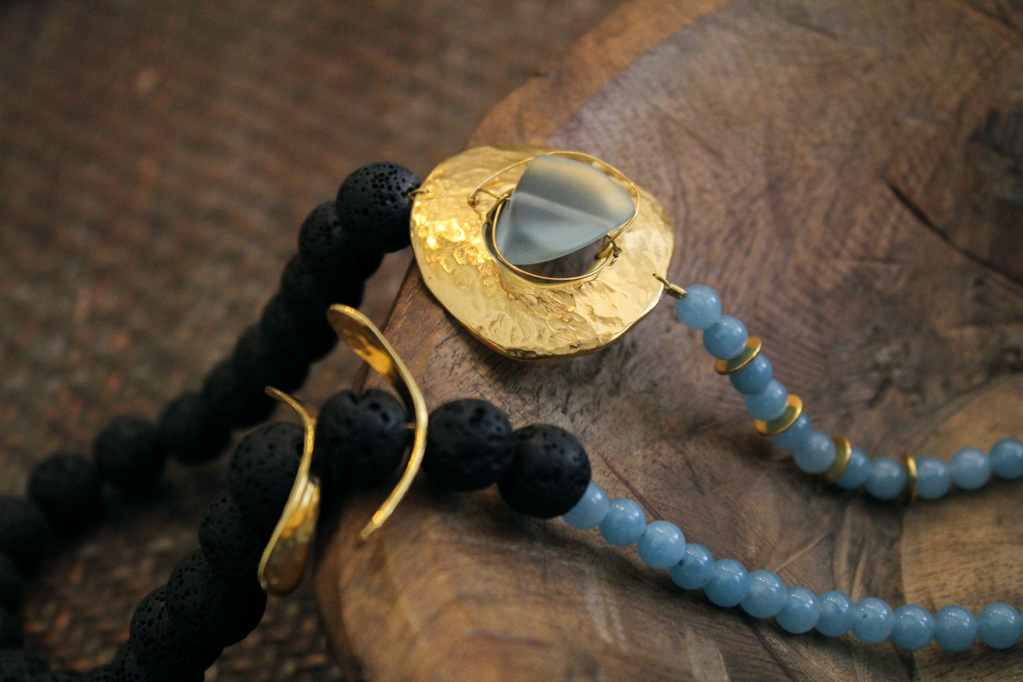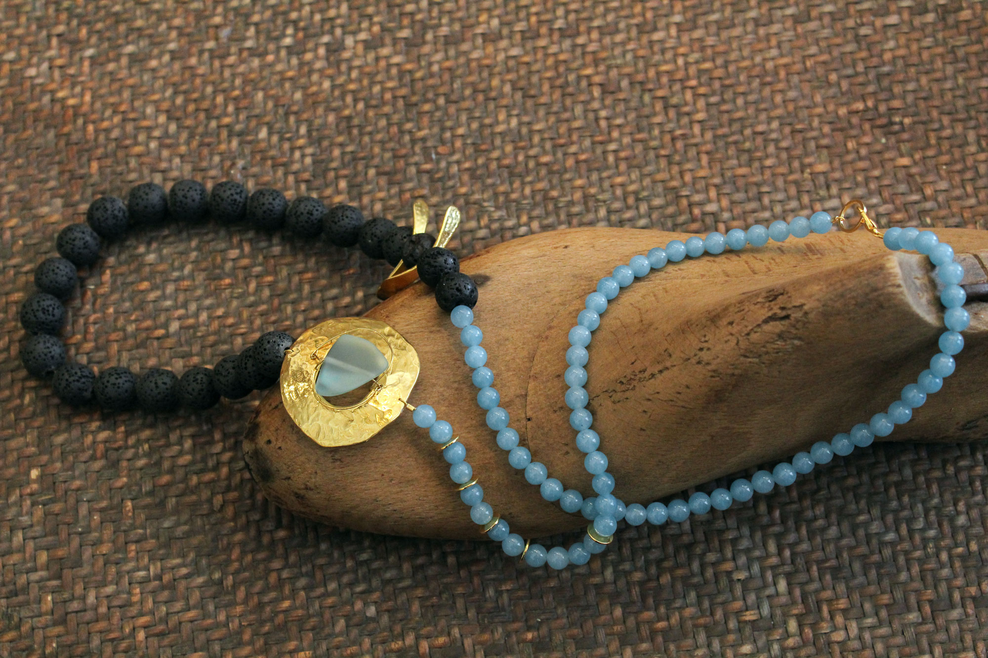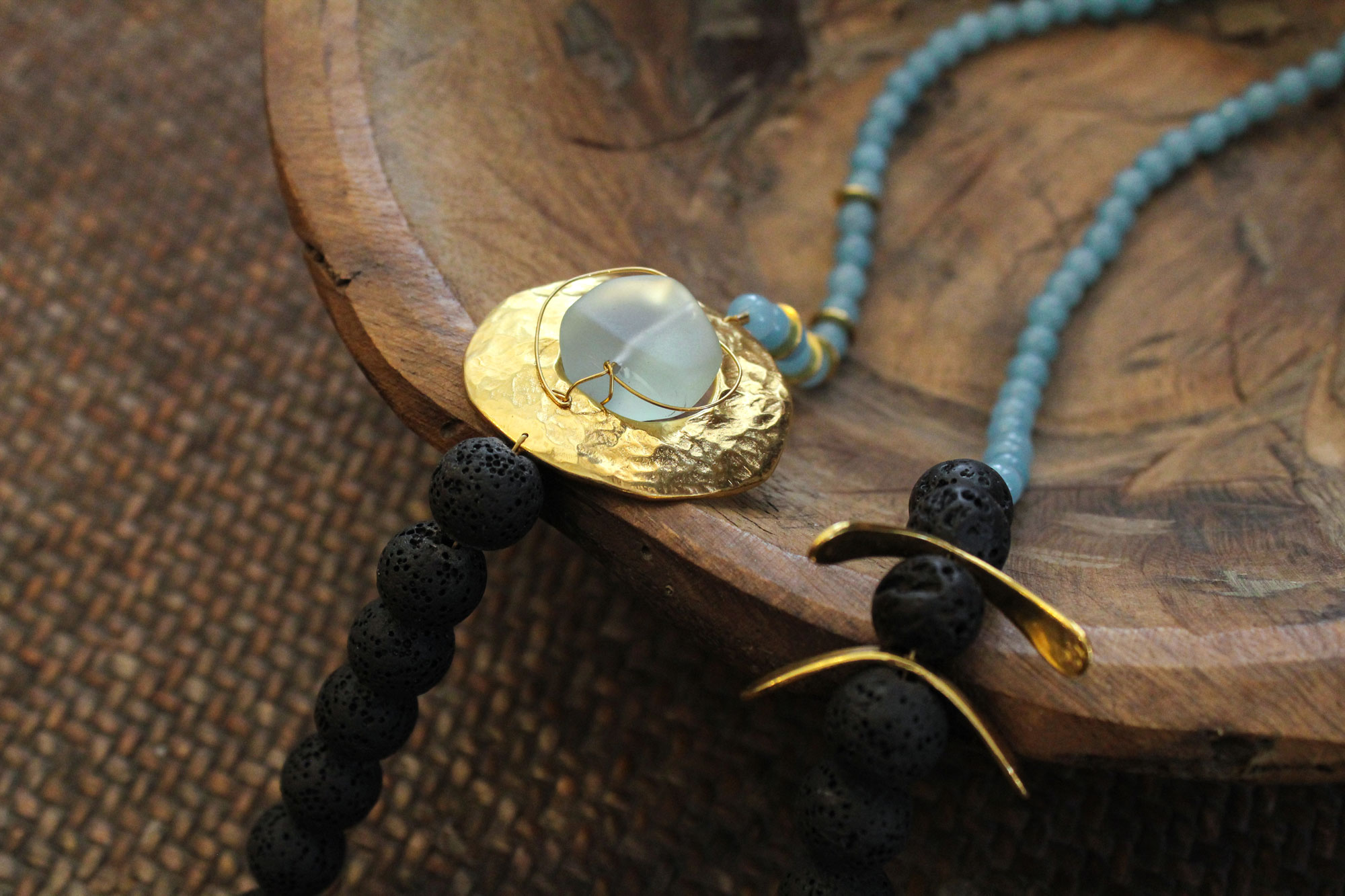 Χειροποίητο μακρύ κολιέ κατασκευασμένο από επιχρυσωμένο ορείχαλκο, πετρώματα από γαλάζιο Jade και μαύρη ηφαιστειακή λάβα.