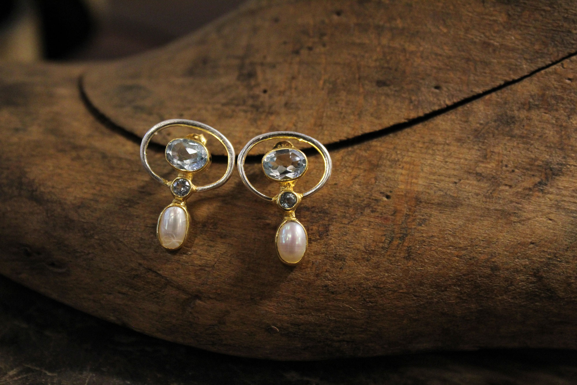 Χειροποίητα σκουλαρίκια κατασκευασμένα από ασήμι με επίχρυσα μέρη και υπέροχο συνδυασμό πετρωμάτων. Στο επάνω μέρος κοσμούνται με ταγιέ πετρώματα Blue Topaz ενώ στο τελείωμά τους με μαργαριτάρια καλλιέργειας!