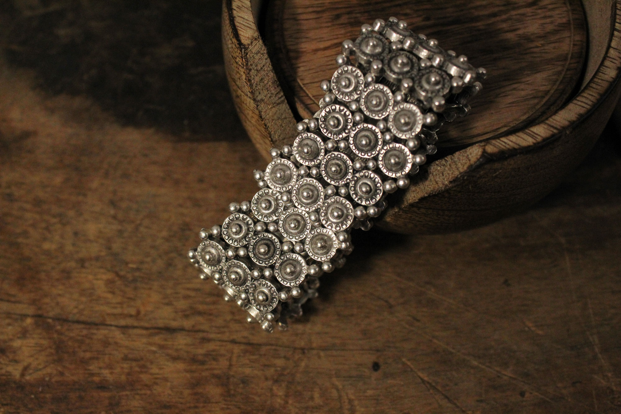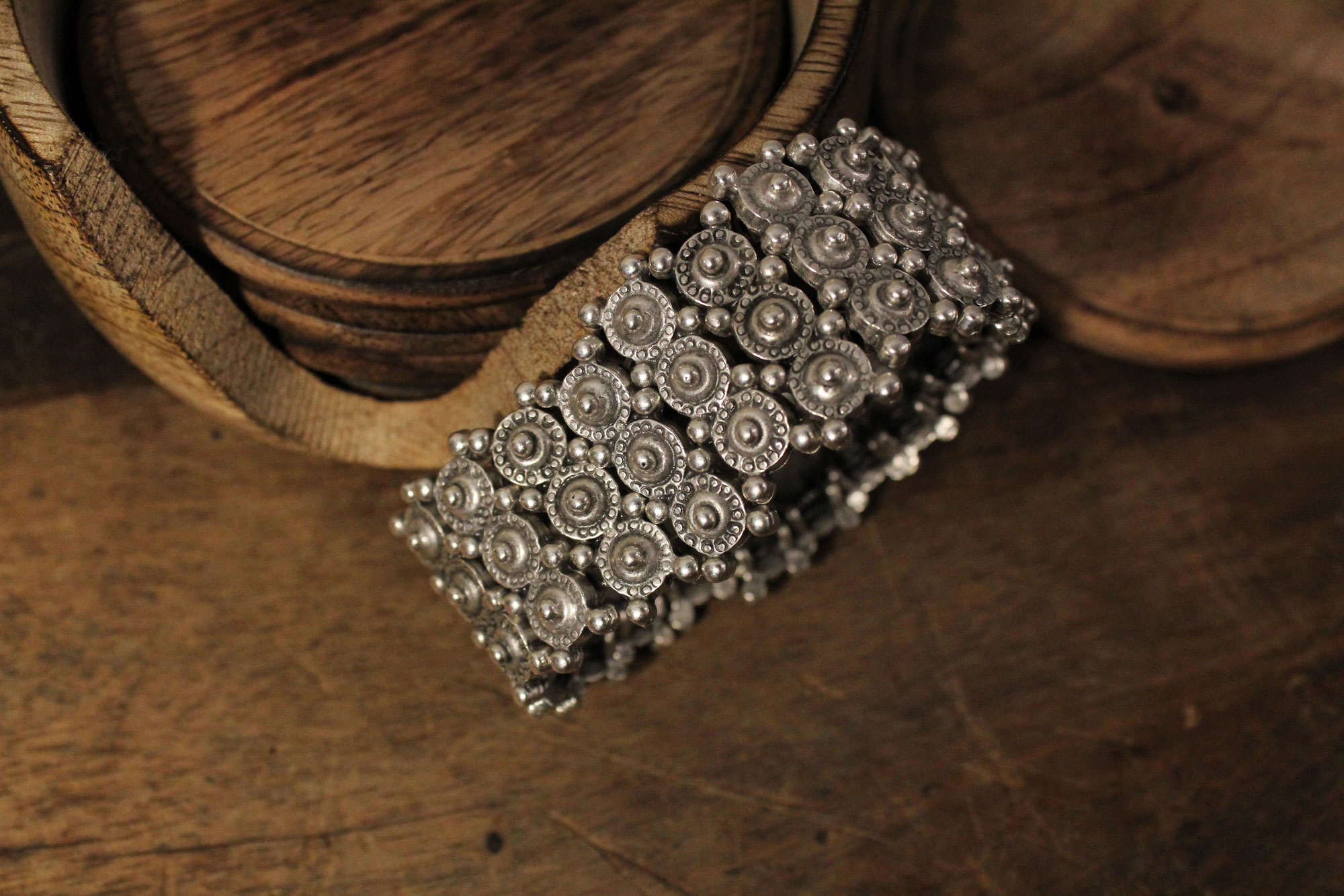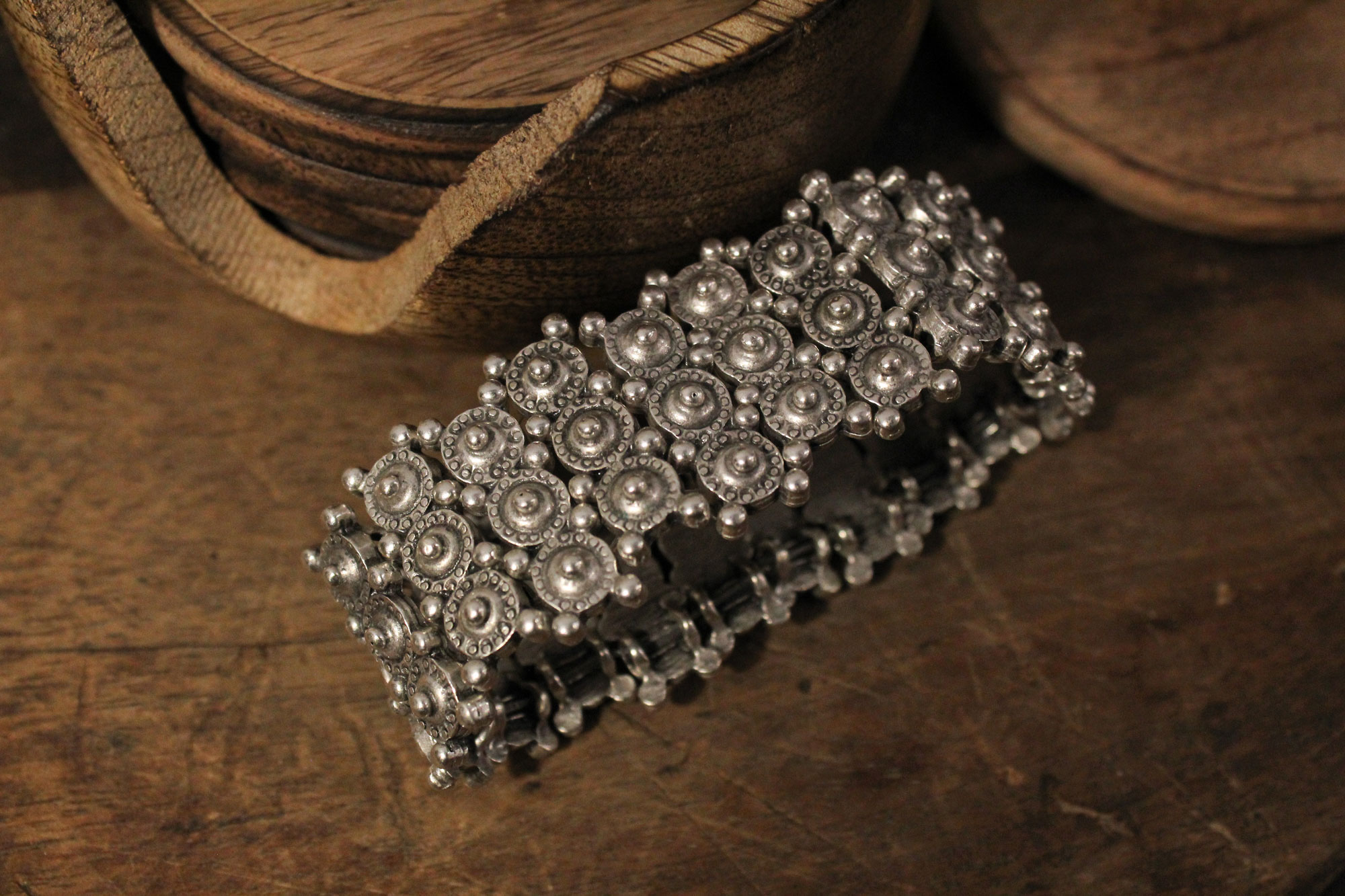 Χειροποίητο βραχιόλι εισαγωγής κατασκευασμένο από αλπακά με εντυπωσιακό ανάγλυφο σχεδιασμό. Είναι δεμένο στην εσωτερική του πλευρά με δύο “κλωστές” σιλικόνης οπότε διαθέτει αρκετή ελαστικότητα.