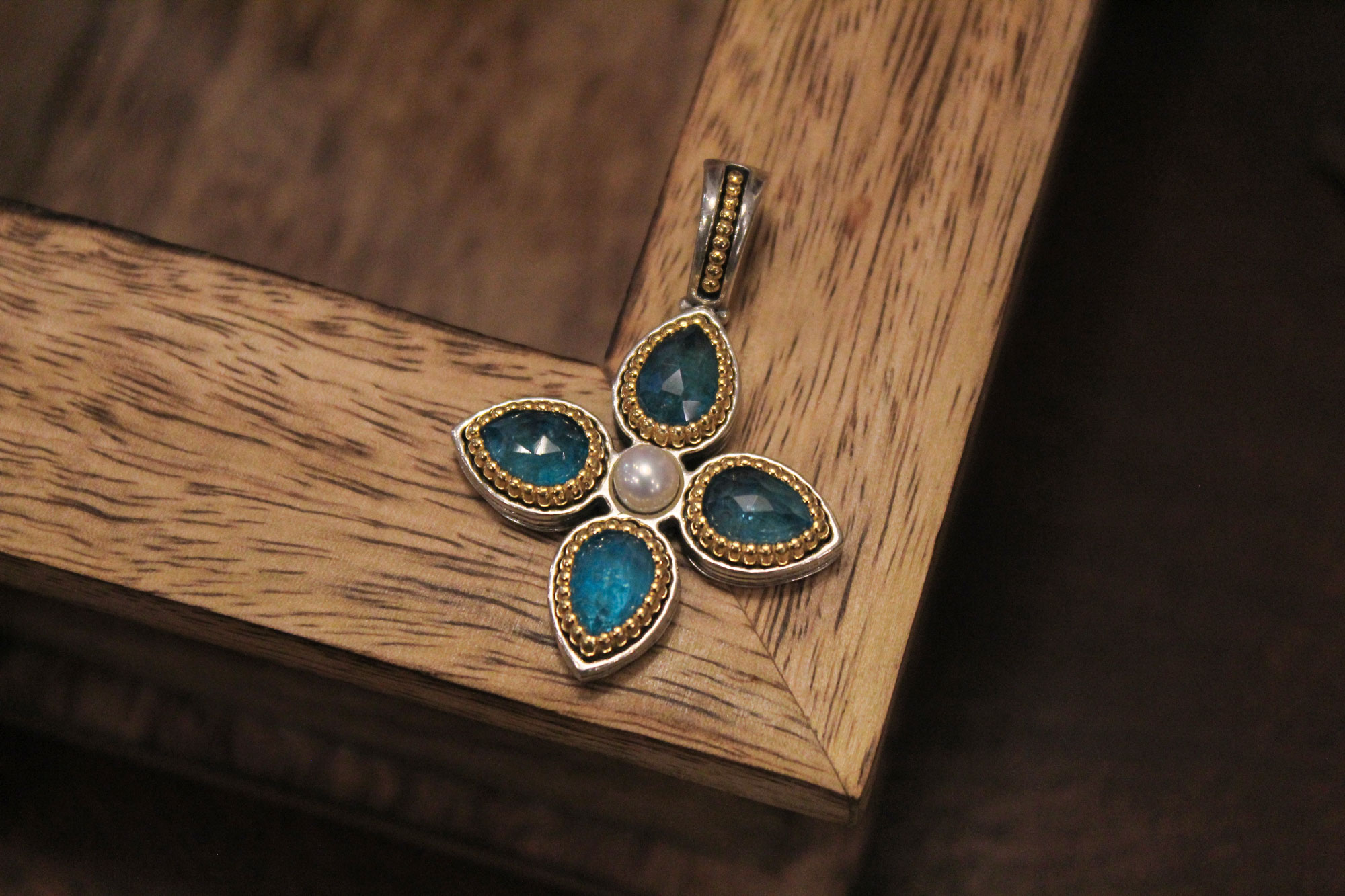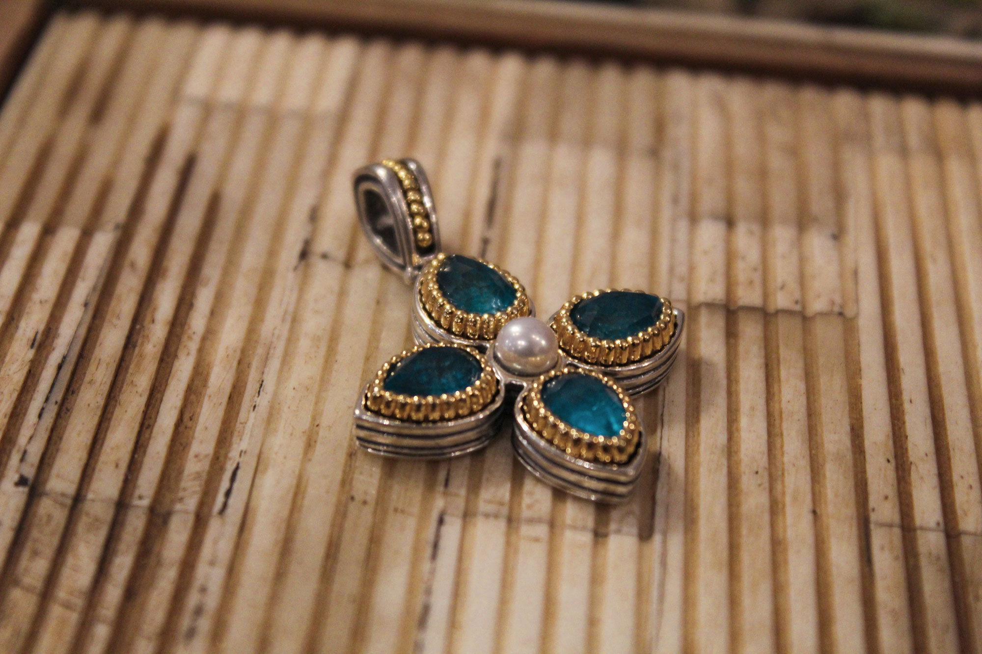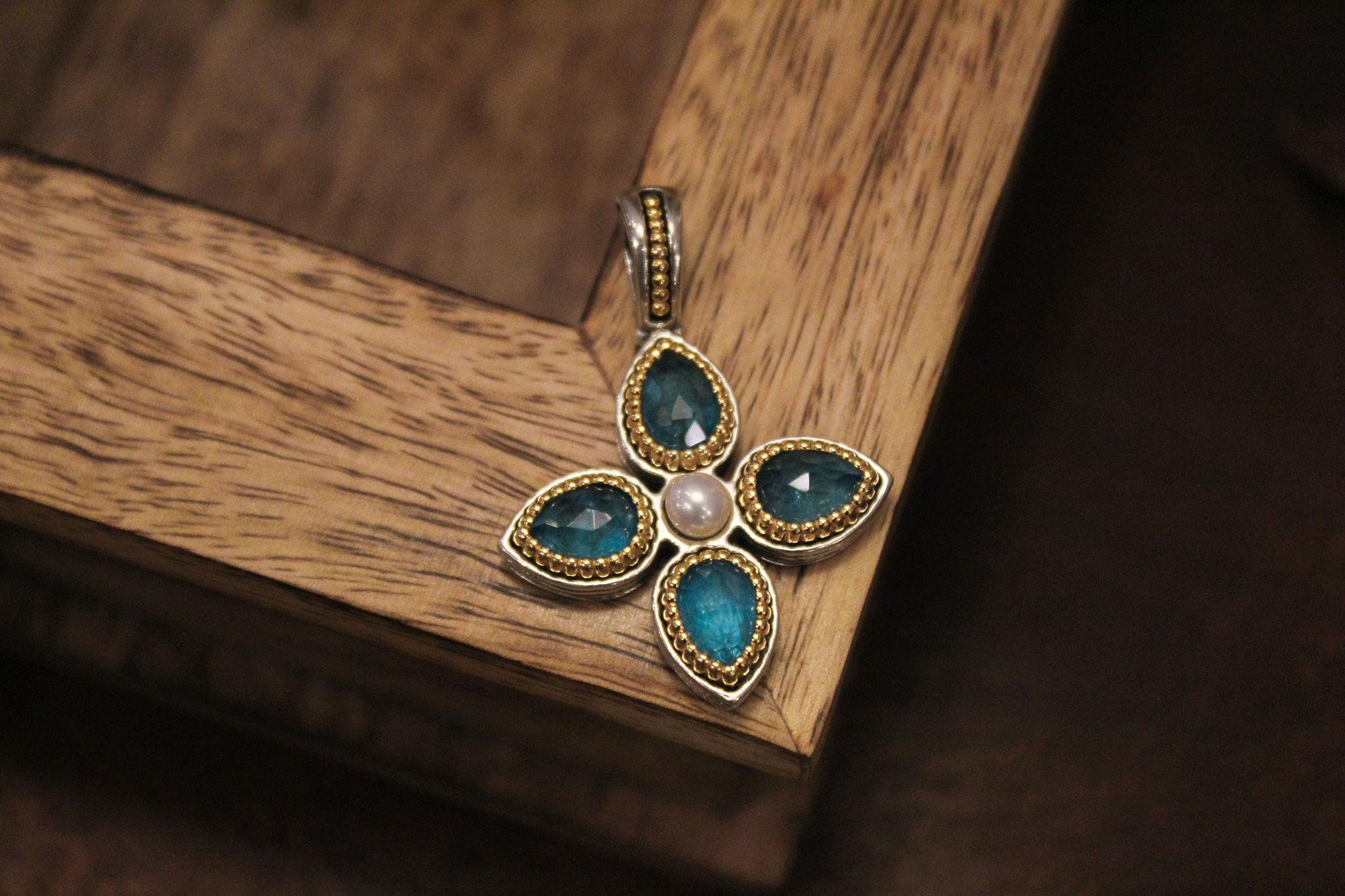 Laskaridis Jewelry χειροποίητος σταυρός μοναδικού σχεδιασμού κατασκευασμένος από ασήμι και επίχρυσα μέρη. Κοσμείται από ντουμπλέτες απατίτη και μαργαριτάρι καλλιέργειας στο κέντρο του.