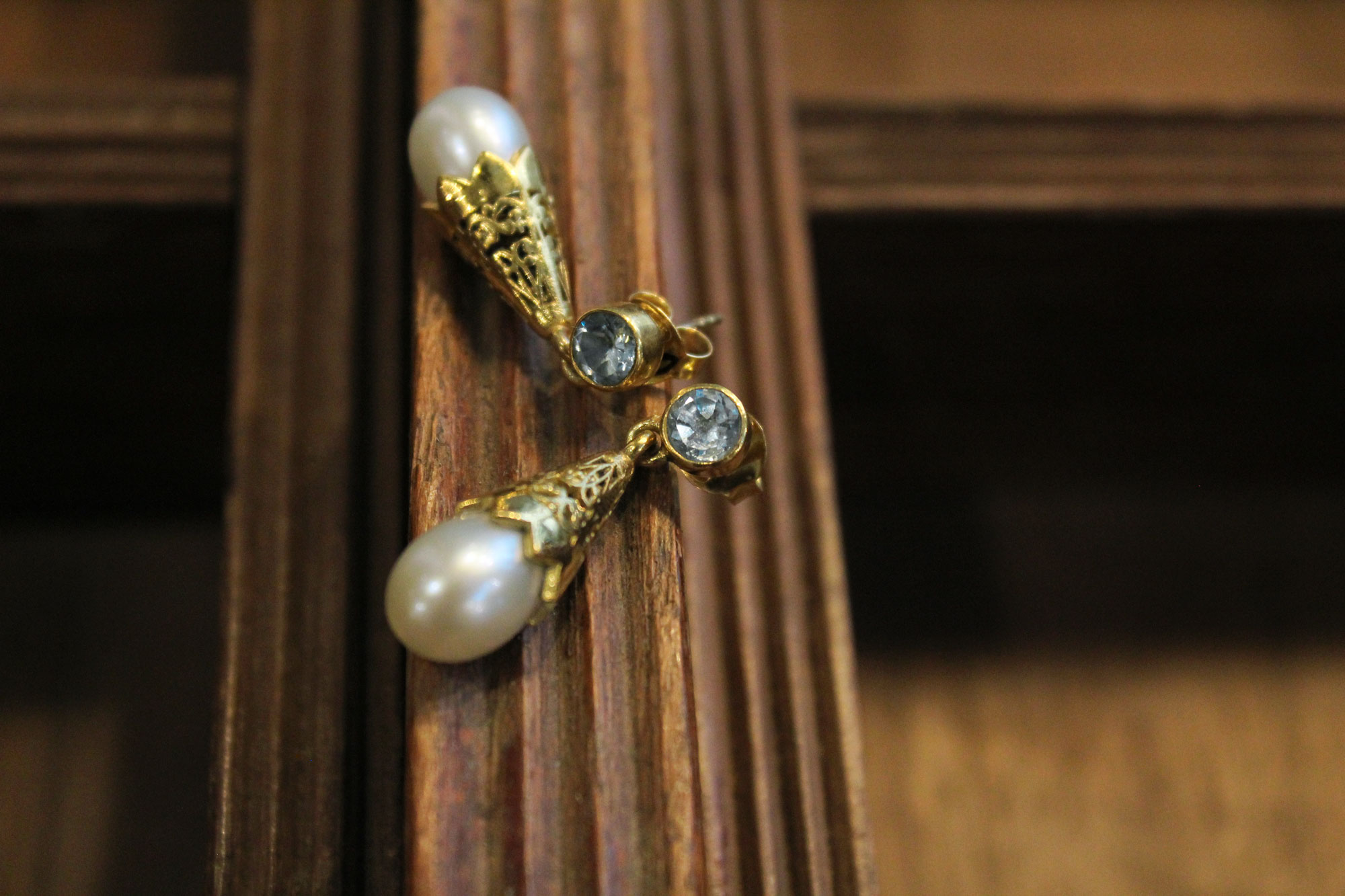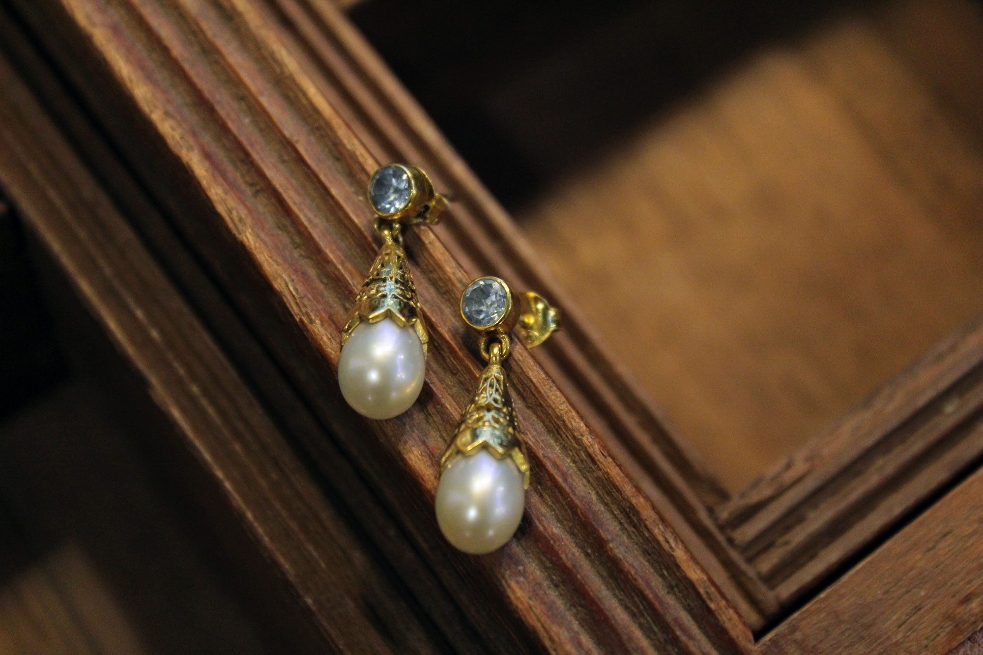 Μοναδικά, χειροποίητα σκουλαρίκια κατασκευασμένα από επιχρυσωμένο ασήμι με μαργαριτάρια και ταγιέ πετρώματα Blue Topaz.