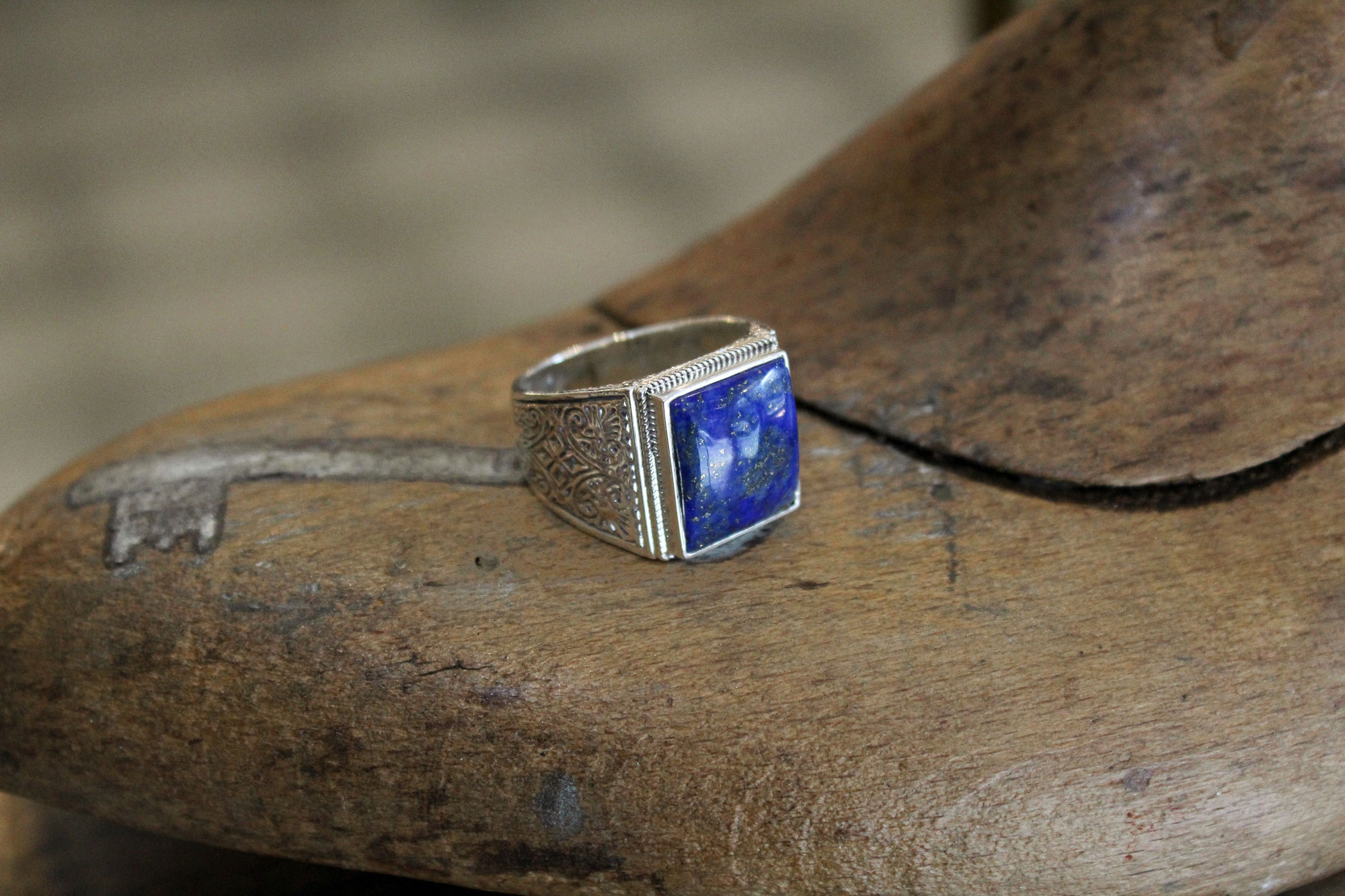 Gerochristo Jewelry χειροποίητο δαχτυλίδι κατασκευασμένο από ασήμι με εγχάρακτο σχεδιασμό στα πλαϊνά και πέτρωμα Lapis Lazuli.