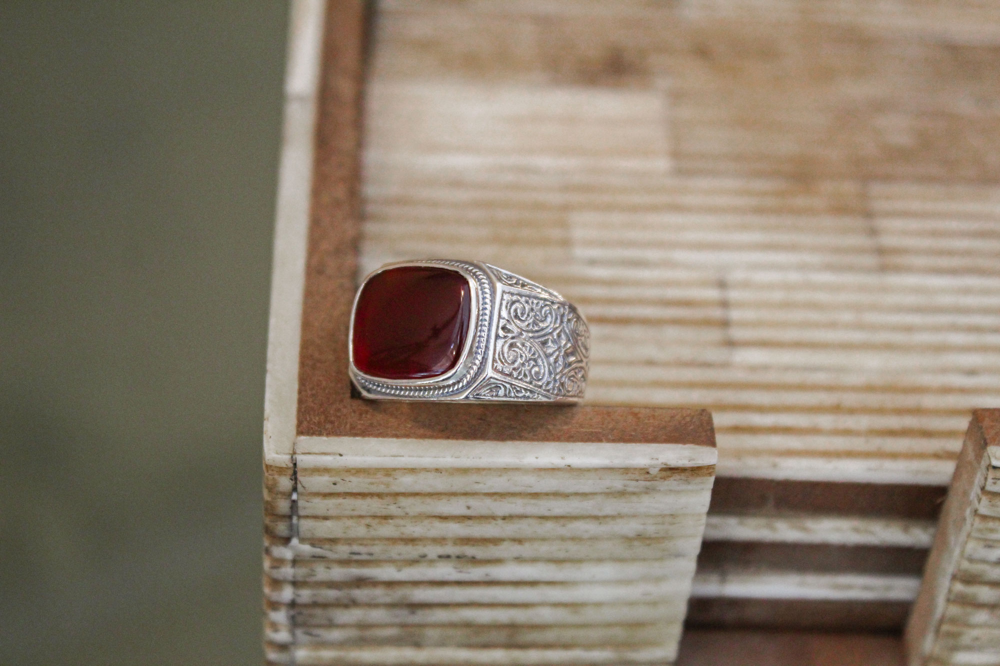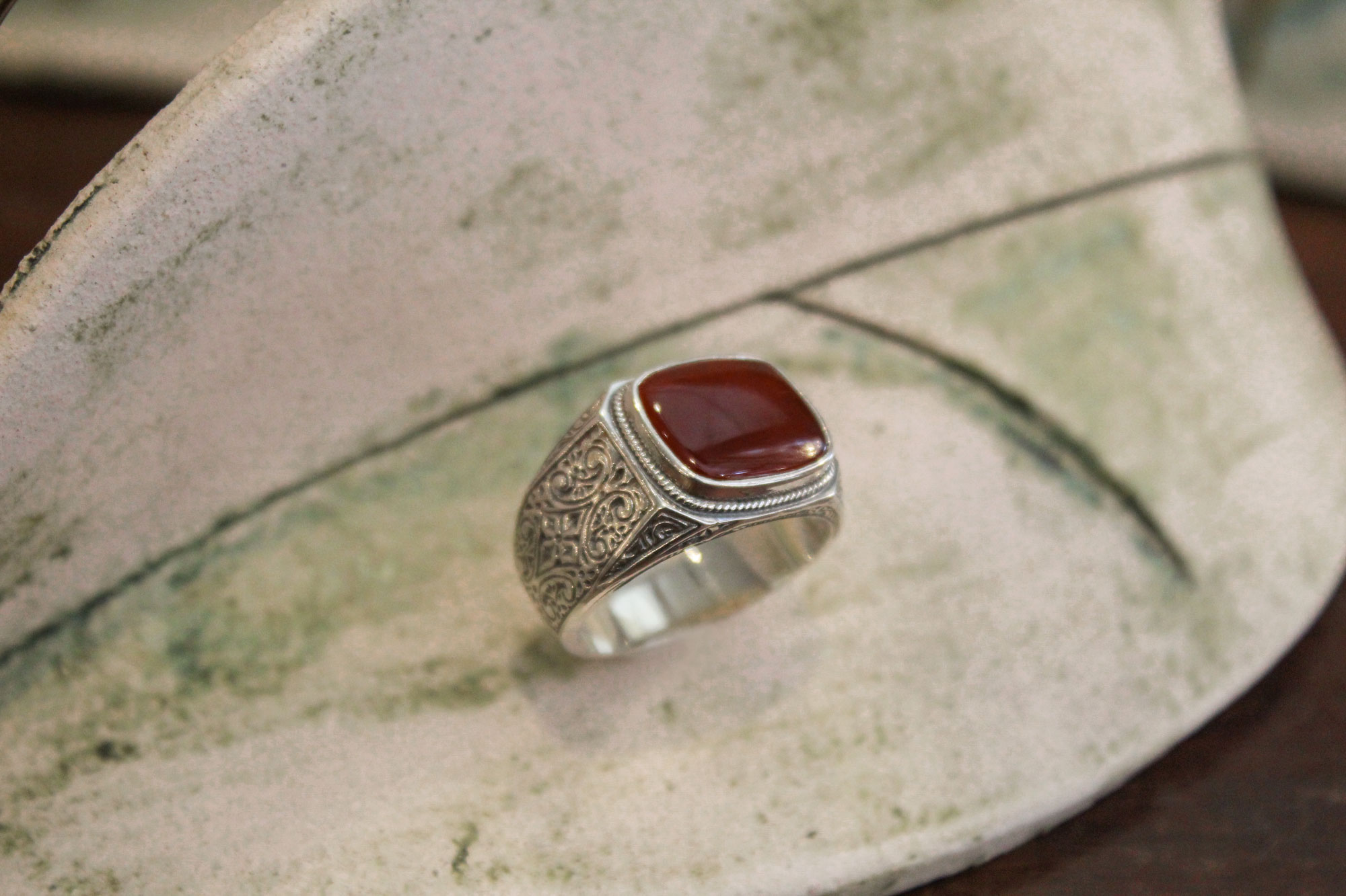Gerochristo Jewelry χειροποίητο δαχτυλίδι κατασκευασμένο από ασήμι με εγχάρακτο σχεδιασμό και πέτρωμα από κορνεόλη.