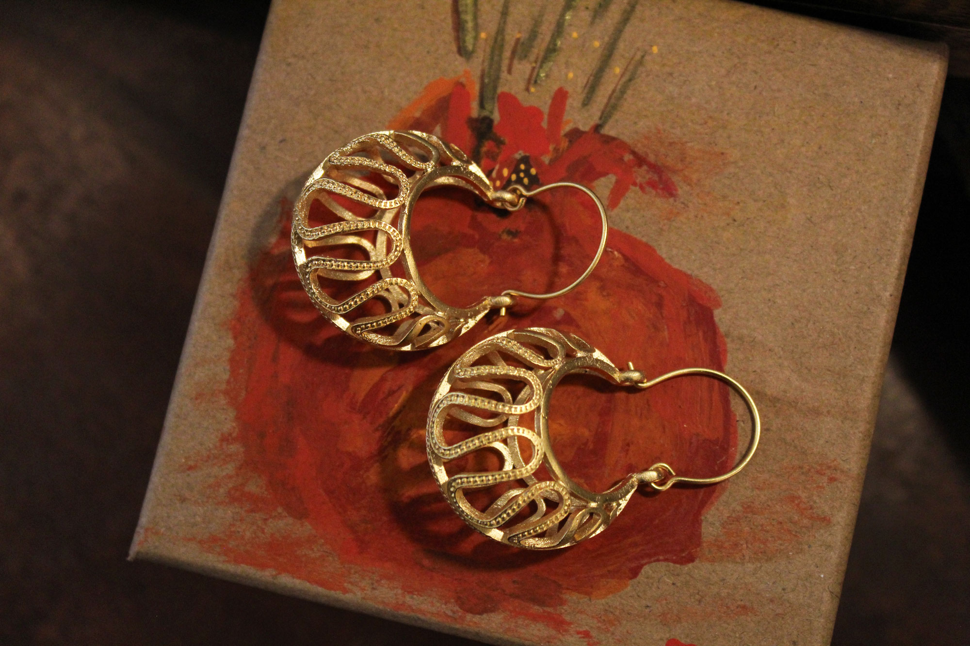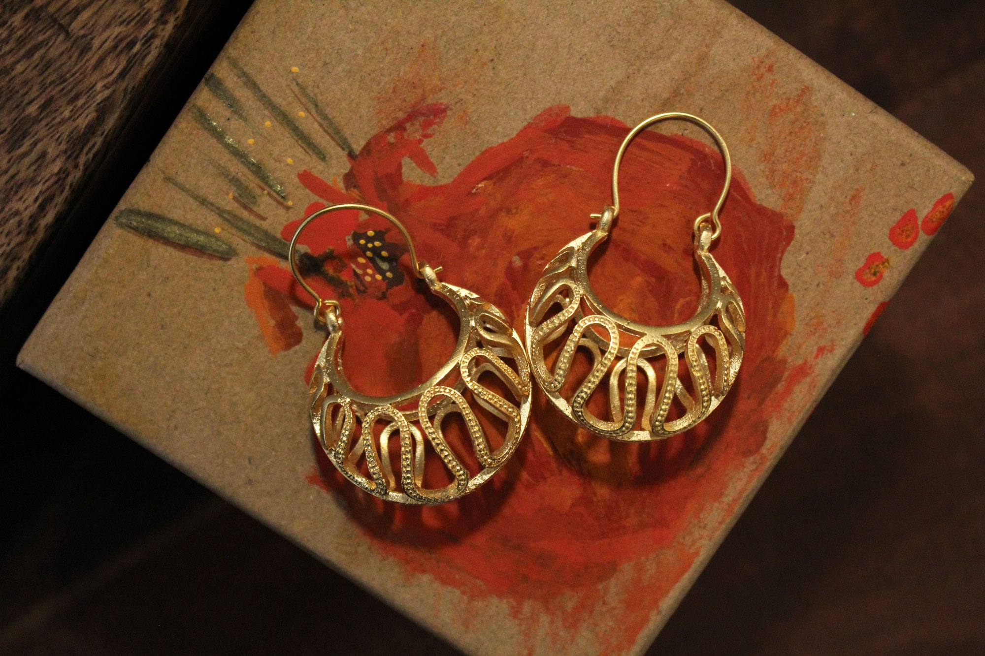 Σκουλαρίκια εισαγωγής κατασκευασμένα από επιχρυσωμένο αλπακά με εντυπωσιακό διάτρητο σχεδιασμό!
