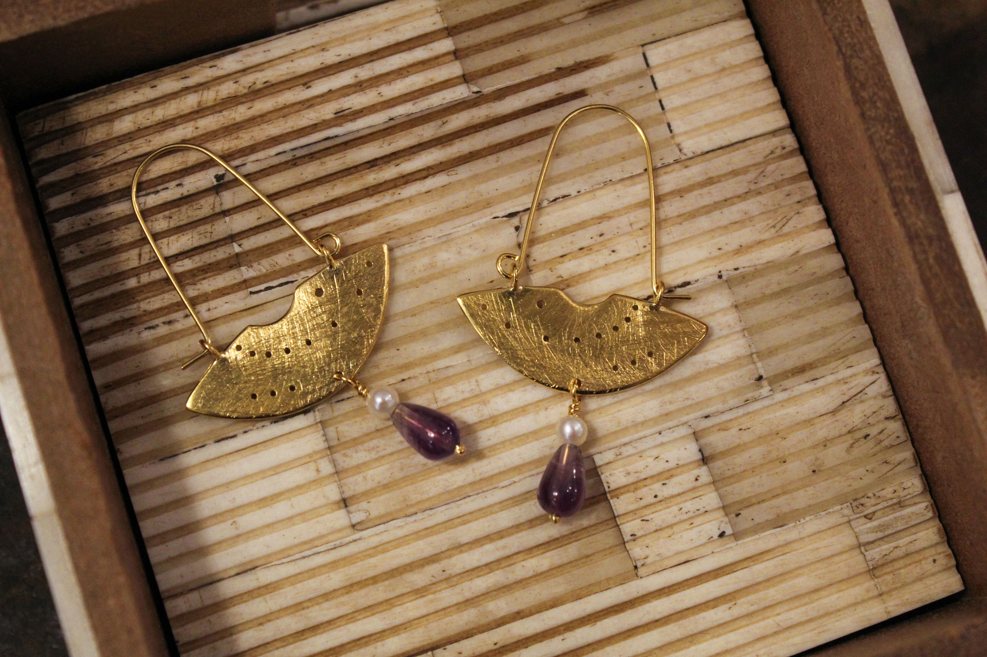 CHRYSOULA SOFOU χειροποίητα σκουλαρίκια κατασκευασμένα από επιχρυσωμένο ασήμι με μοναδικό συνδυασμό πετρωμάτων από μαργαριτάρια καλλιέργειας και σταγόνες αμέθυστου!