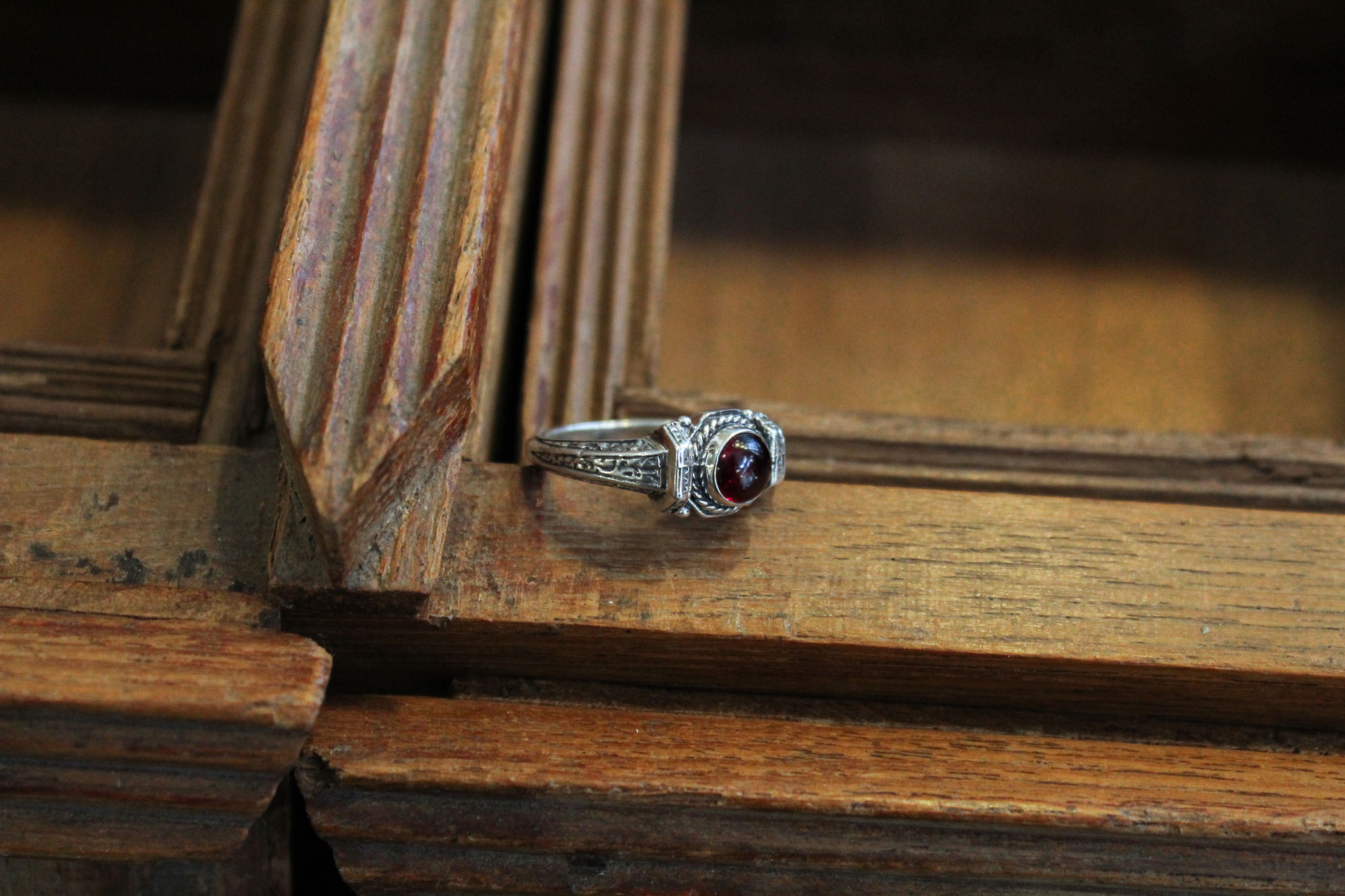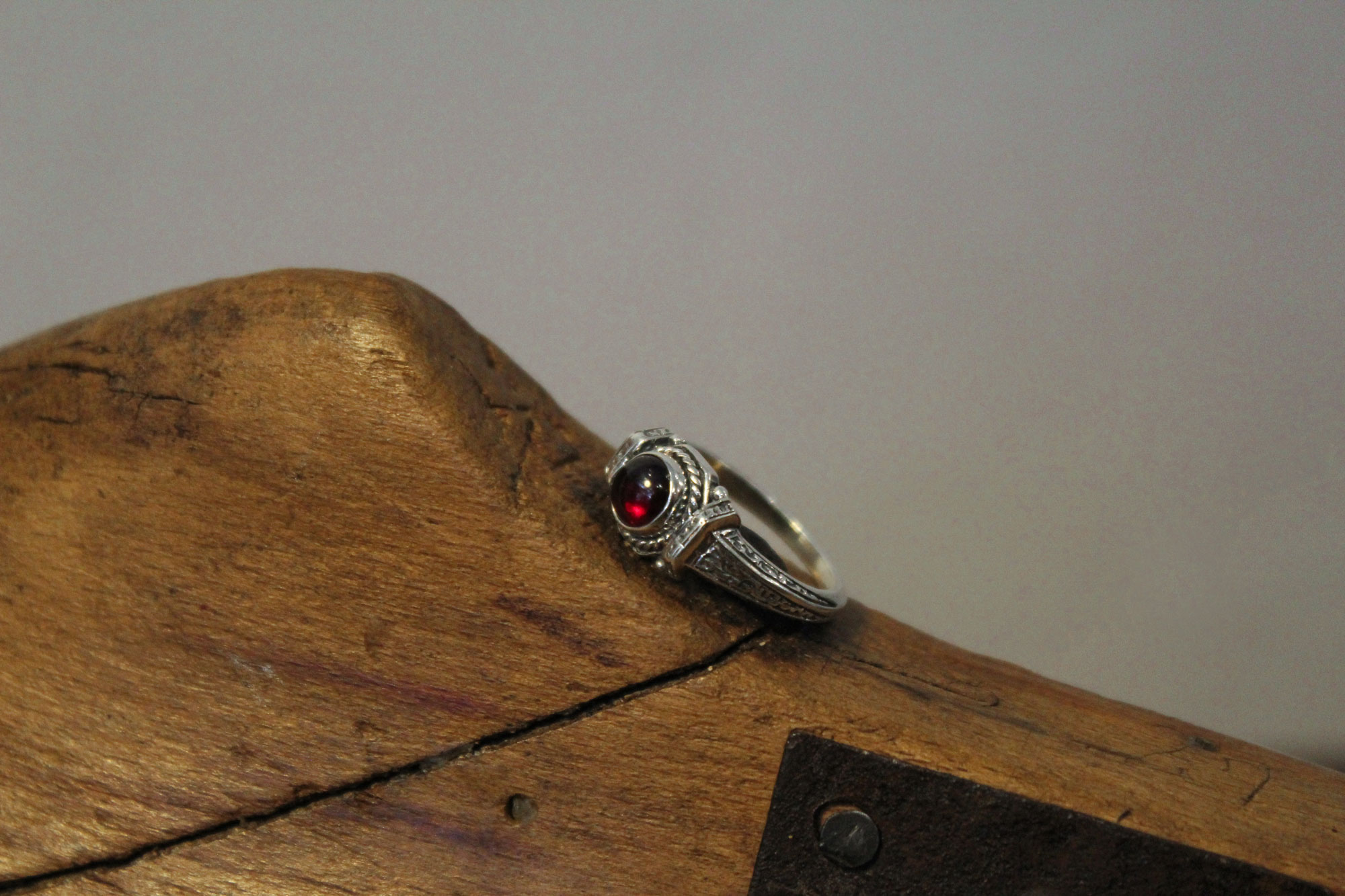 SAVATI χειροποίητο δαχτυλίδι κατασκευασμένο από ασήμι με ανάγλυφα, εγχάρακτα σχέδια και στρογγυλό πέτρωμα γρανάδας (6mm).