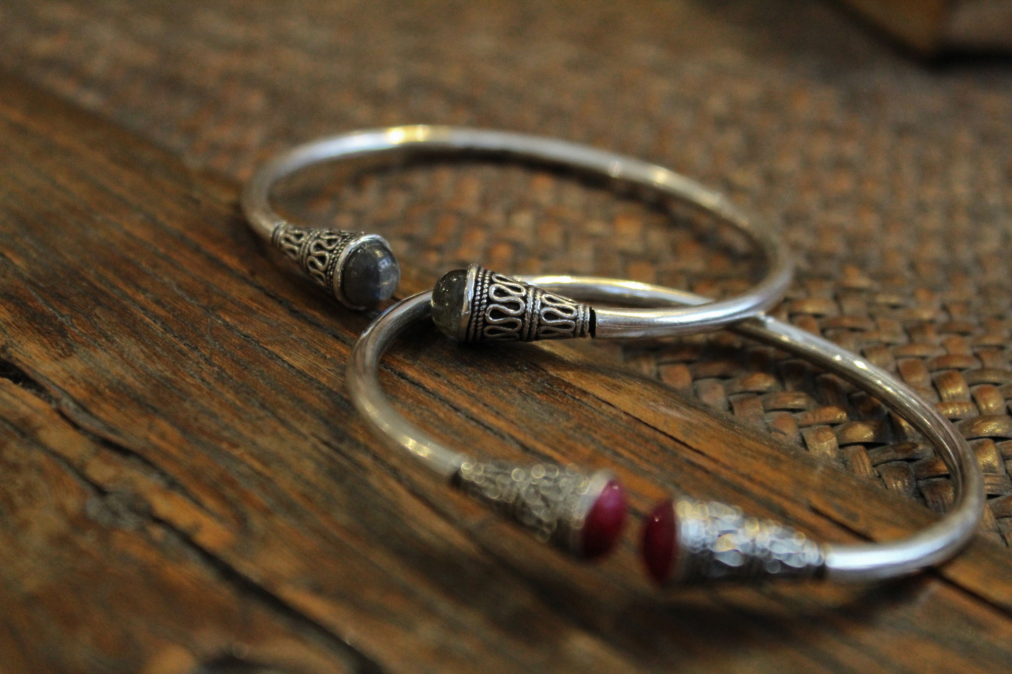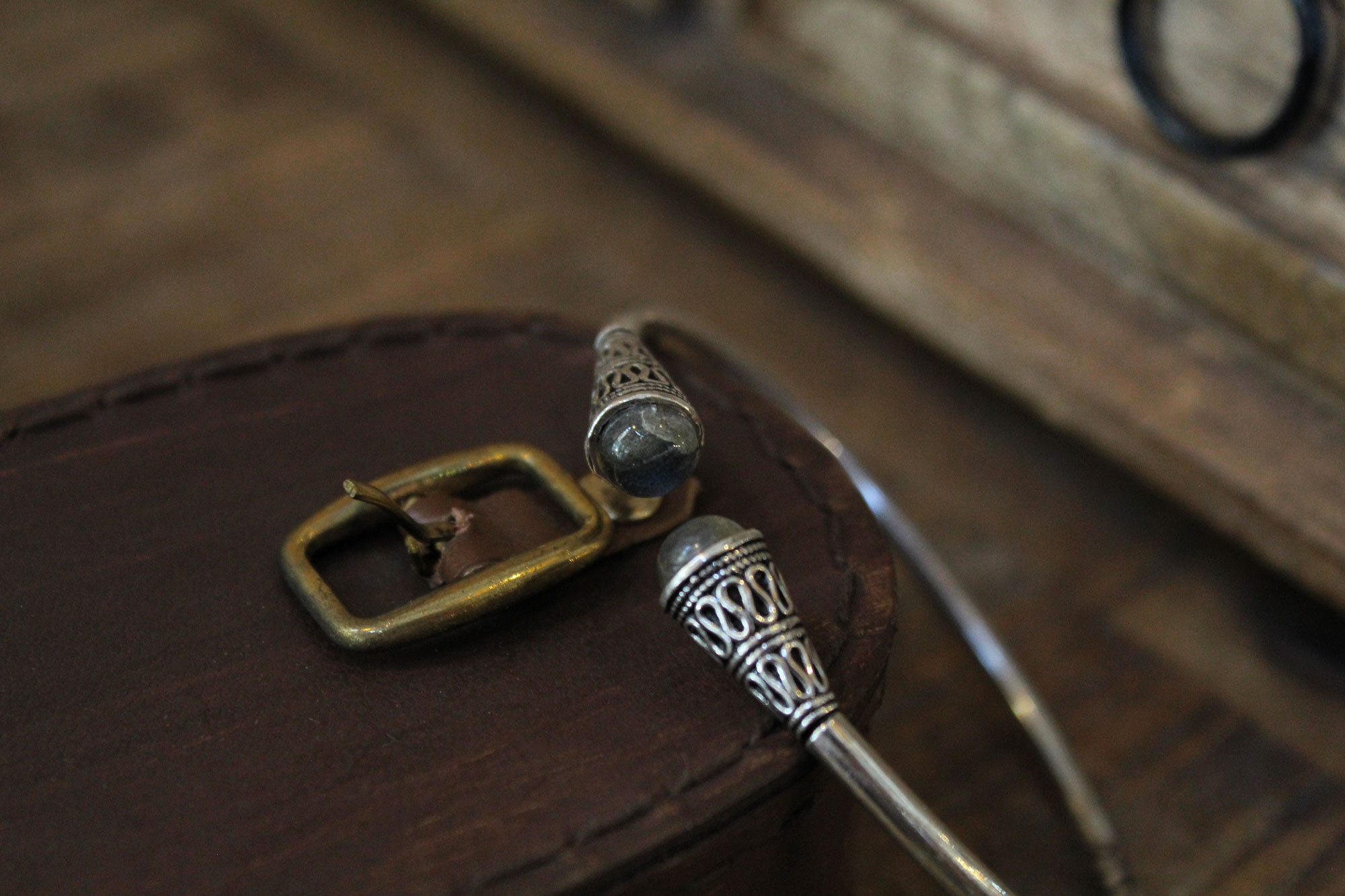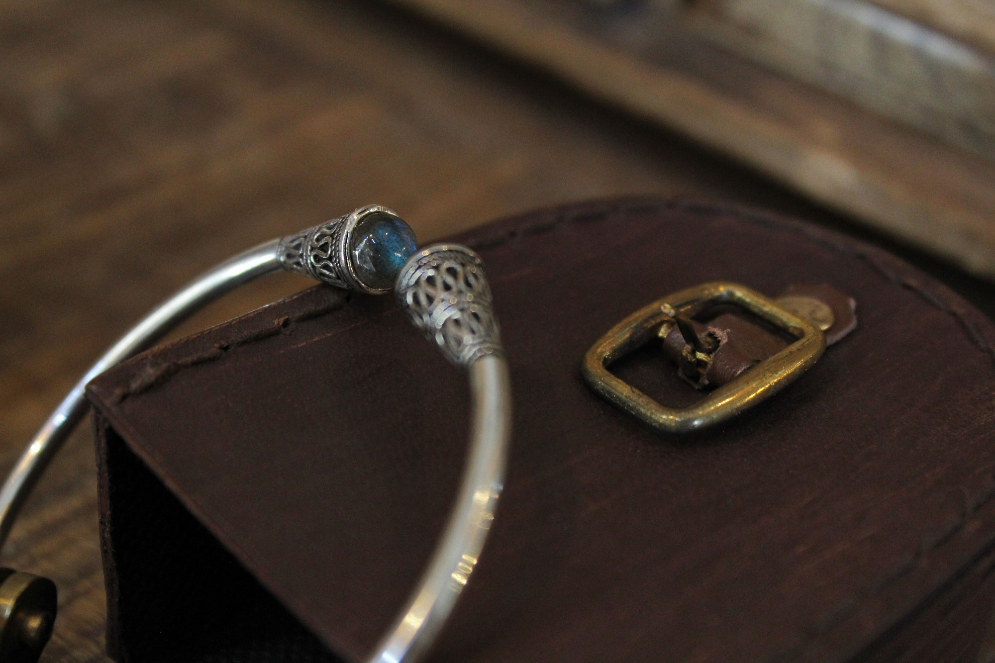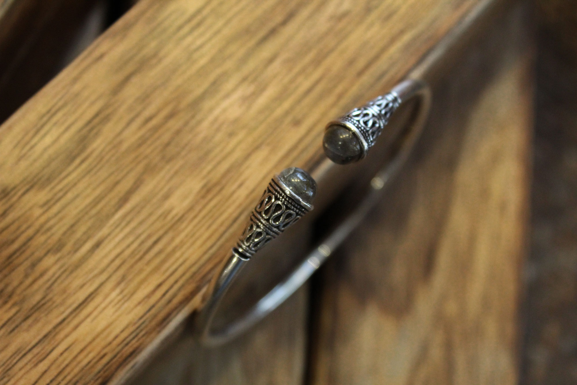 Χειροπέδα κατασκευασμένη από ασήμι με εγχάρακτο σχεδιασμό στο τελείωμά της και μοναδικά πετρώματα λαμπραδορίτη.