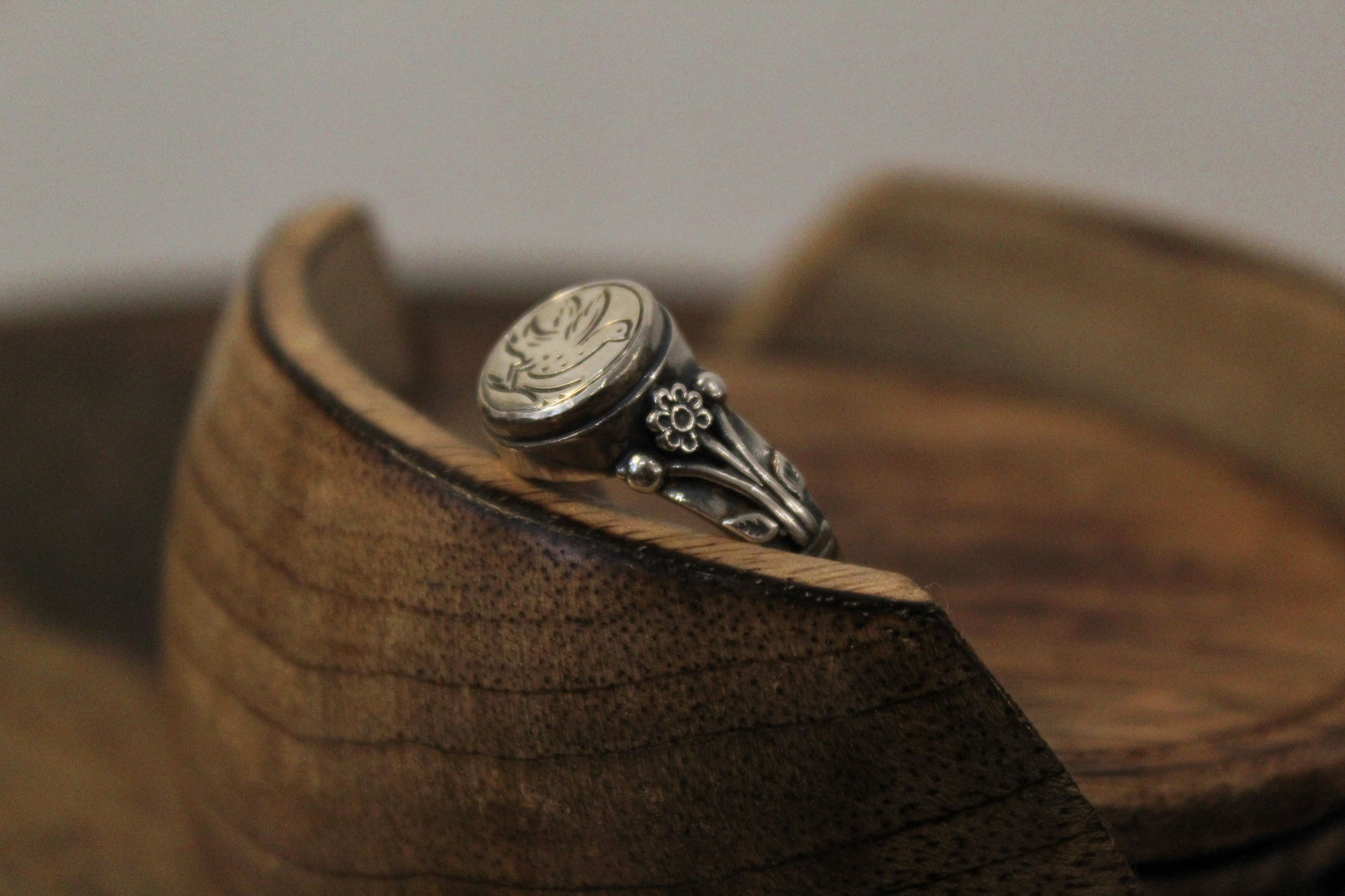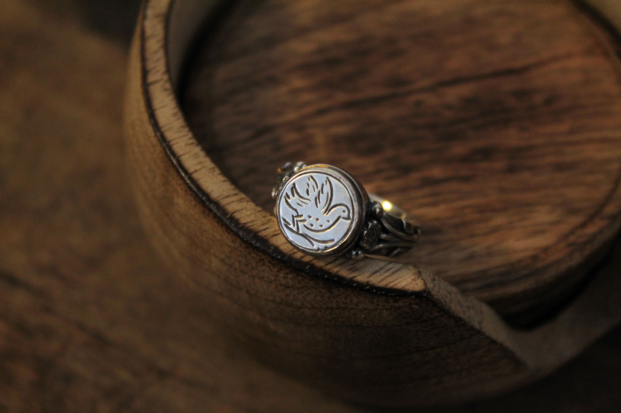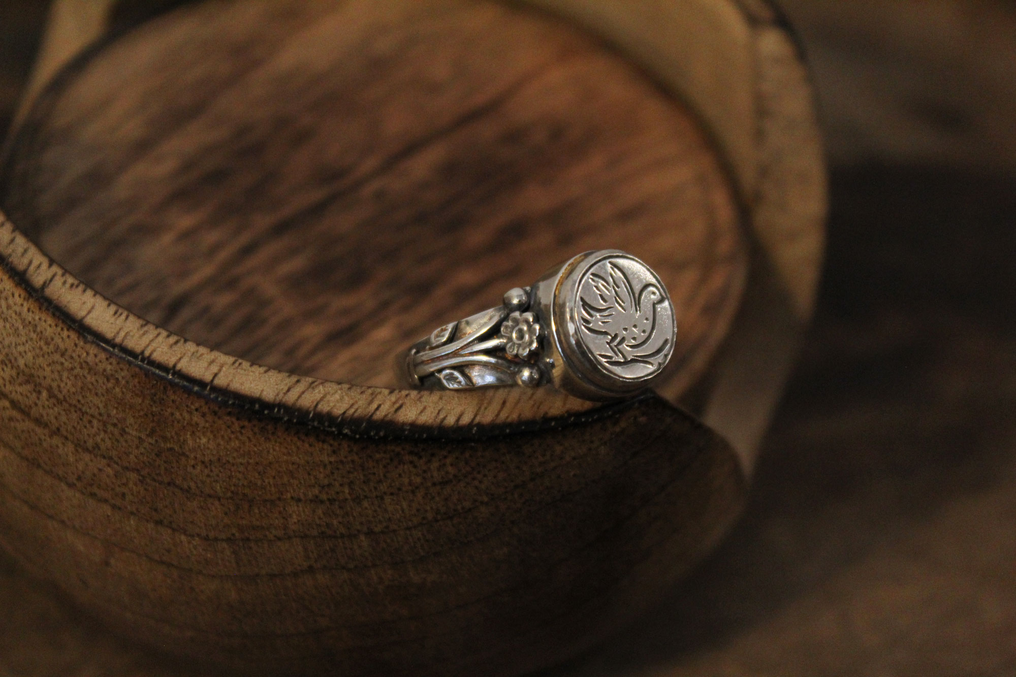 Koukos Jewellery χειροποίητο δαχτυλίδι κατασκευασμένο από ασήμι με εγχάρακτο σχέδιο περιστεριού στο επάνω μέρος του και ανάγλυφα λουλούδια στα πλαϊνά της γάμπας του.