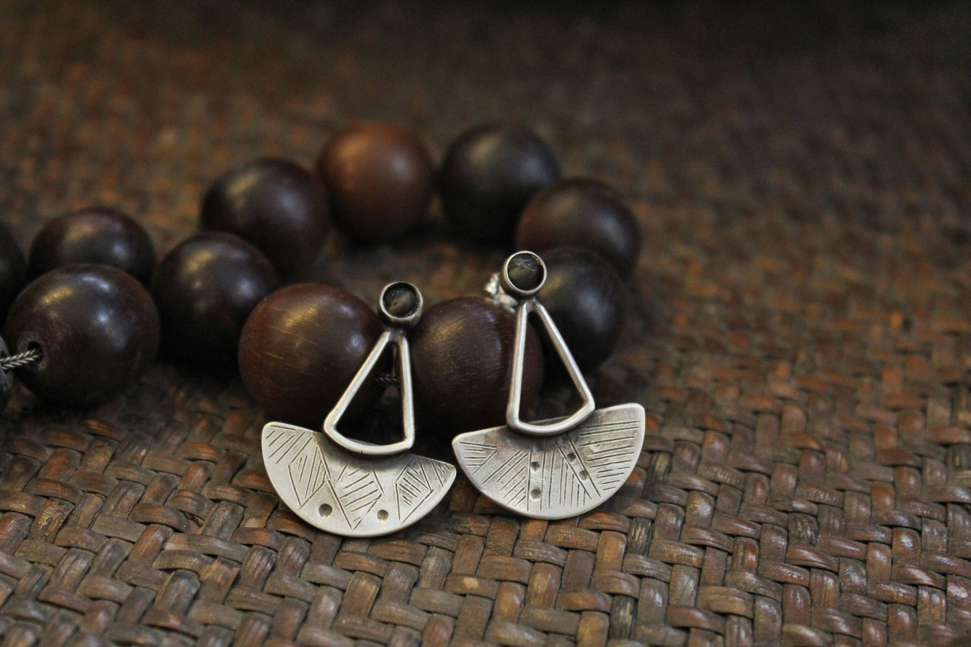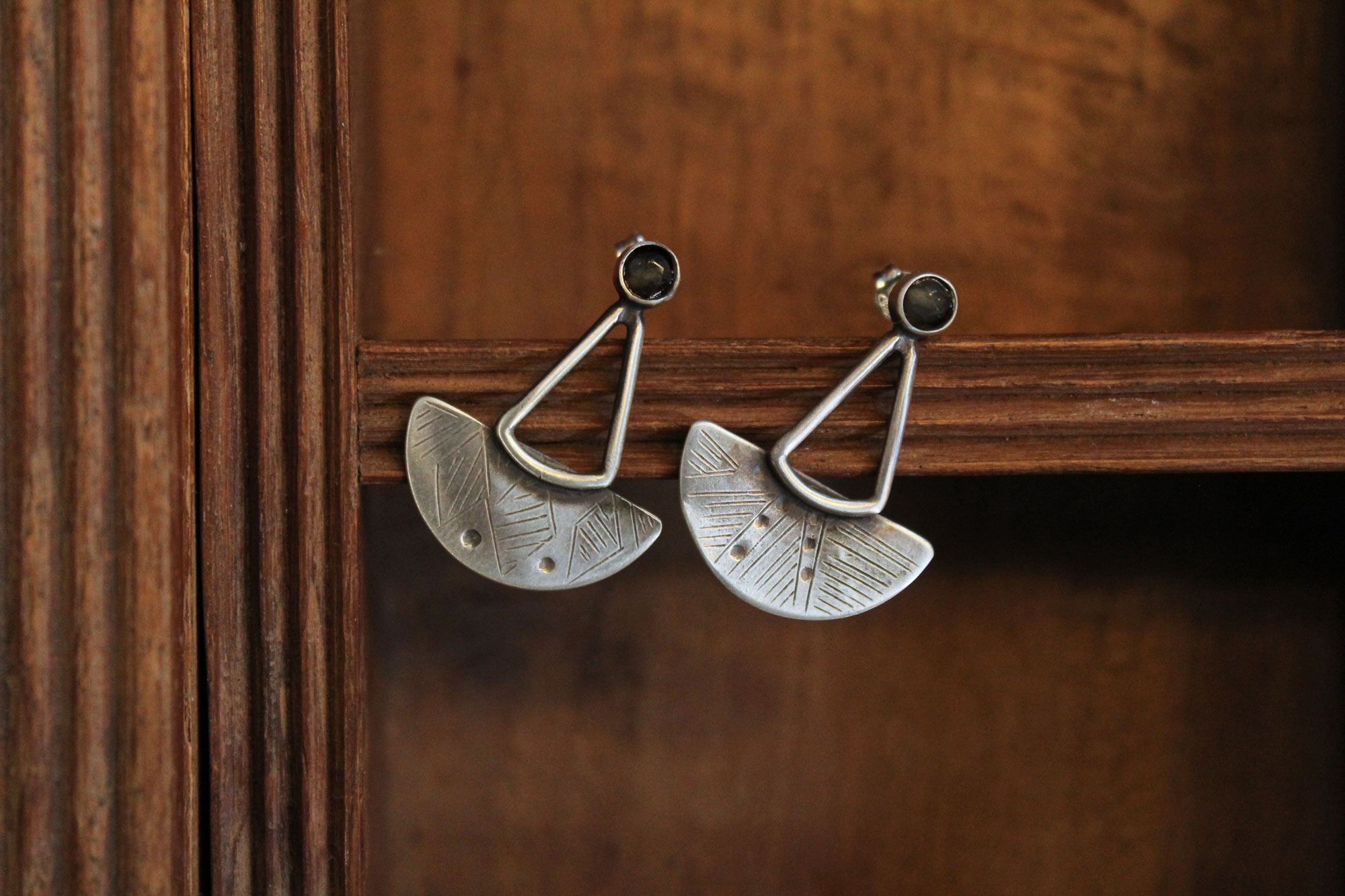 Χειροποίητα σκουλαρίκια κατασκευασμένα από οξειδωμένο ασήμι με μοναδικό εγχάρακτο σχεδιασμό και πετρώματα από εσσονίτη.