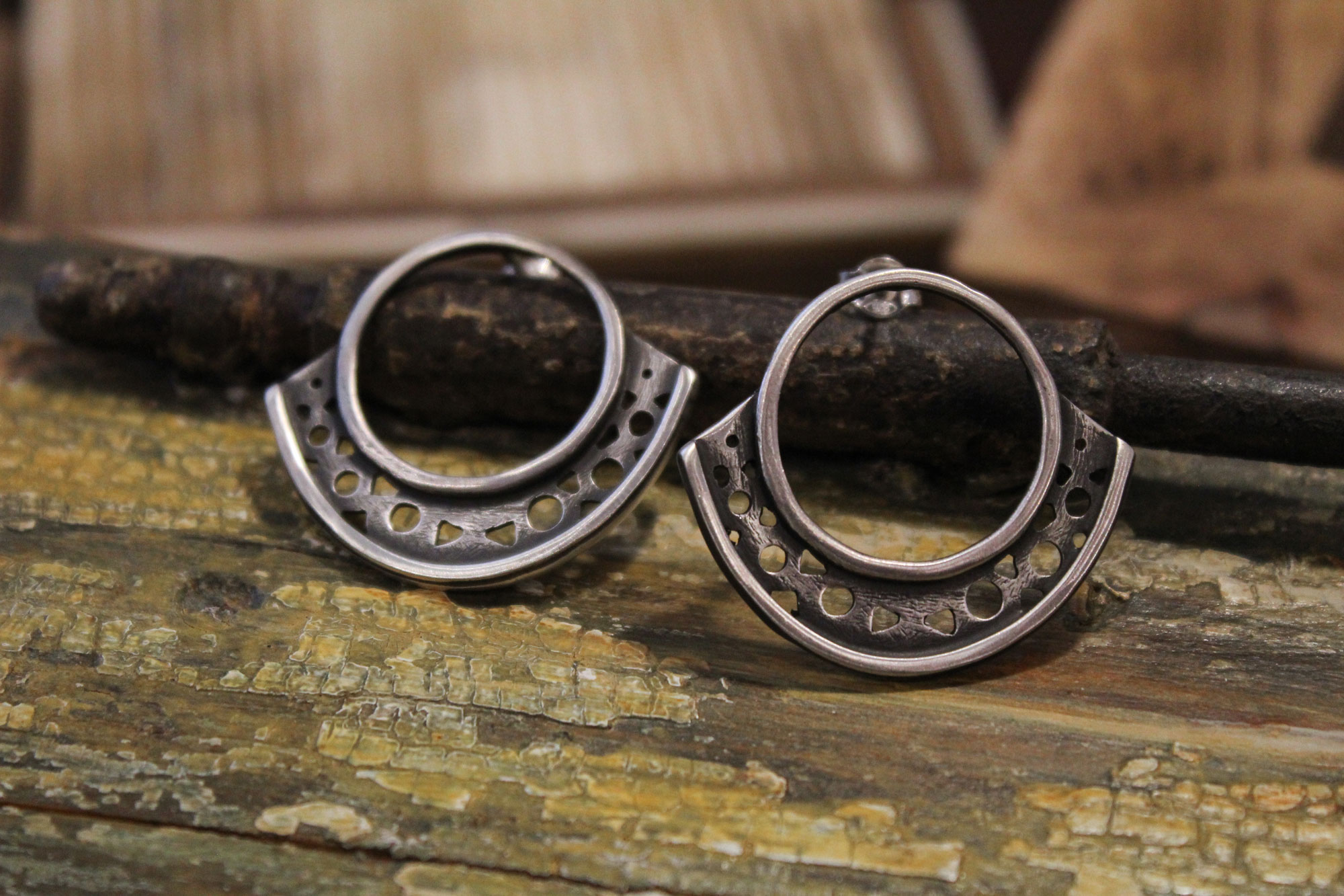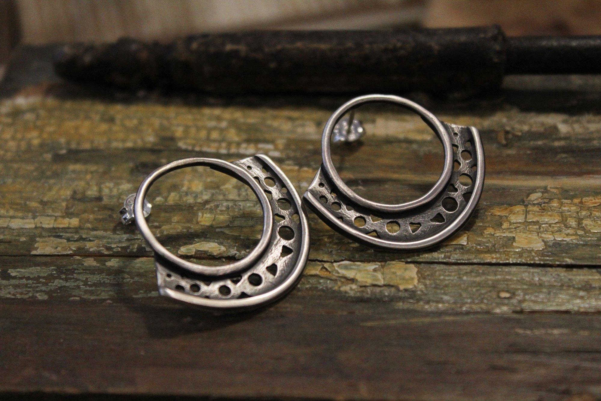 Χειροποίητα σκουλαρίκια κατασκευασμένα από ασήμι σε έθνικ διάτρητο σχεδιασμό.