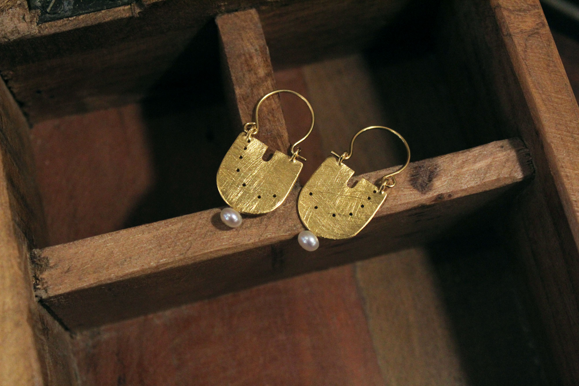 CHRYSOULA SOFOU σκουλαρίκια μοναδικού σχεδιασμού κατασκευασμένα από επιχρυσωμένο ασήμι και μικρά μαργαριτάρια καλλιέργειας στο κάτω μέρος τους.