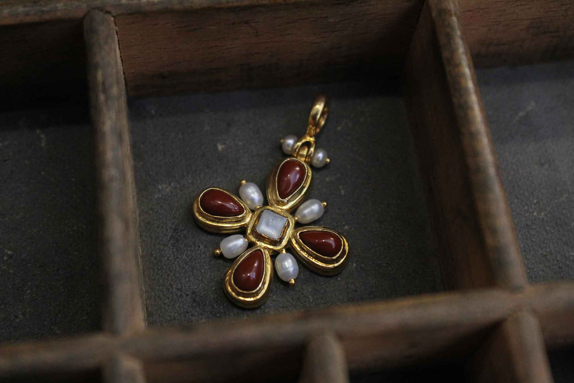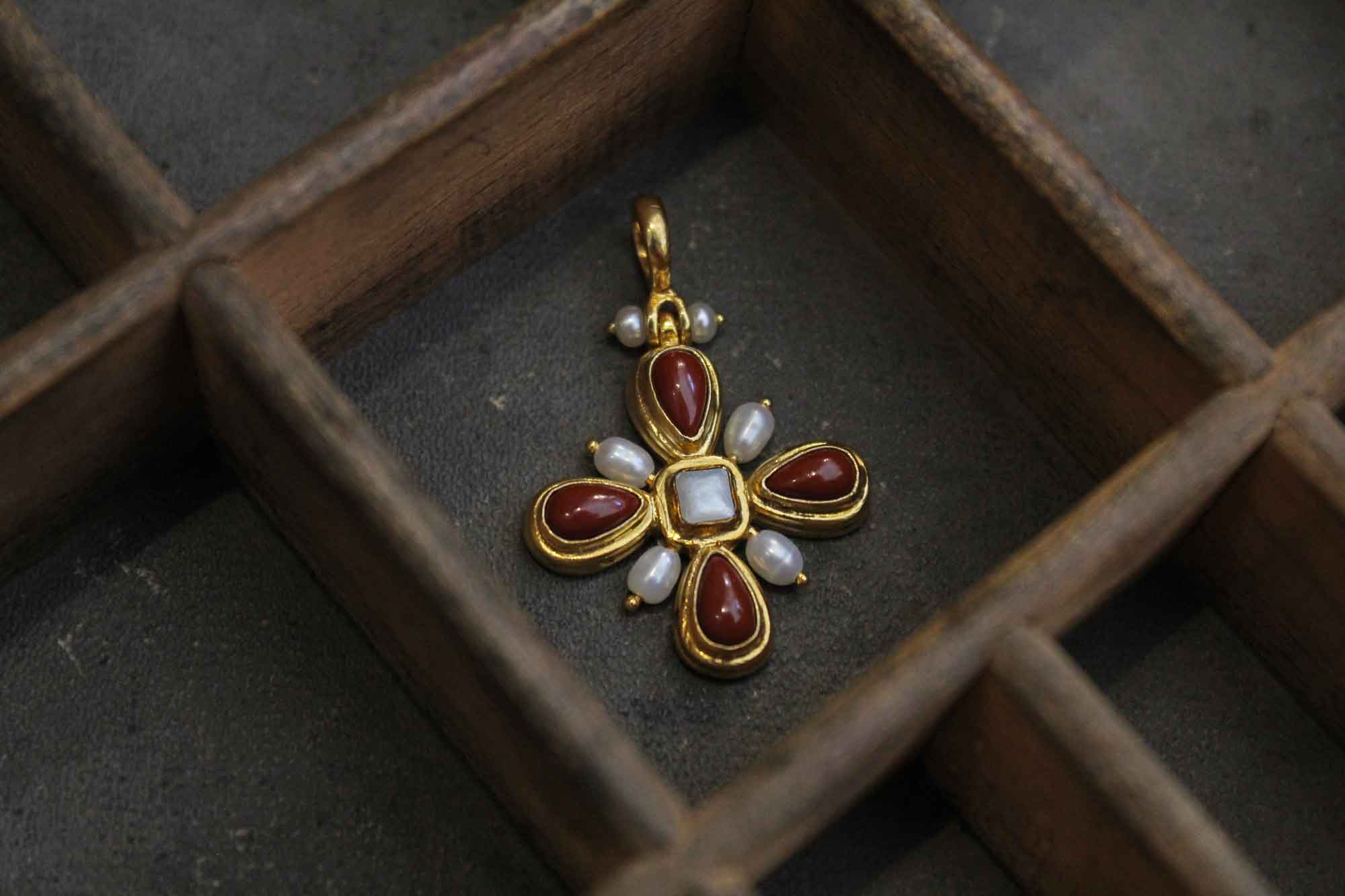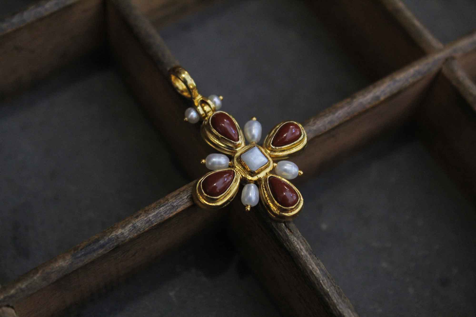 Χειροποίητος σταυρός Koukos Jewellery κατασκευασμένος από επιχρυσωμένο ασήμι με πετρώματα από κοράλλι και μαργαριτάρια καλλιέργειας με τετράγωνο σεντέφι στο κέντρο του.