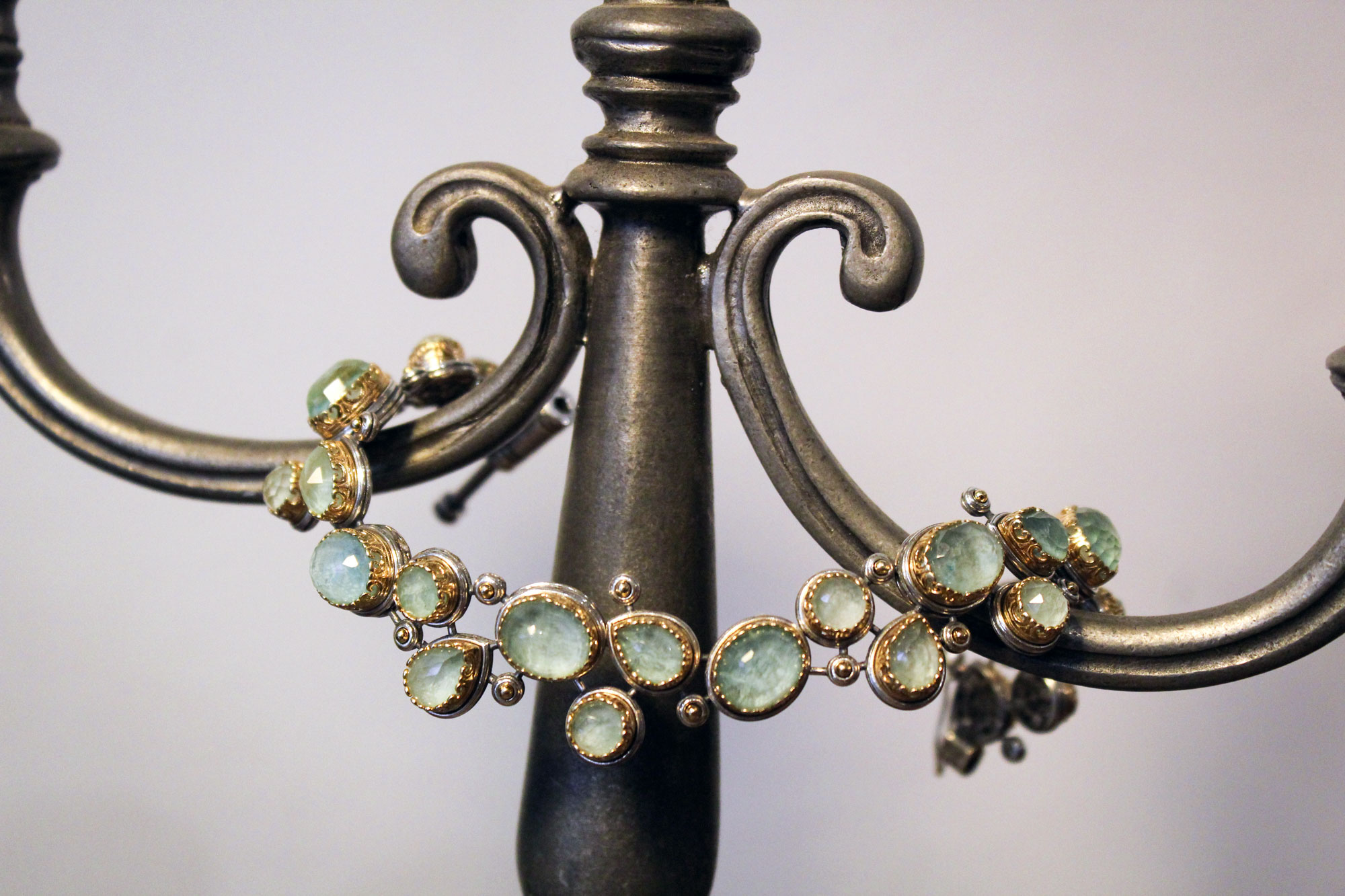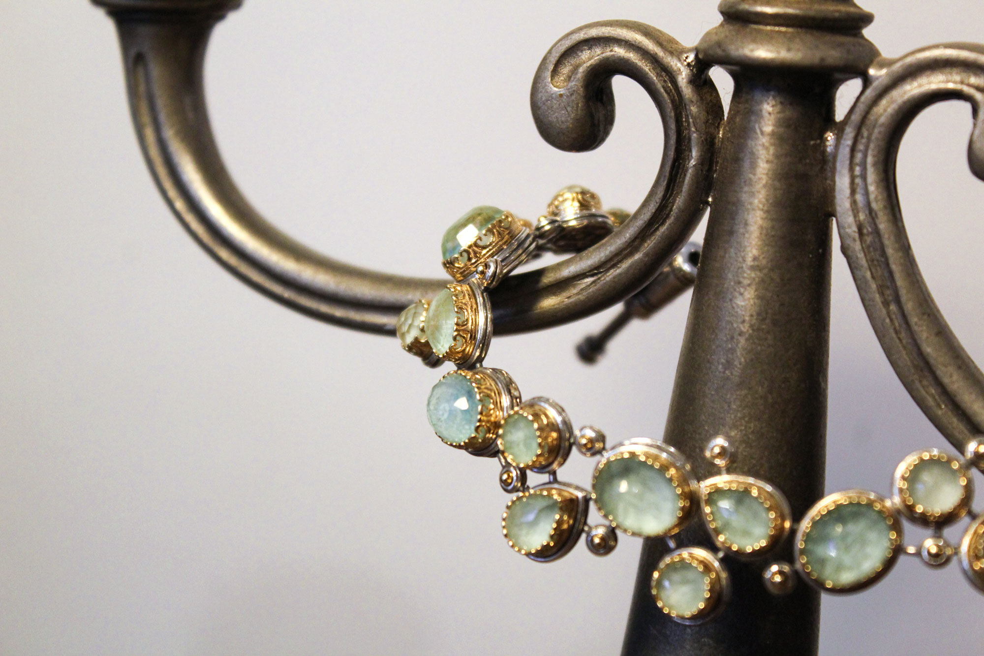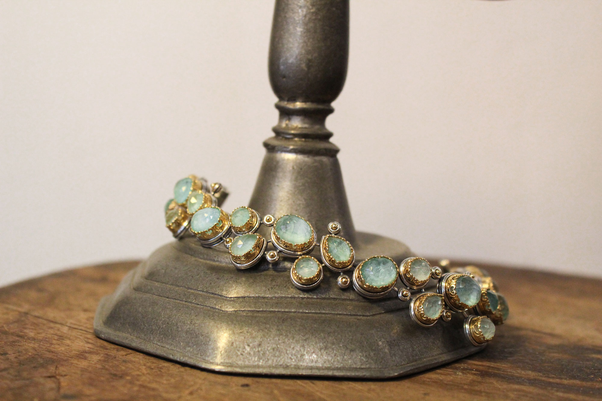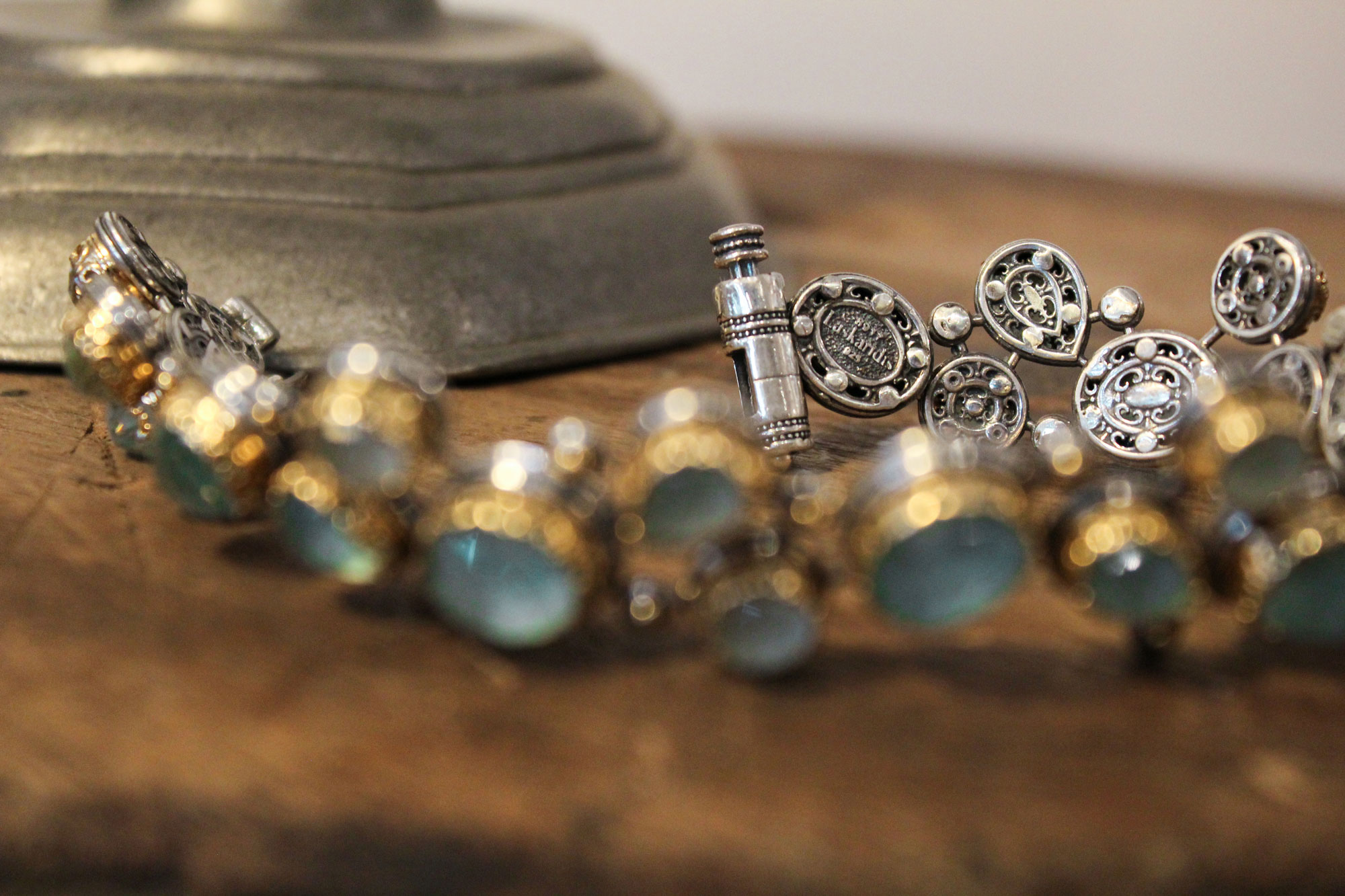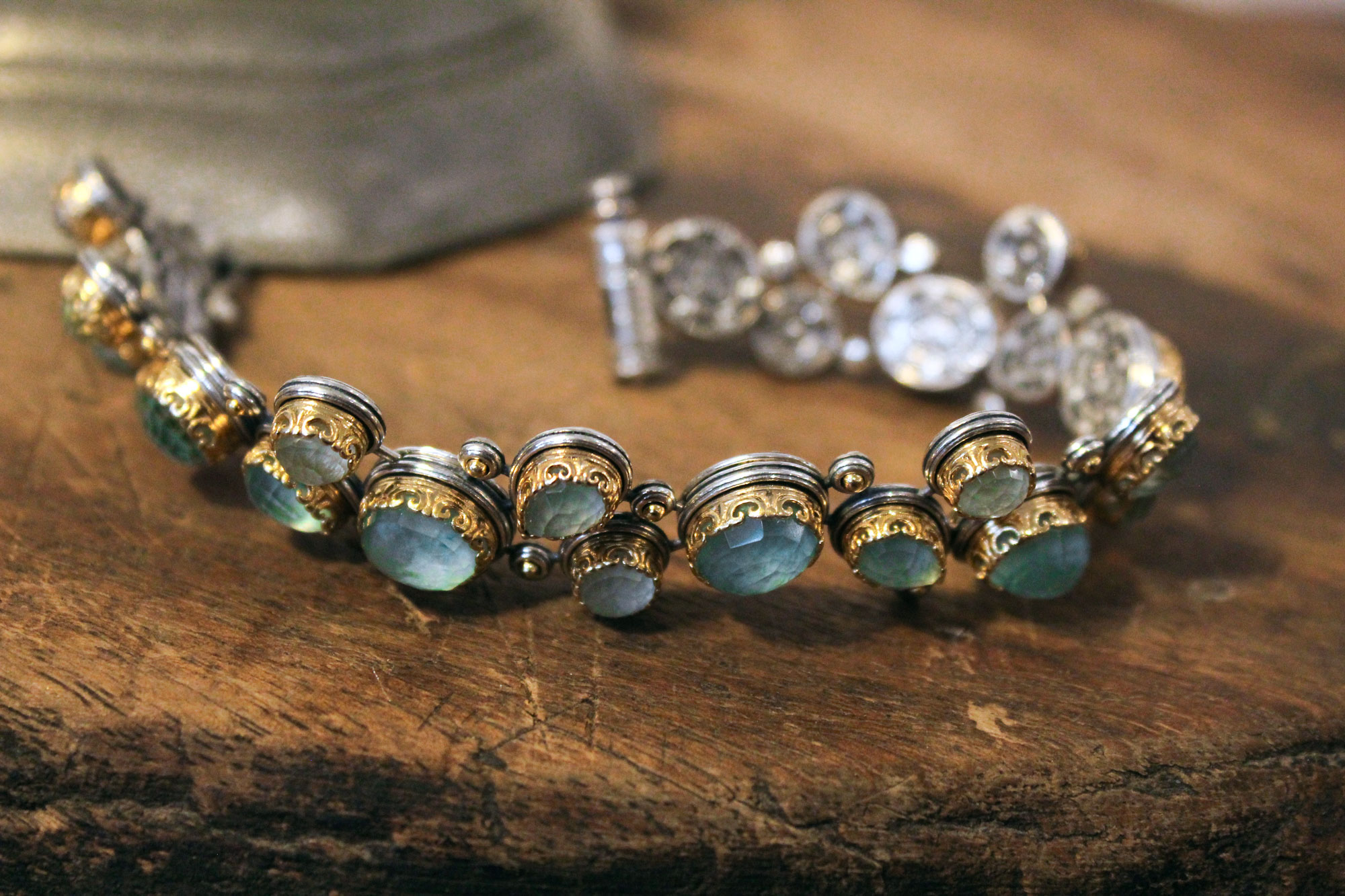 Laskaridis Jewelry χειροποίητο βραχιόλι εντυπωσιακού σχεδιασμού κατασκευασμένο από ασήμι με επίχρυσα μέρη και πετρώματα ντουμπλέτας αμαζονίτη.