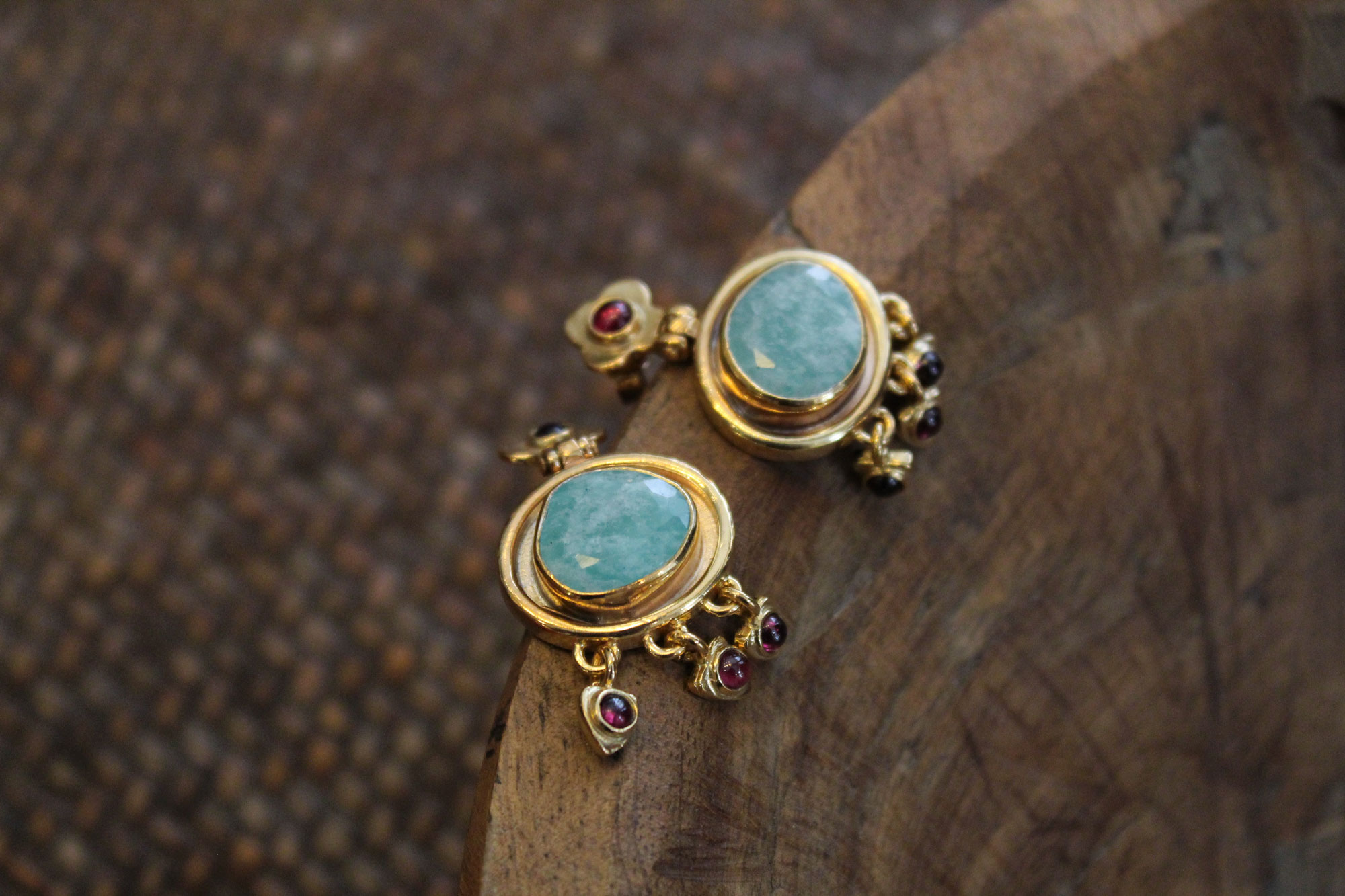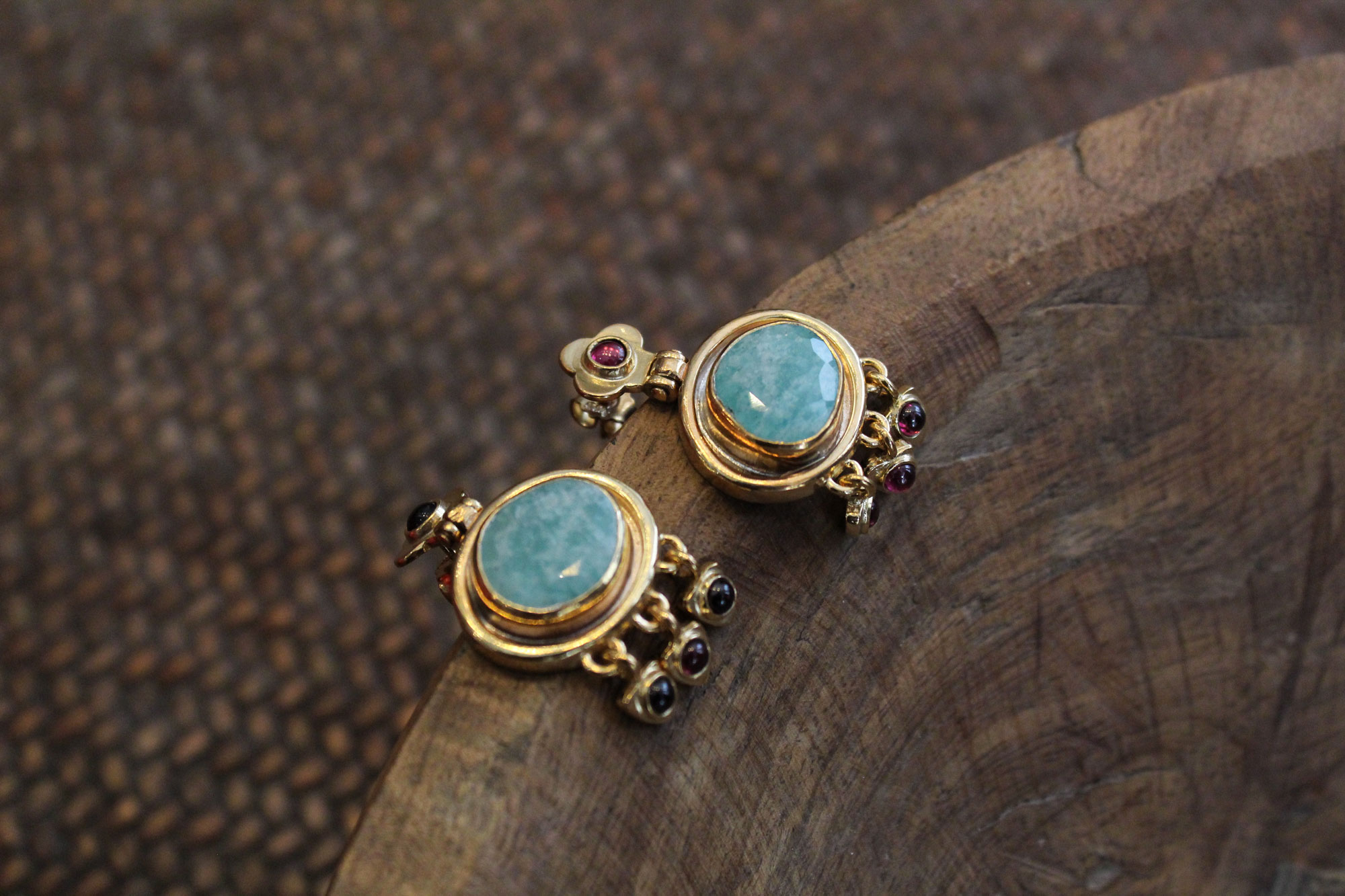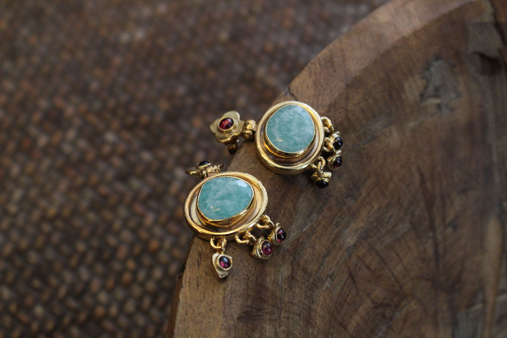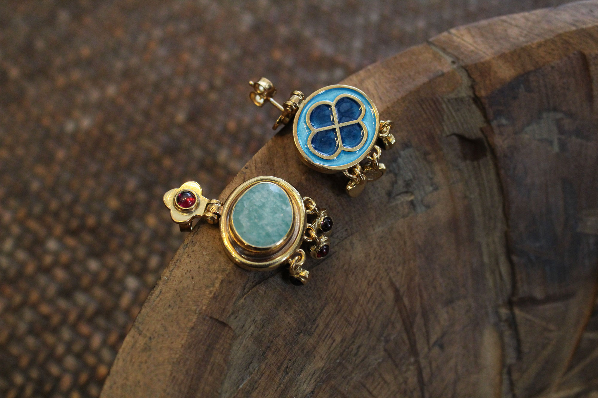 Στο μπροστινό μέρος κοσμούνται από οβάλ πετρώματα αμαζονίτη και μικρότερα κρεμαστές γρανάδες, ενώ στο πίσω μέρος υπάρχει σχέδιο λουλουδιού από σμάλτο.
