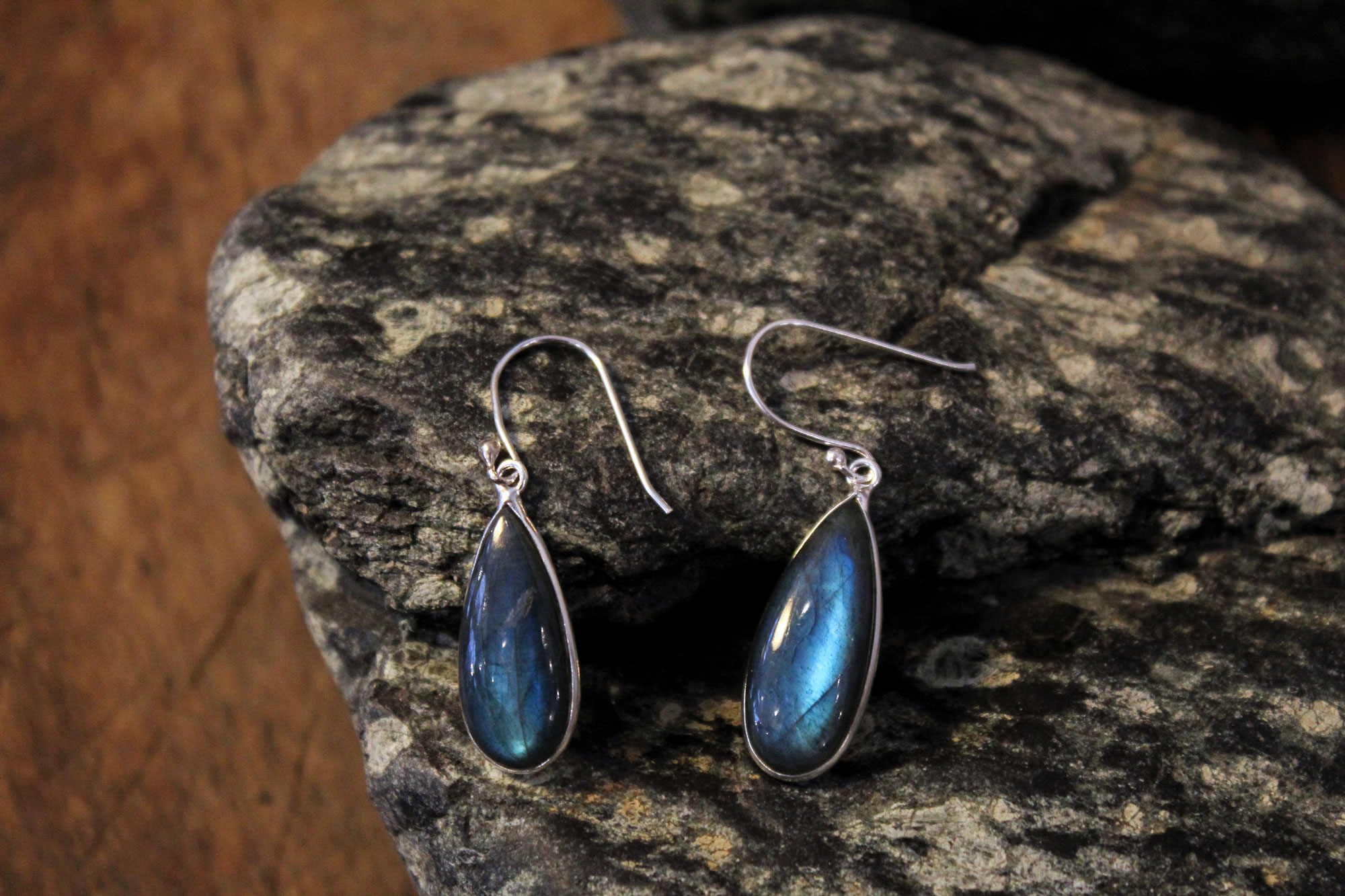 Ασημένια σκουλαρίκια με μοναδικά πετρώματα λαμπραδορίτη σε σχήμα σταγόνας.