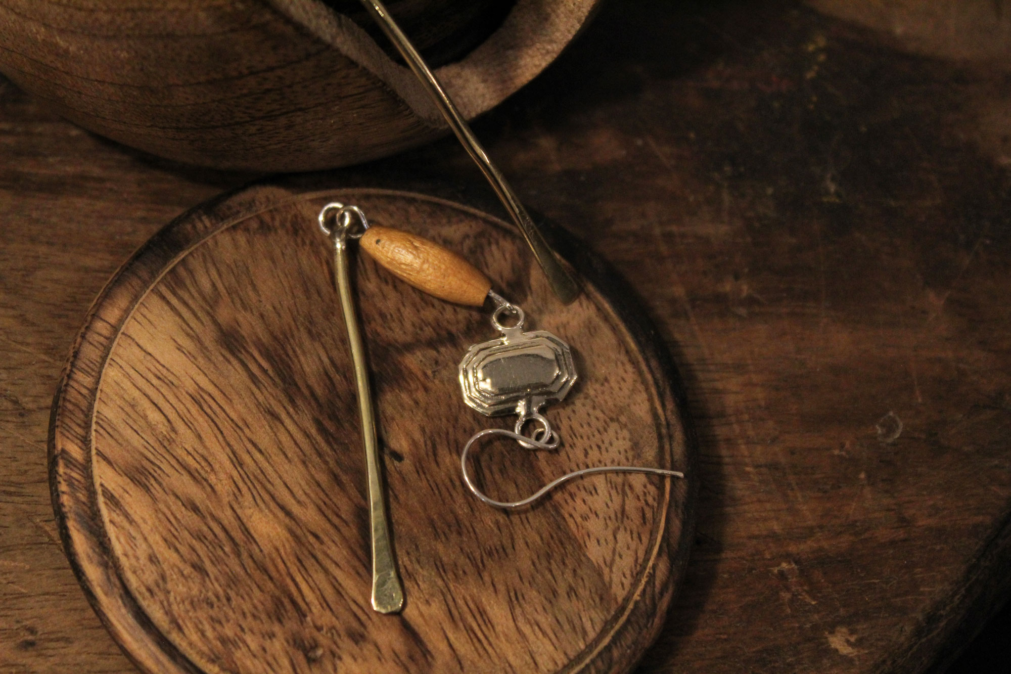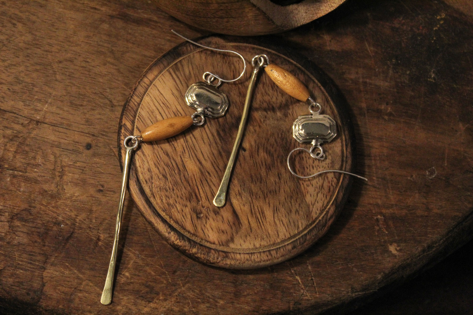 Μοναδικά χειροποίητα σκουλαρίκια αποτελούμενα από μια μακριά ορειχάλκινη μπάρα, ένα ξύλινο στοιχείο και παραλληλόγραμμο μοτίφ επίσης κατασκευασμένο από ορείχαλκο.