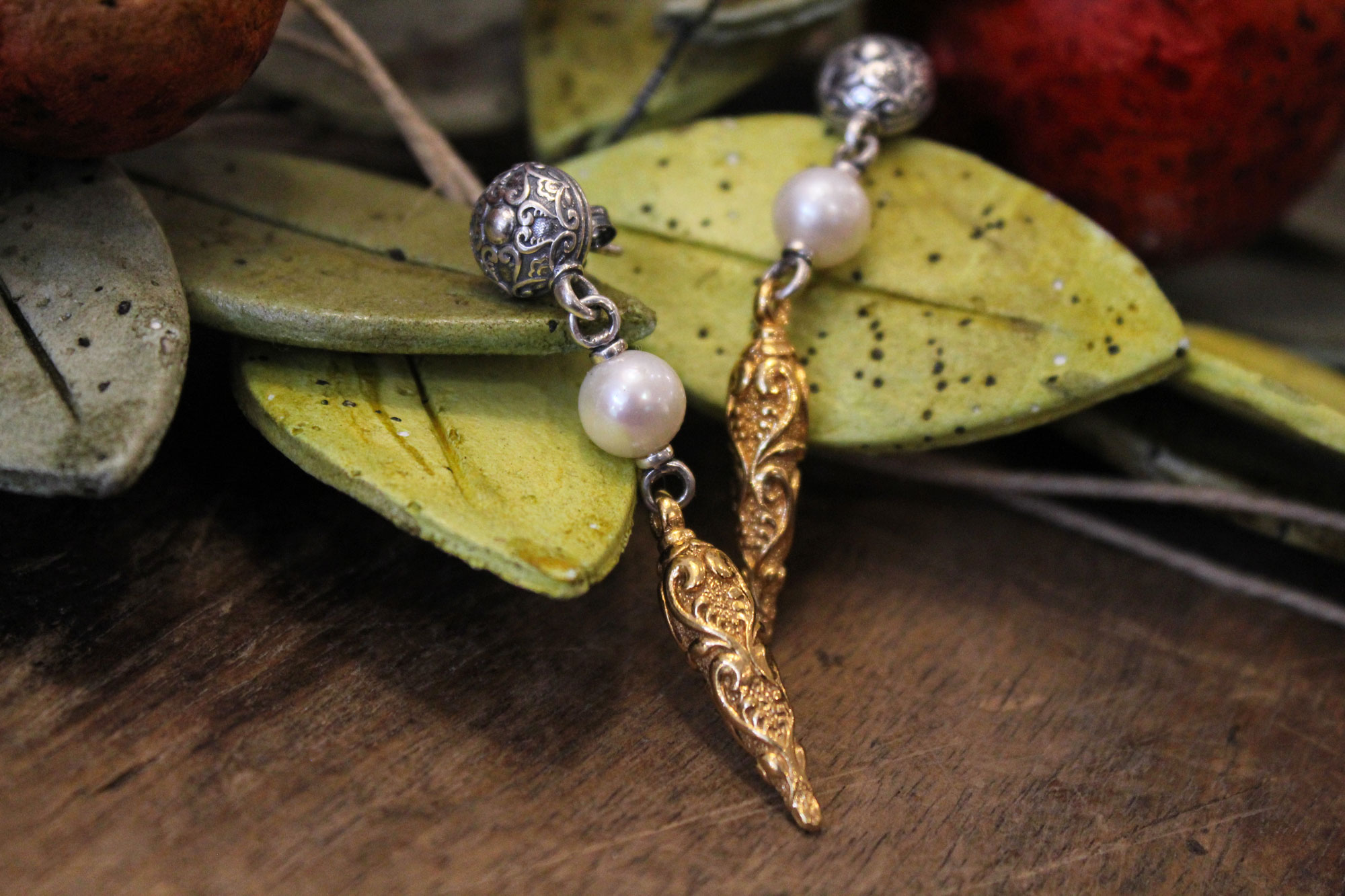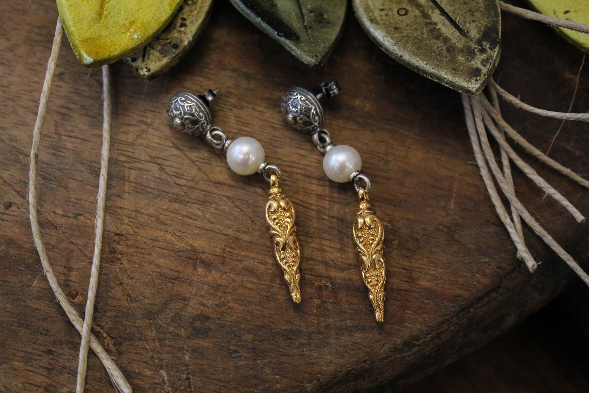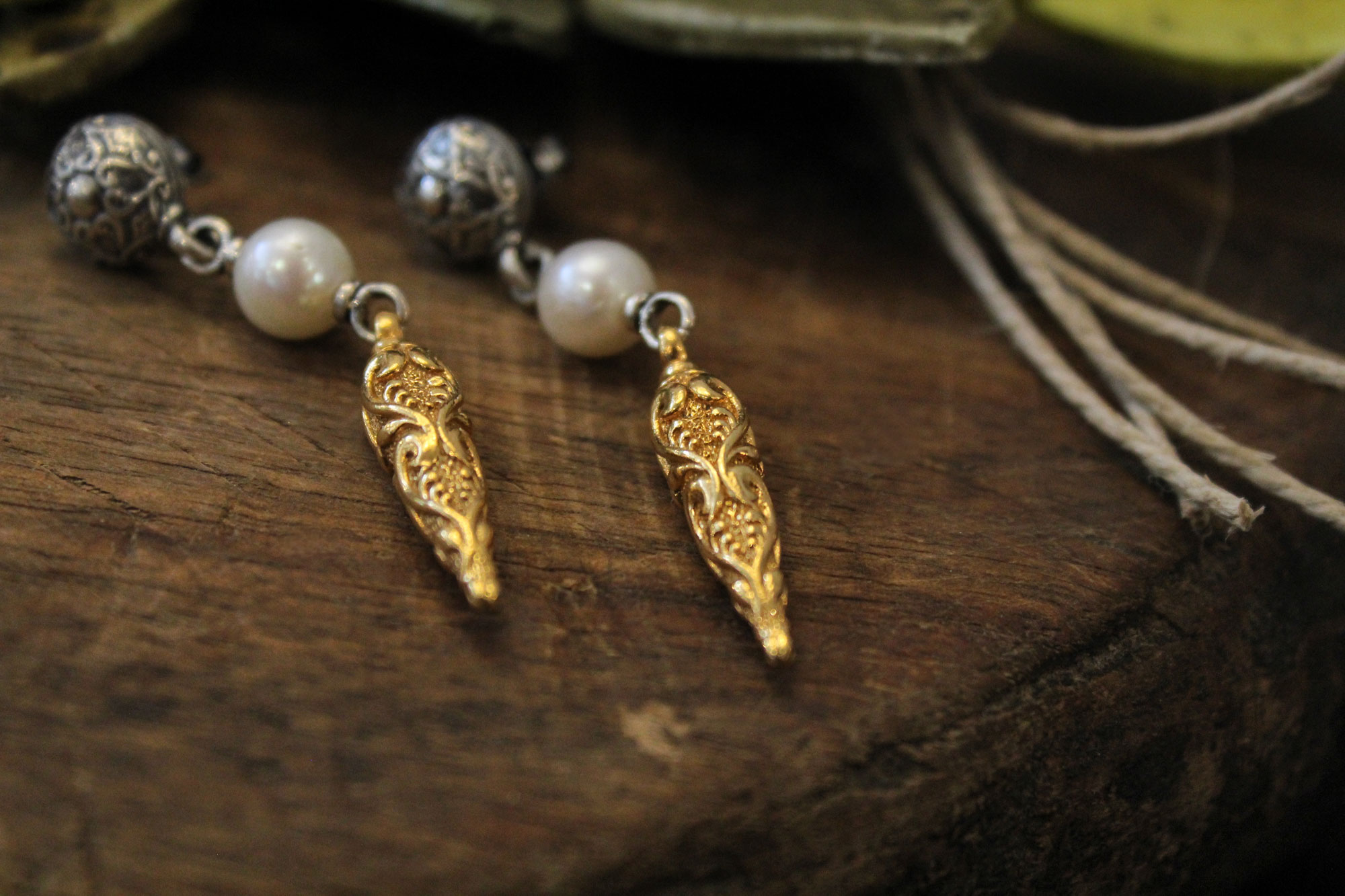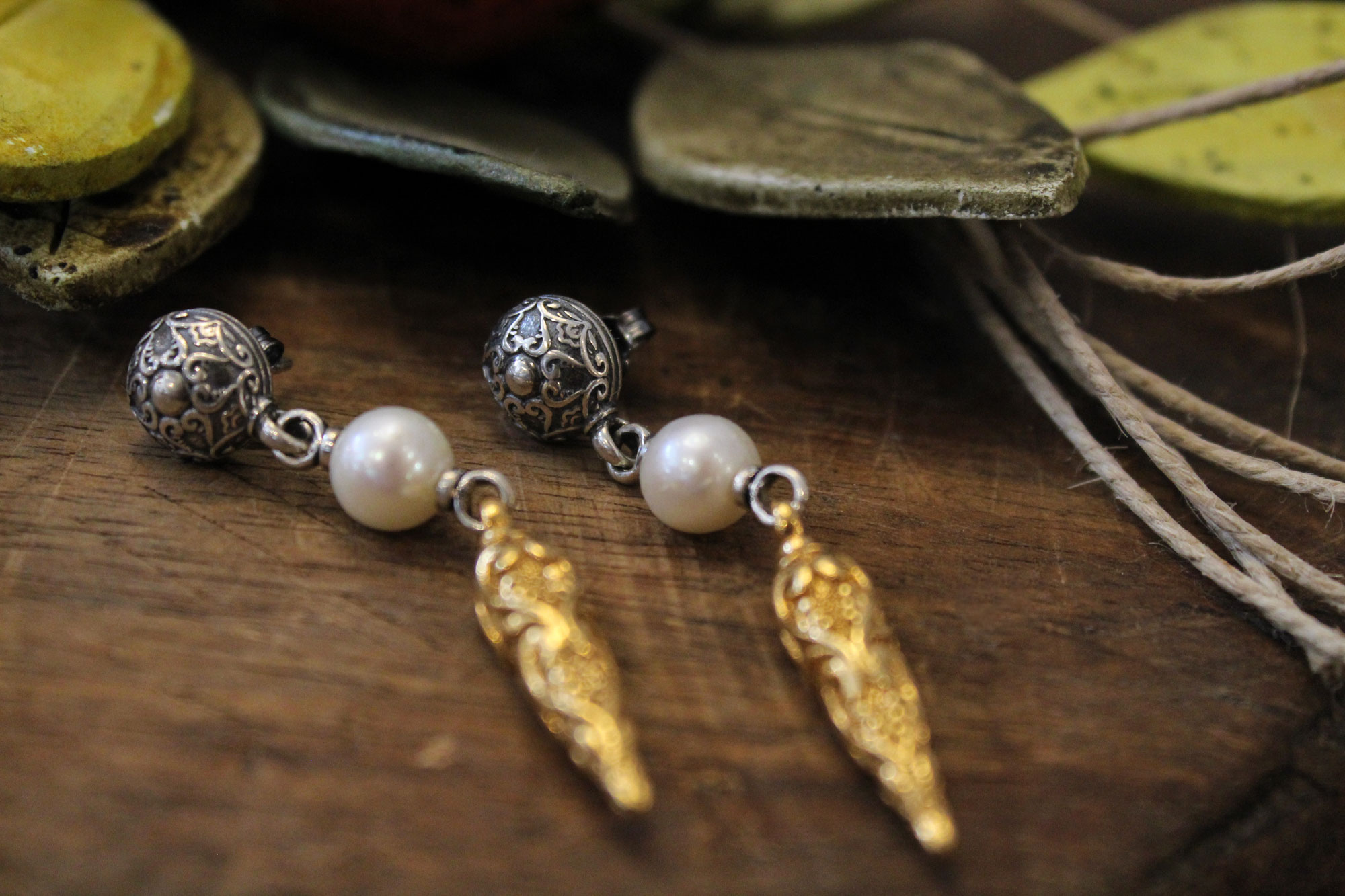 Laskaridis Jewelry χειροποίητα σκουλαρίκια κατασκευασμένα από ασήμι με επίχρυσα μέρη και μαργαριτάρια καλλιέργειας με υπέροχο ανάγλυφο σχεδιασμό!