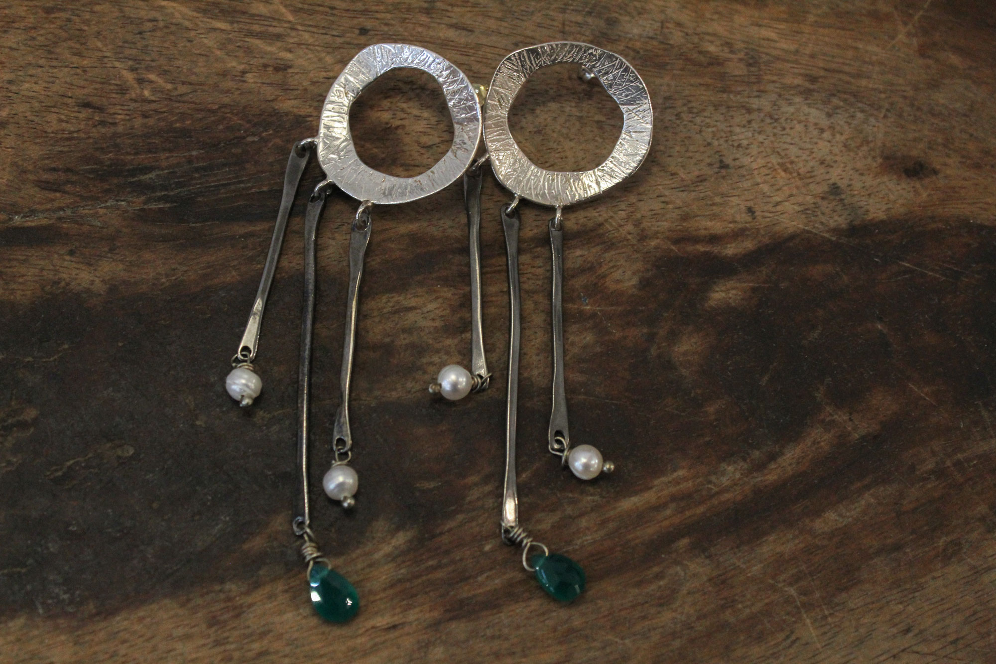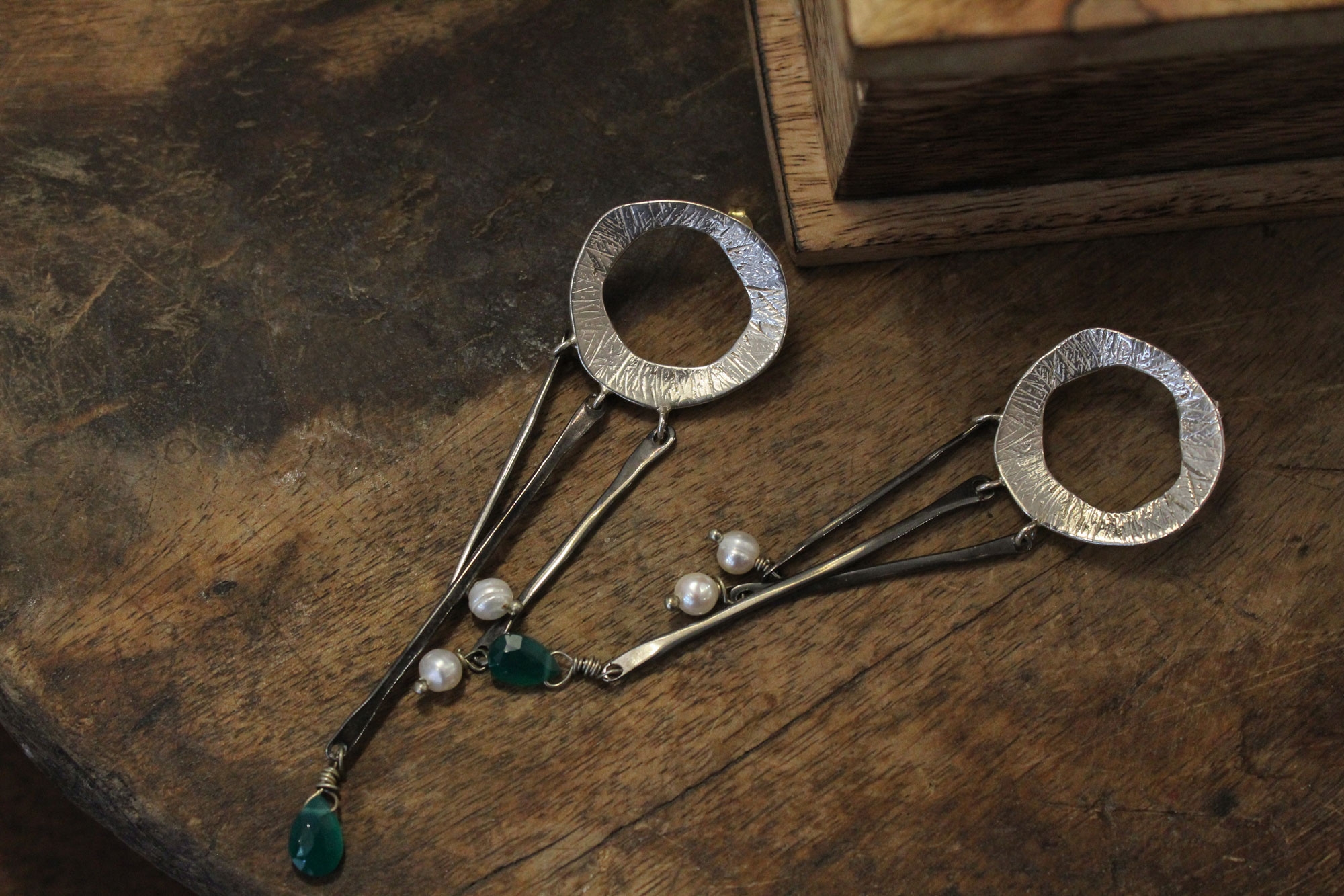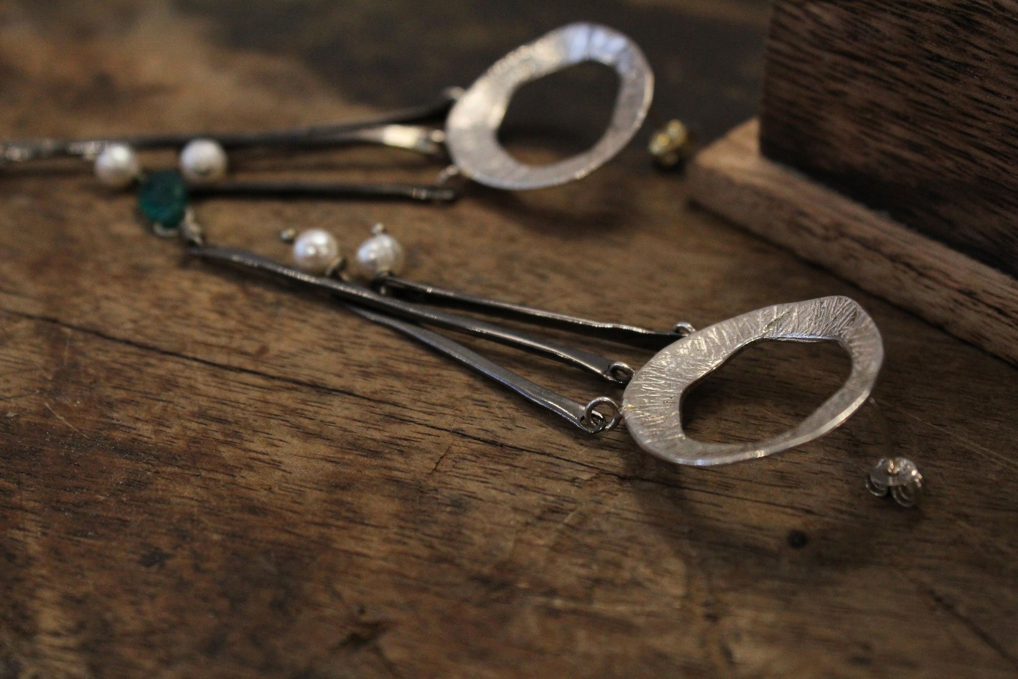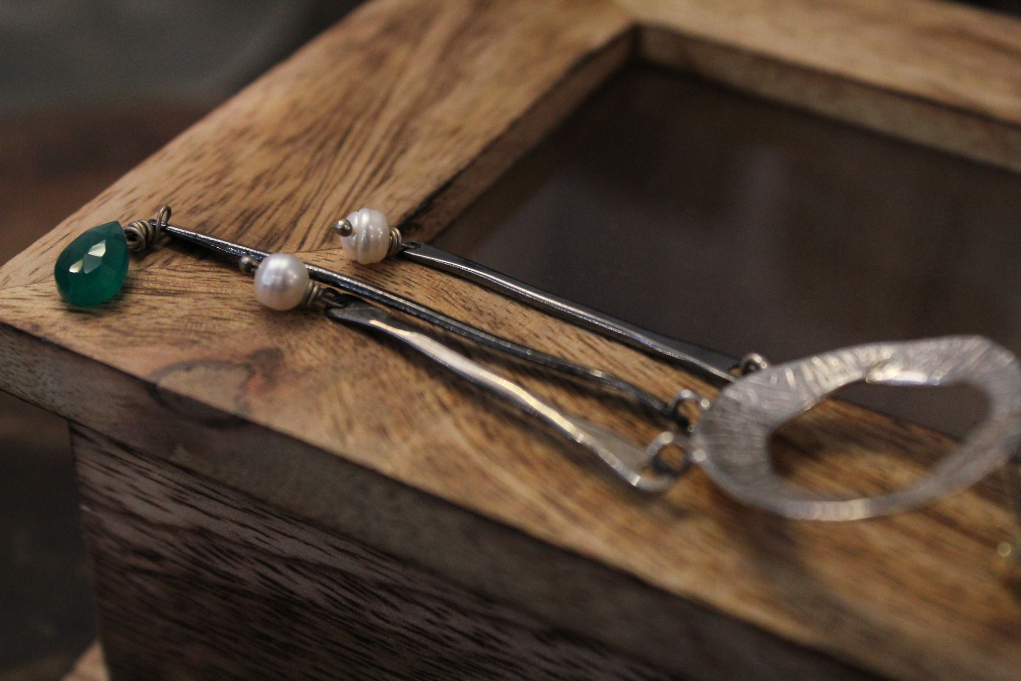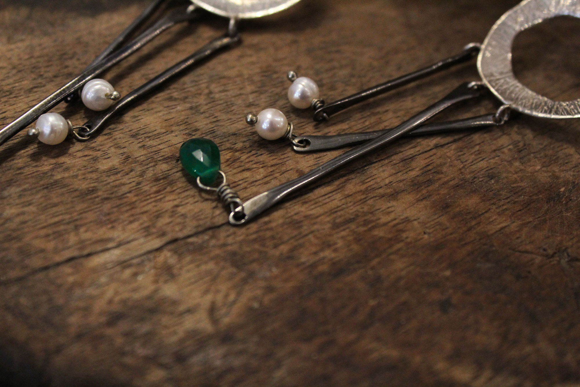 MIKA GRIVAKI χειροποίητα, μακριά σκουλαρίκια κατασκευασμένα από ασήμι με επιροδιωμένες “μπάρες” που προσδίδουν μια υπέροχη κίνηση! Κοσμούνται από μαργαριτάρια καλλιέργειας και ταγιέ πετρώματα πράσινου νεφρίτη.