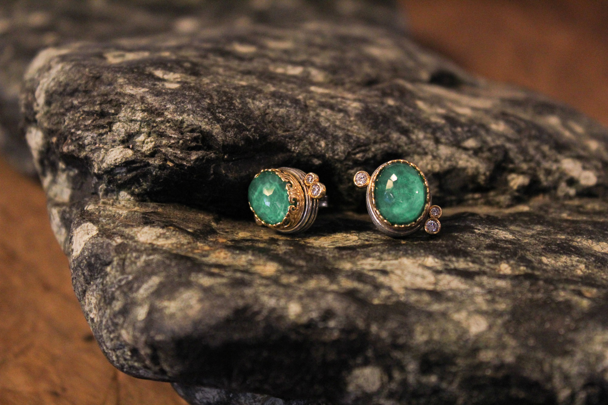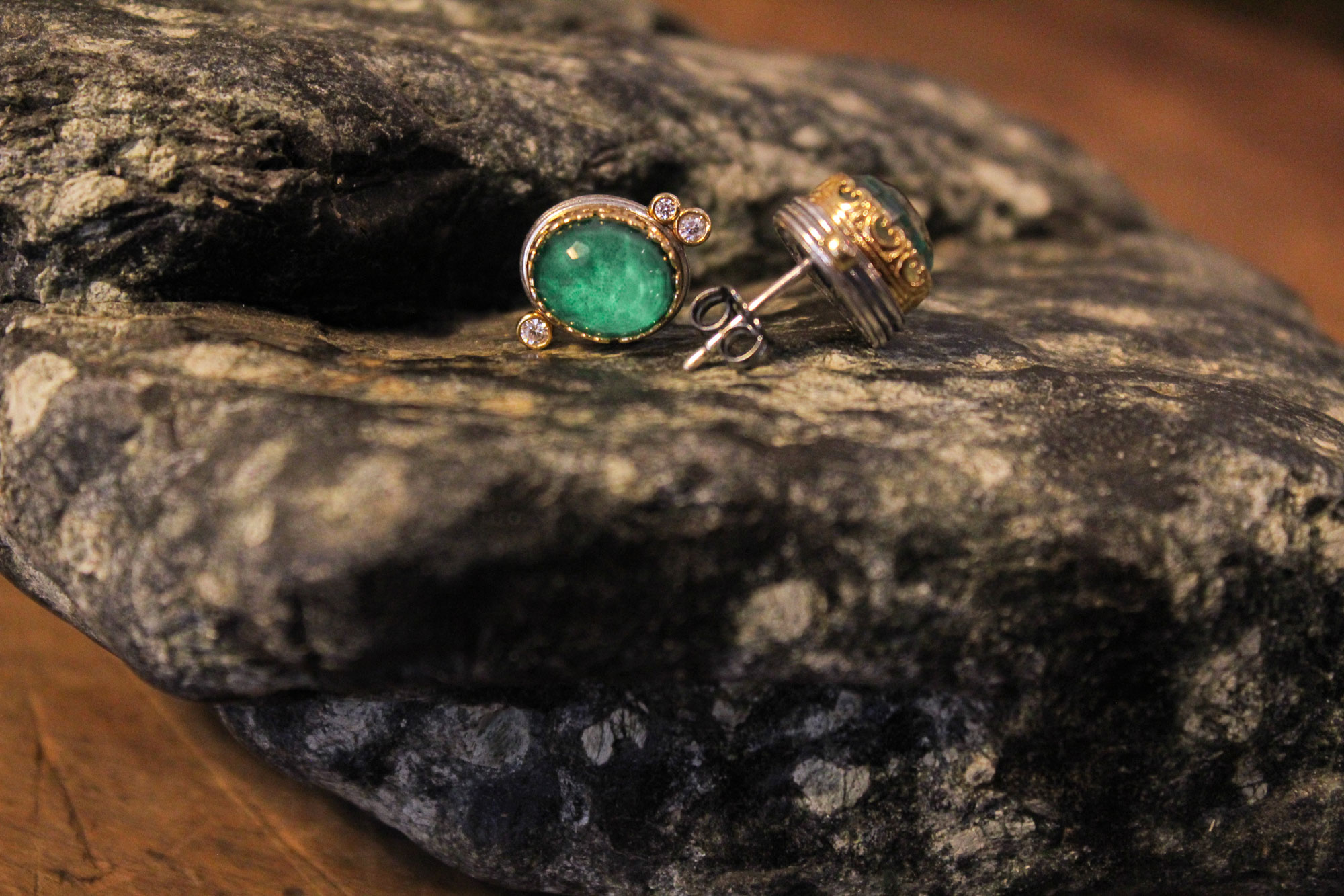 Laskaridis Jewelry χειροποίητα σκουλαρίκια κατασκευασμένα από ασήμι με επίχρυσα μέρη, μικρά ζιρκόνια και μοναδικές ντουμπλέτες μαλαχίτη.