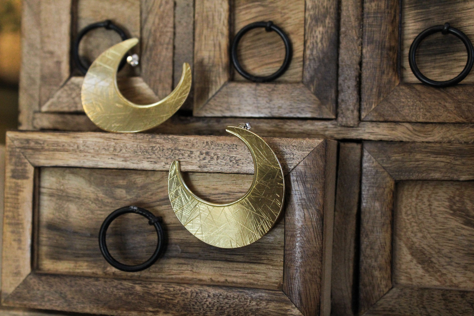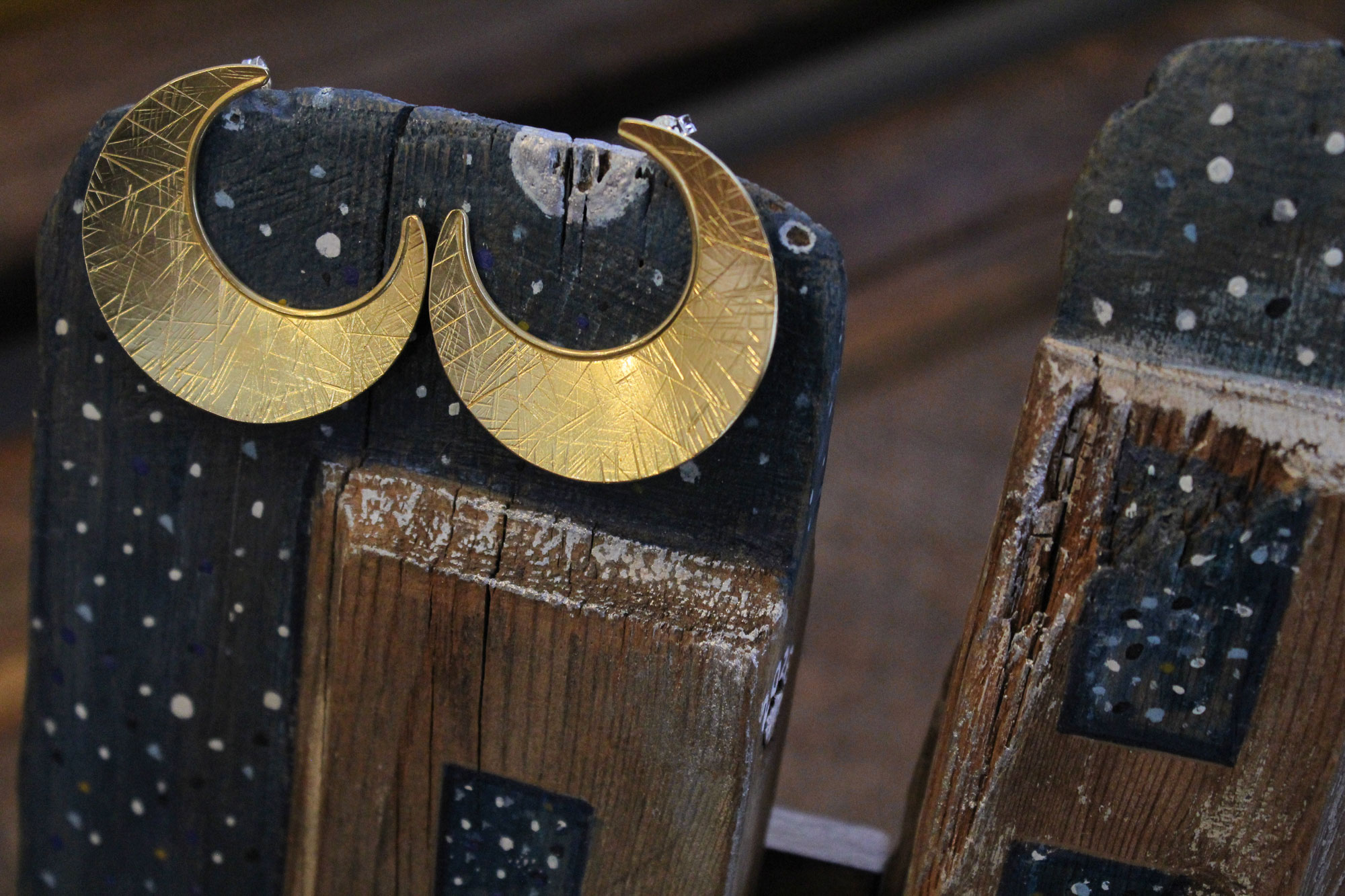 Χειροποίητοι κρίκοι ελληνικής δημιουργίας κατασκευασμένοι από επιχρυσωμένο ορείχαλκο σε σχέδιο μισοφέγγαρου με ελεύθερες εγχαράξεις.