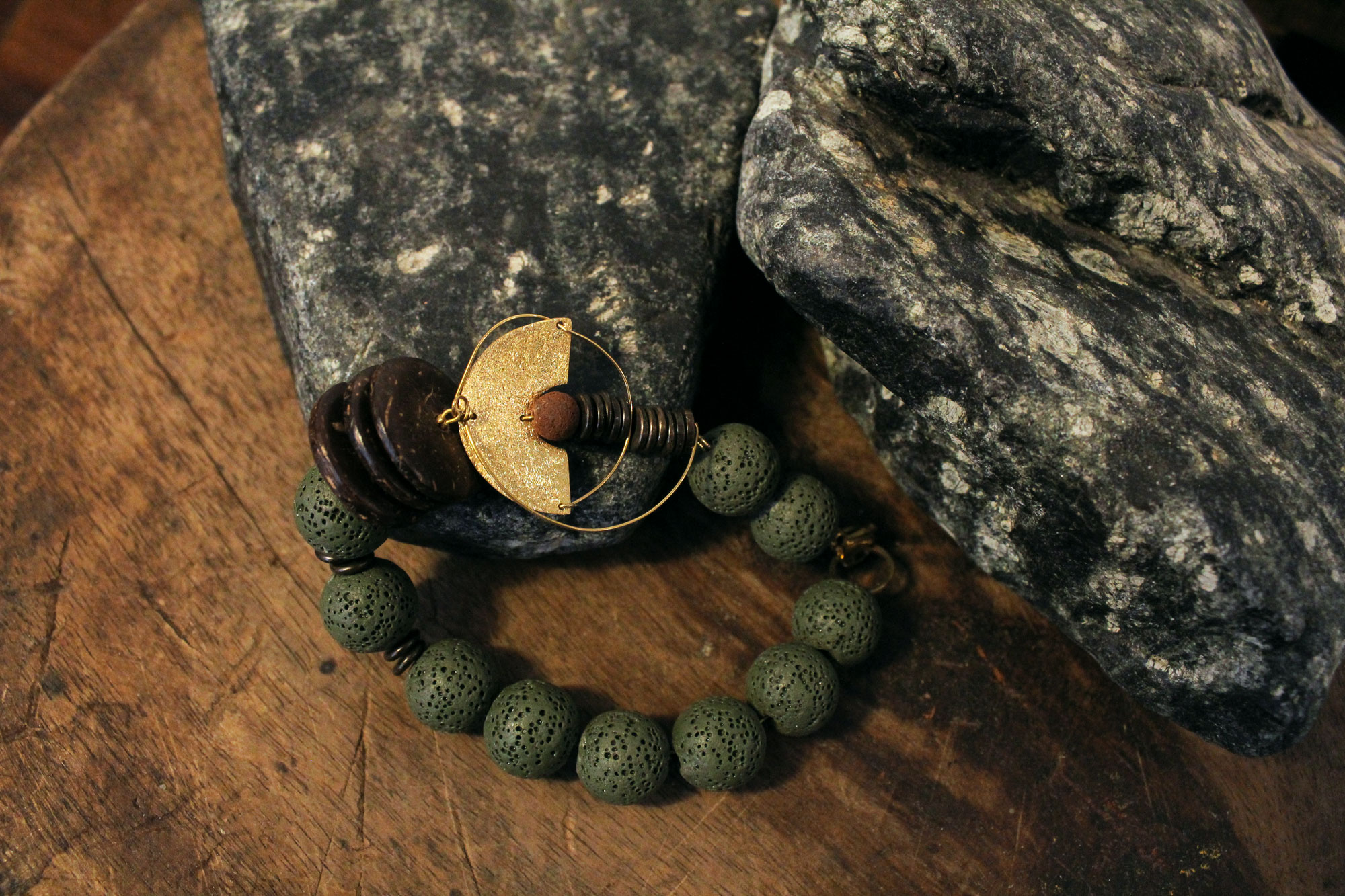 Χειροποίητο βραχιόλι με βαμμένα πετρώματα από φυσική λάβα σε κυπαρισσί απόχρωση, επίχρυσα ορειχάλκινα στοιχεία και στρογγυλά “τσιπ” από καρύδα.