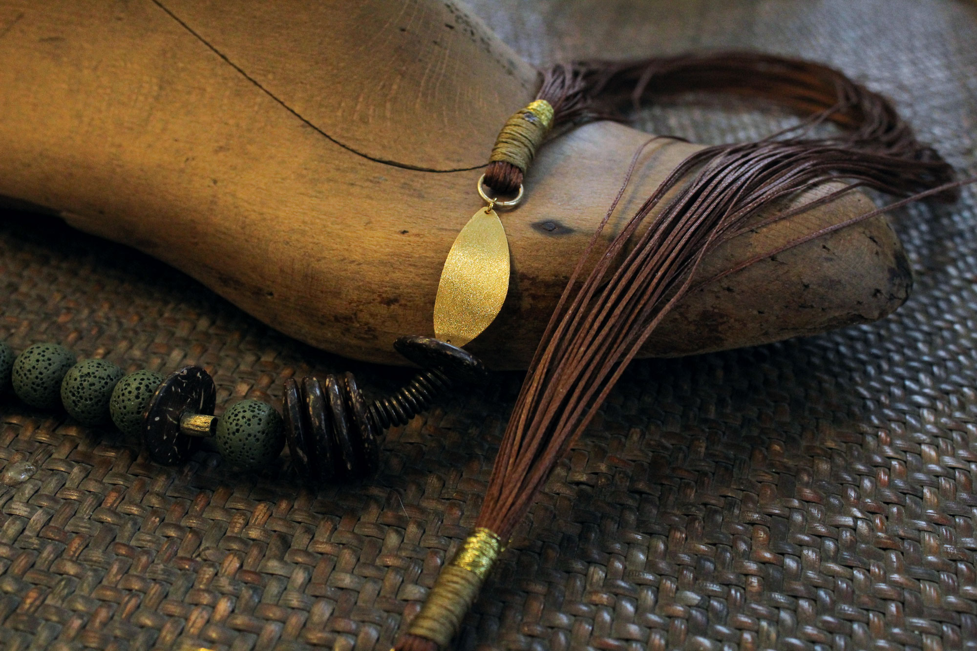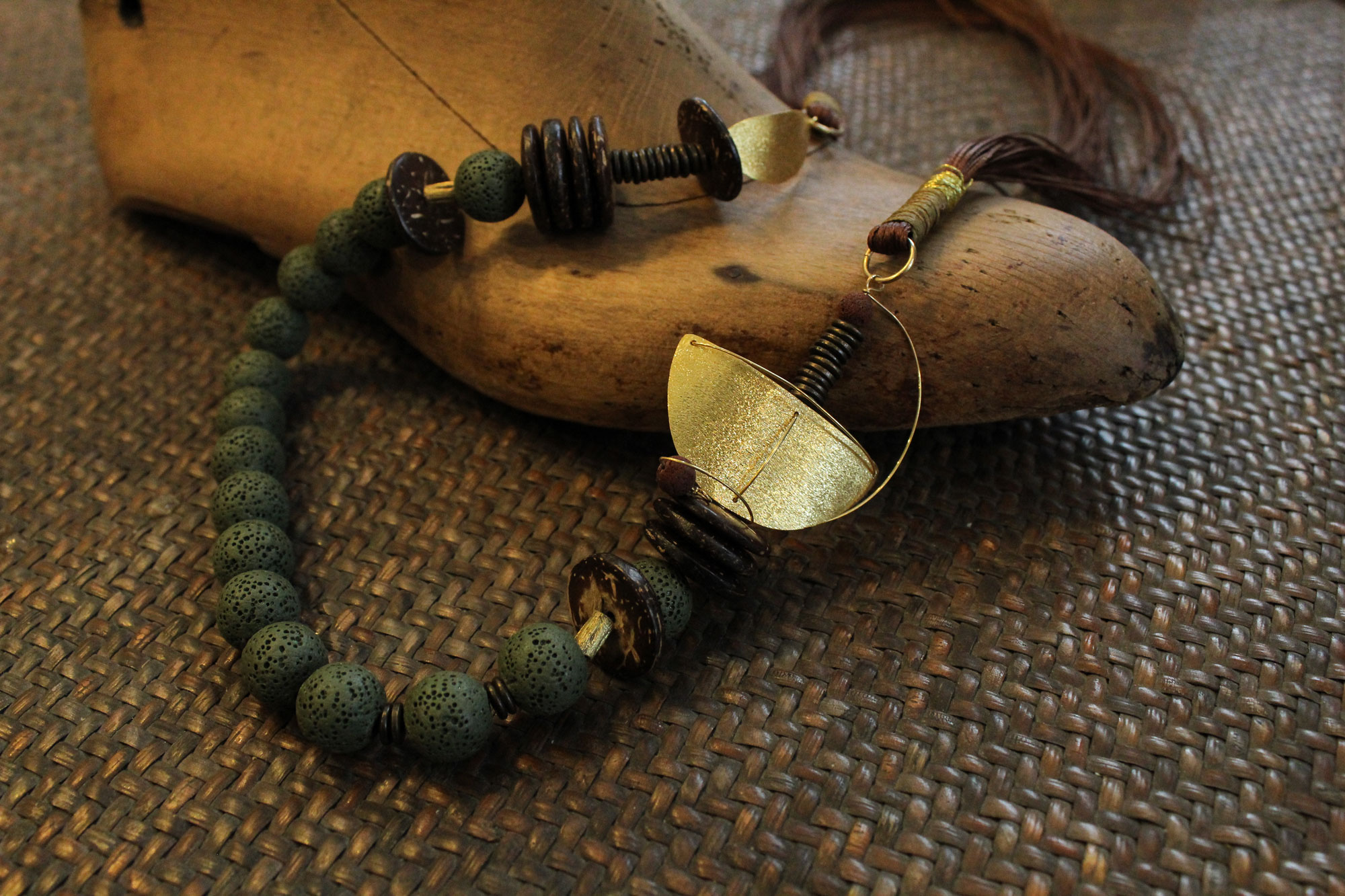 Χειροποίητο, μακρύ κολιέ κατασκευασμένο από κερωμένα καφέ σχοινιά και φυσικά πετρώματα (βαμμένα) σε πράσινη απόχρωση. Κοσμείται από επιχρυσωμένο ορειχάλκινο στοιχείο και στρογγυλά “τσιπ” από ξύλο καρύδας.