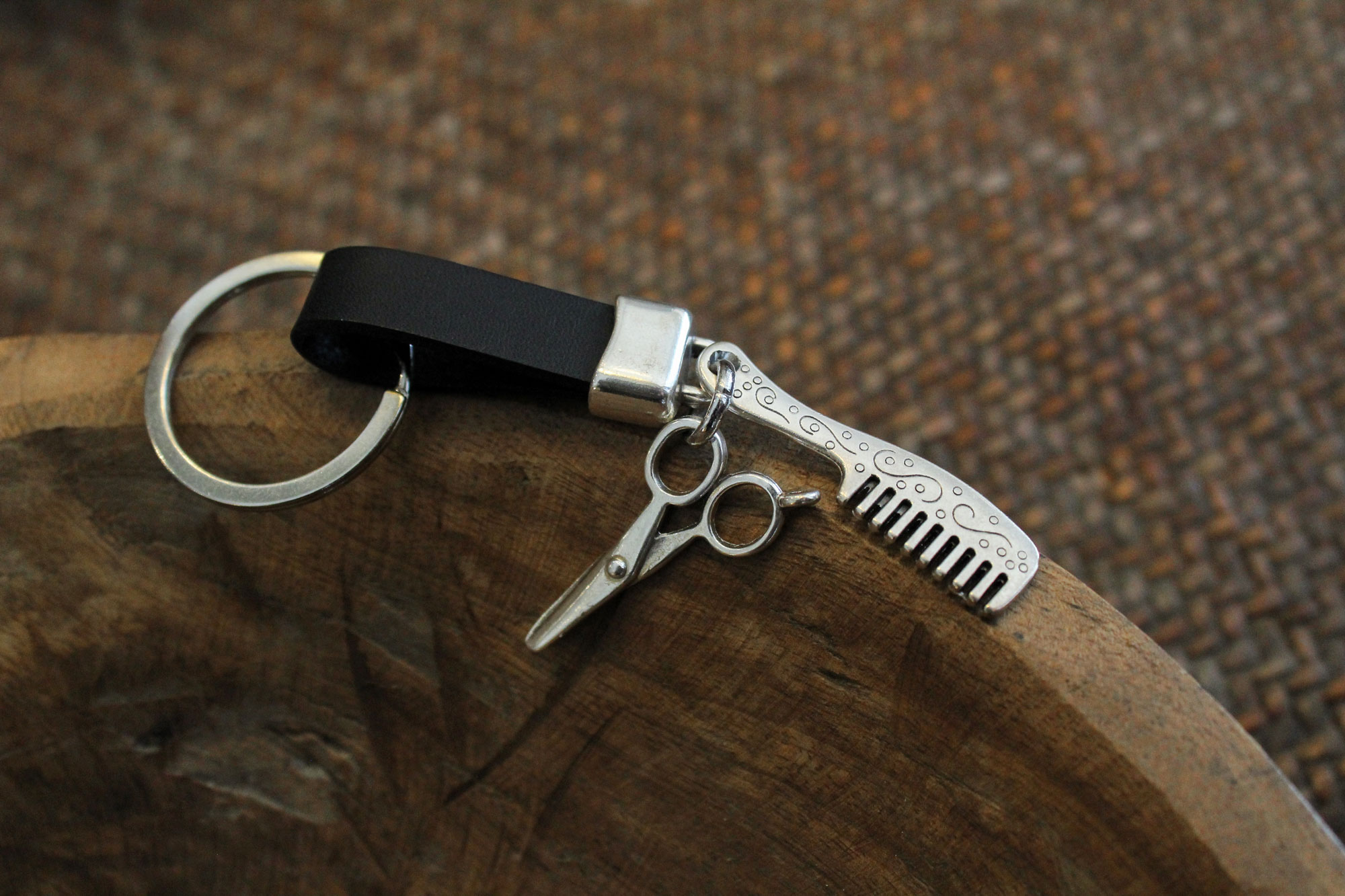 Ένα ιδιαίτερο μπρελόκ με σχέδιο ψαλιδιού και χτένας κατασκευασμένο από κασσίτερο και δεμένο με δέρμα μαύρου χρώματος. Έχει συνολικό μήκος 11 εκατοστά.
