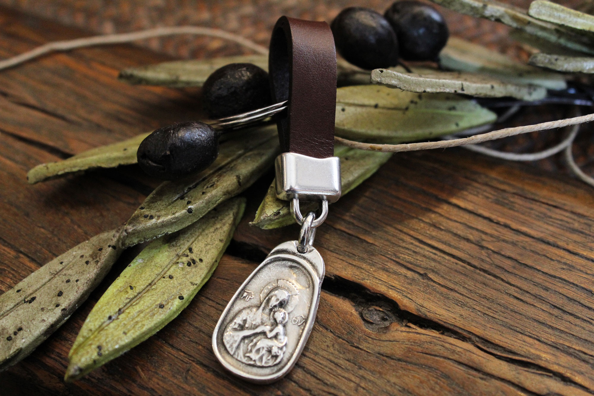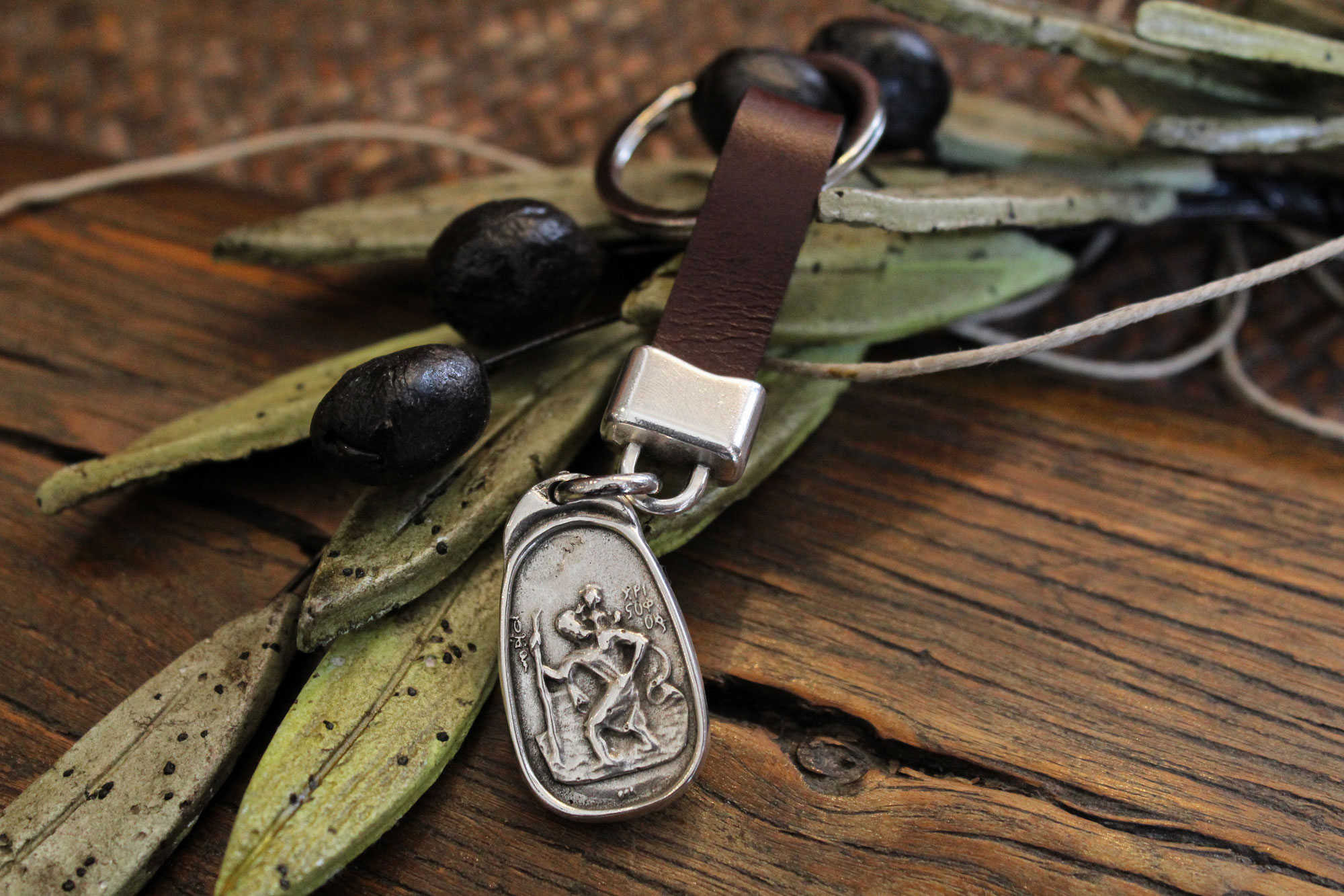 Ένα ιδιαίτερο μπρελόκ με κρεμασμένο φυλαχτό διπλής όψης (Παναγία – Άγιος Χριστόφορος)  κατασκευασμένο από κασσίτερο και δεμένο με δέρμα καφέ χρώματος. Έχει συνολικό μήκος 10.5 εκατοστά.