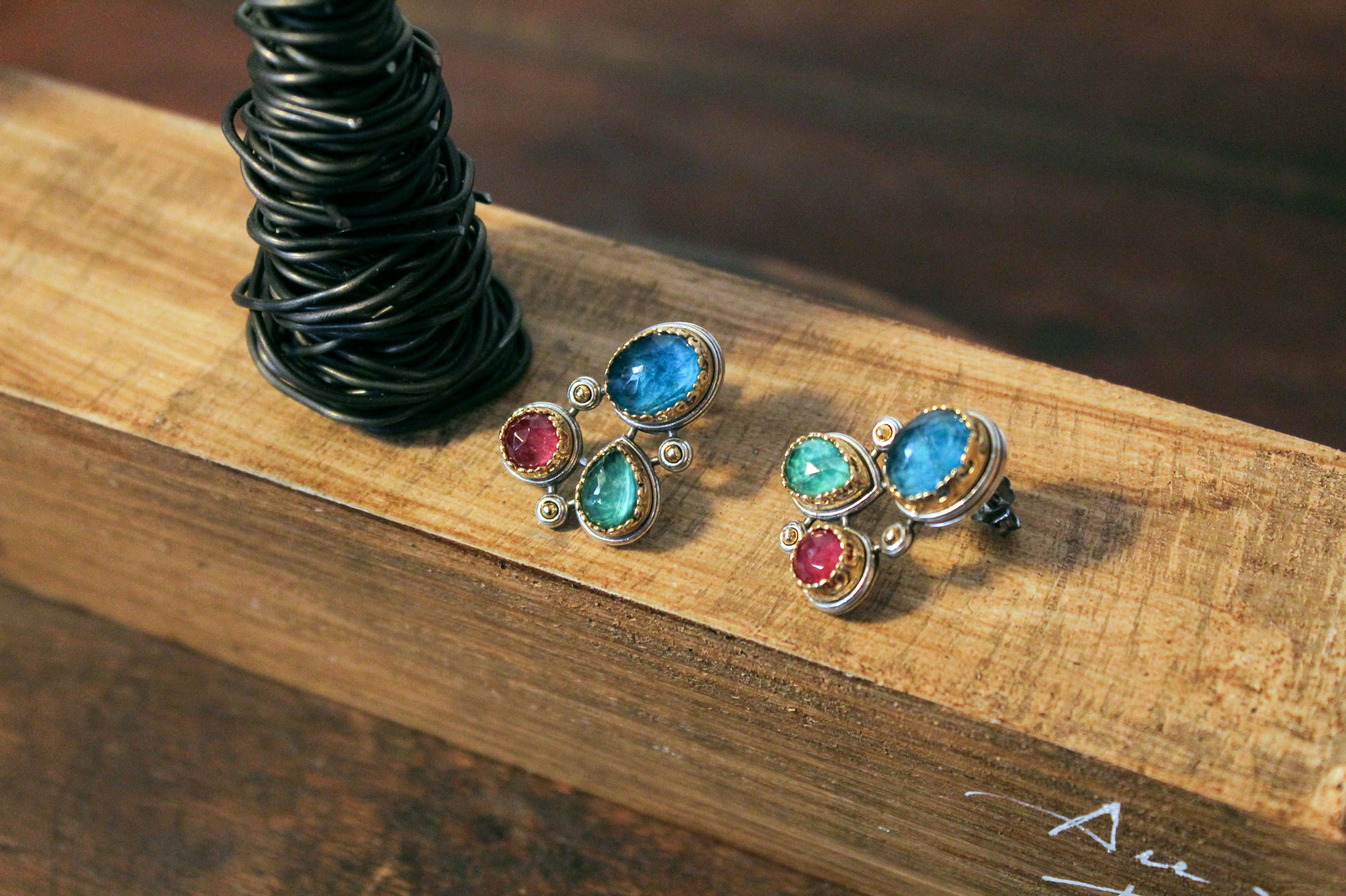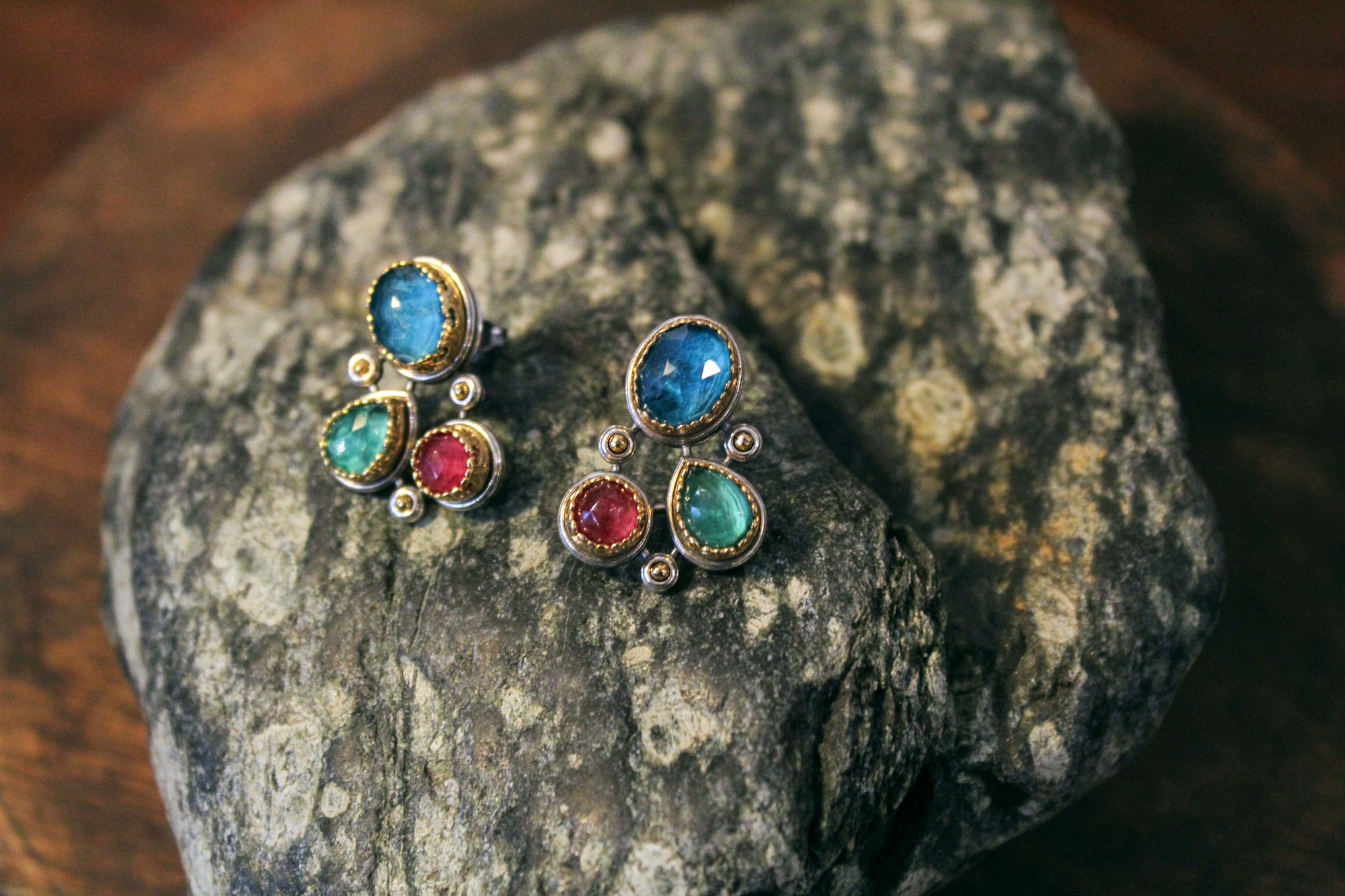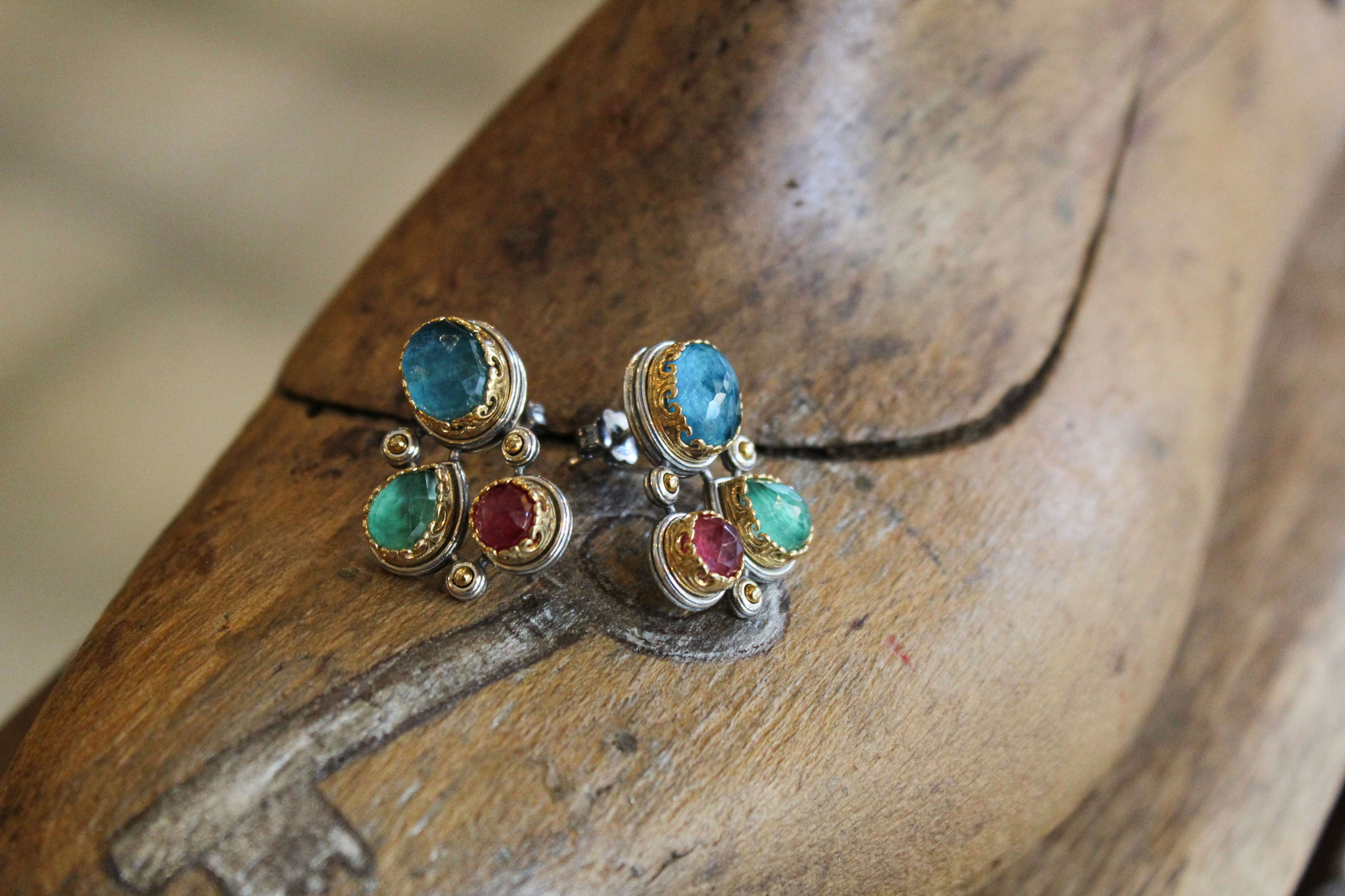 Laskaridis Jewelry χειροποίητα σκουλαρίκια κατασκευασμένα από ασήμι και επίχρυσα μέρη με συνδυασμό από ντουμπλέτες πετρωμάτων (απατίτης, μαλαχίτης και ρουμπίνι).