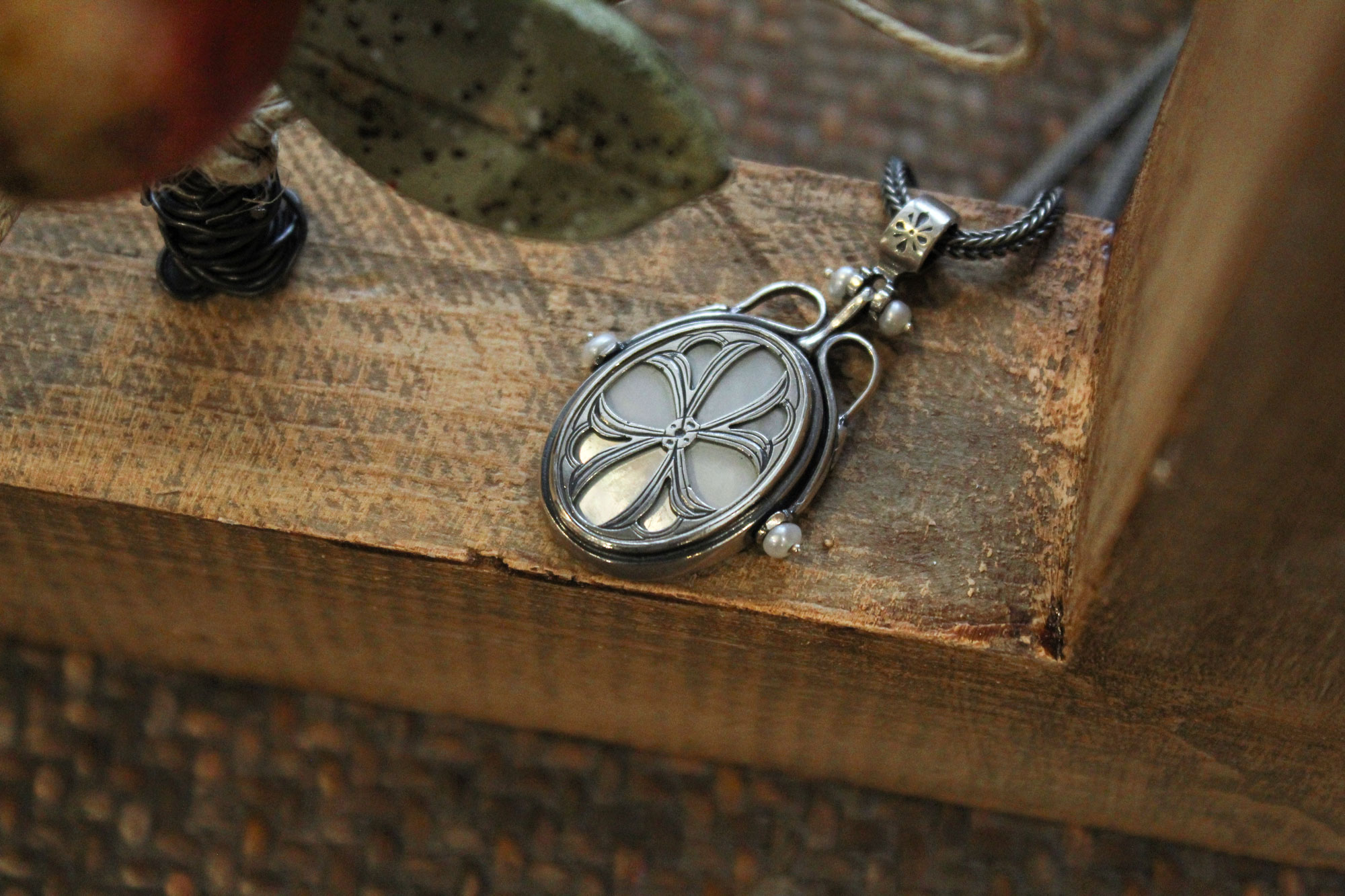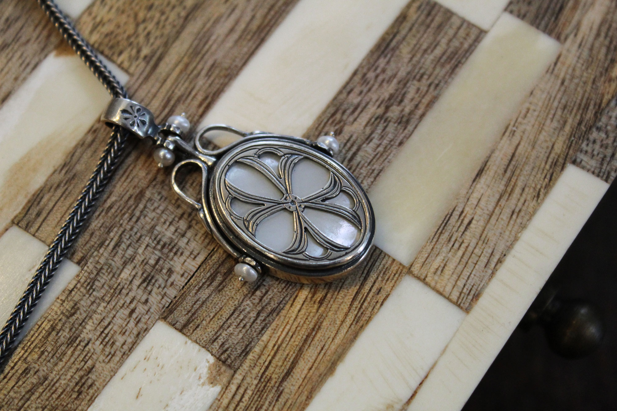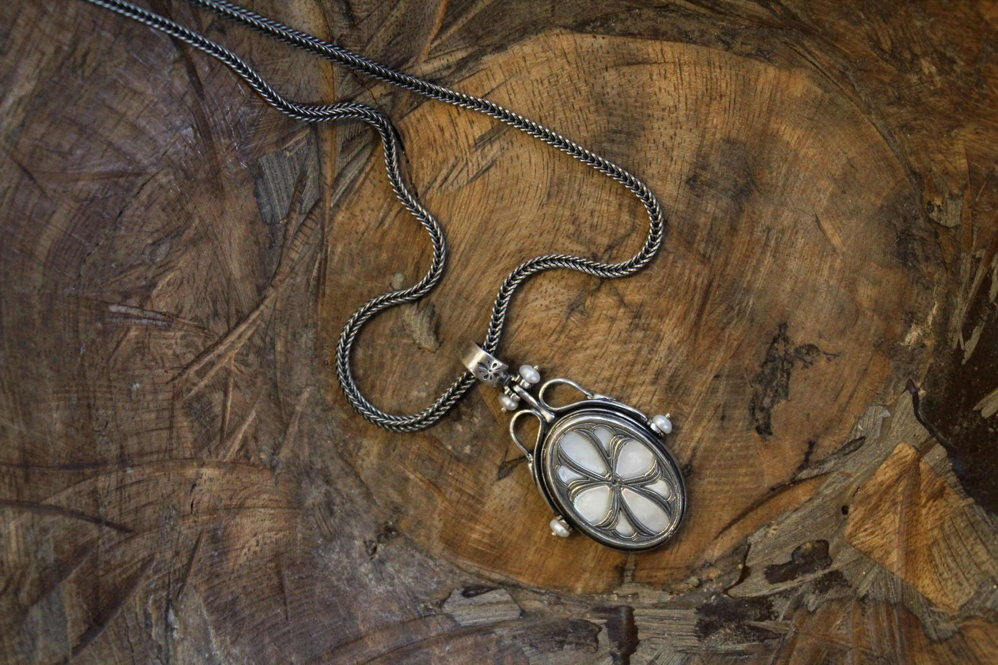 Koukos Jewellery χειροποίητο μενταγιόν κατασκευασμένο από ασήμι με εντυπωσιακό μοτίβο και πέτρωμα από όστρακο (Mother of Pearl) με μικρά μαργαριτάρια καλλιέργειας στις άκρες του.