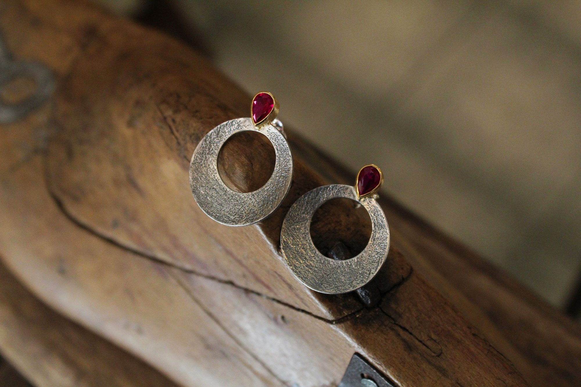 Μοναδικά, χειροποίητα σκουλαρίκια κατασκευασμένα από οξειδωμένο ασήμι με επίχρυσα μέρη και πετρώματα ζιρκόν σε φούξια απόχρωση.