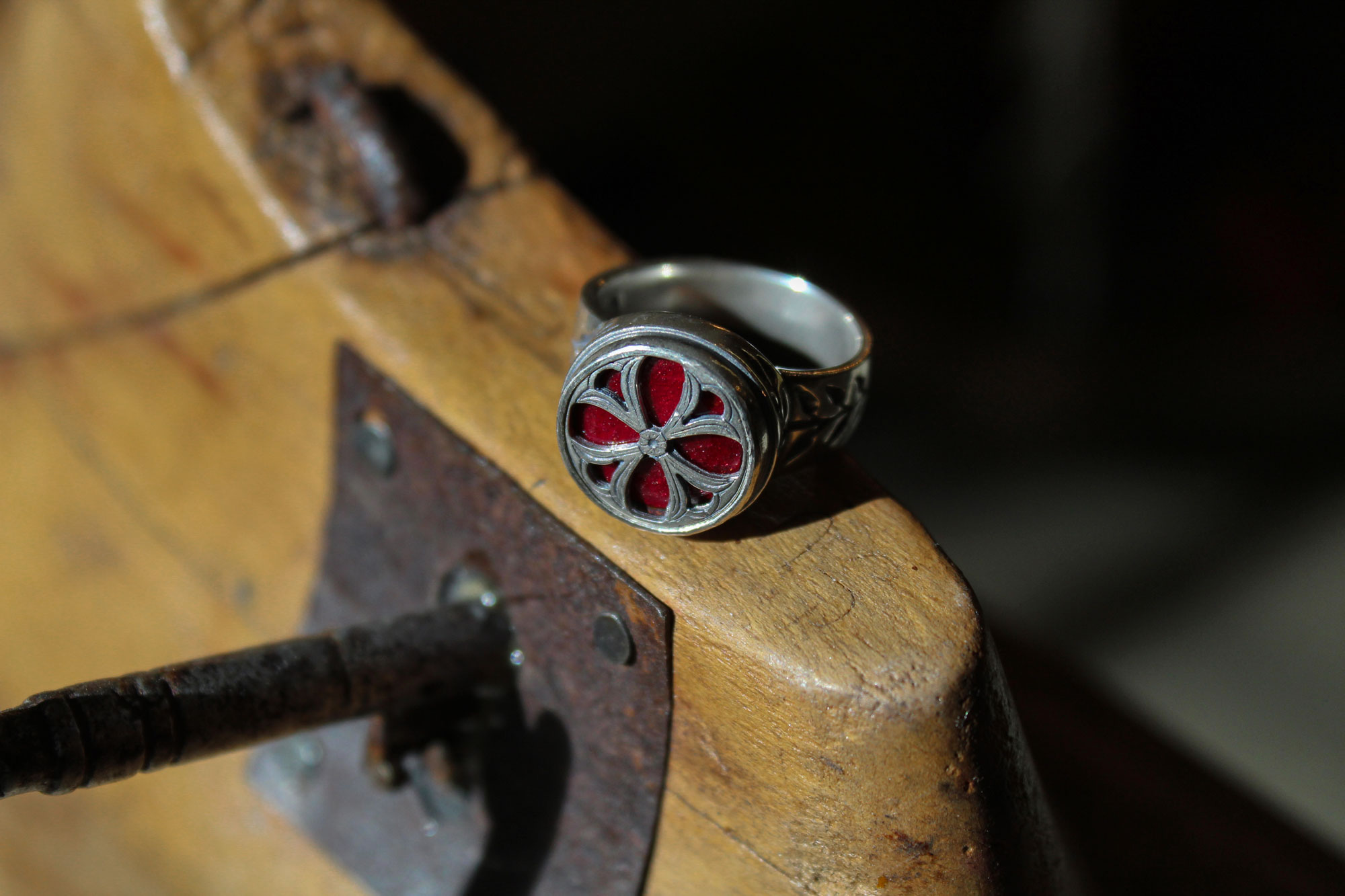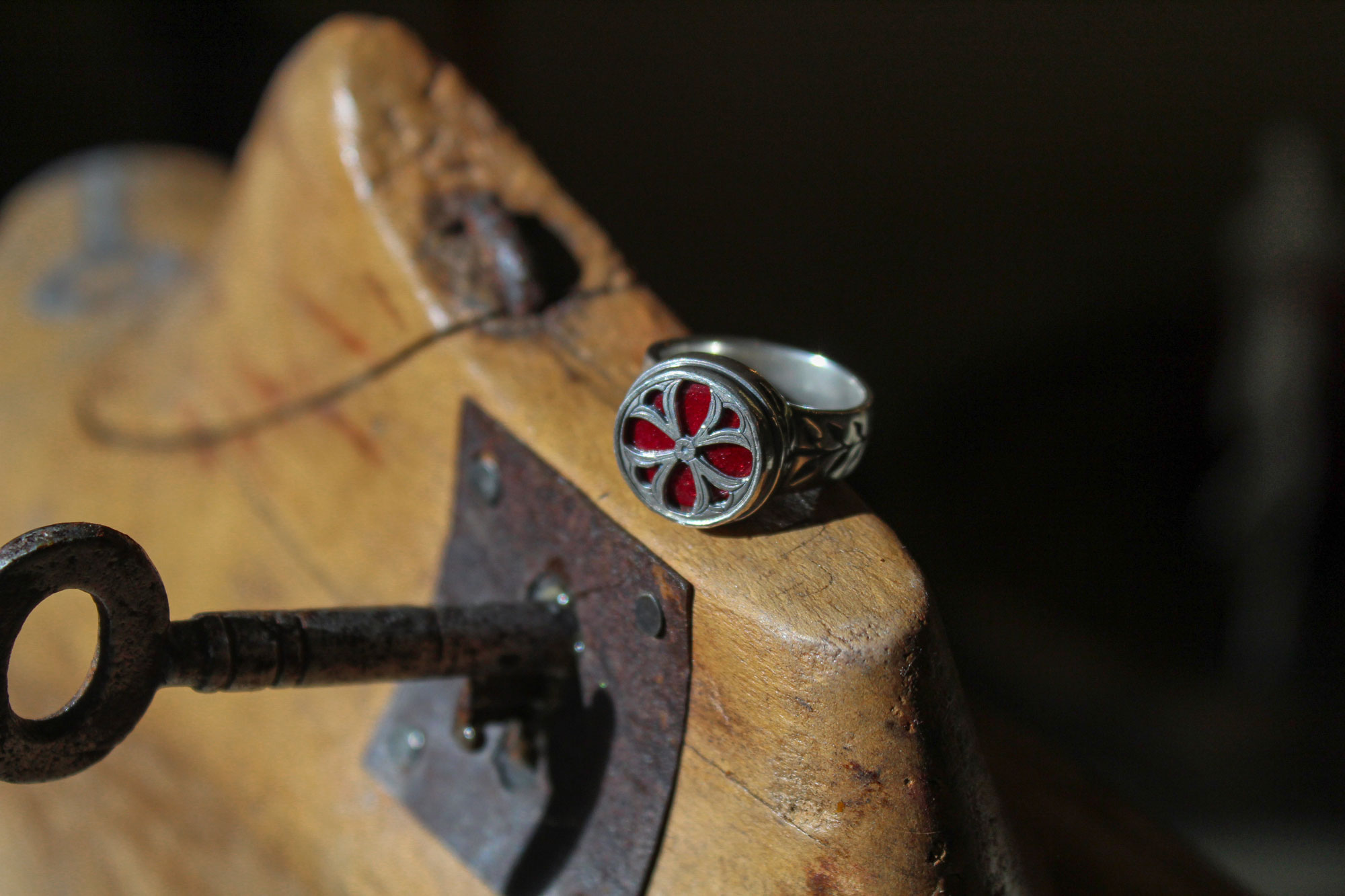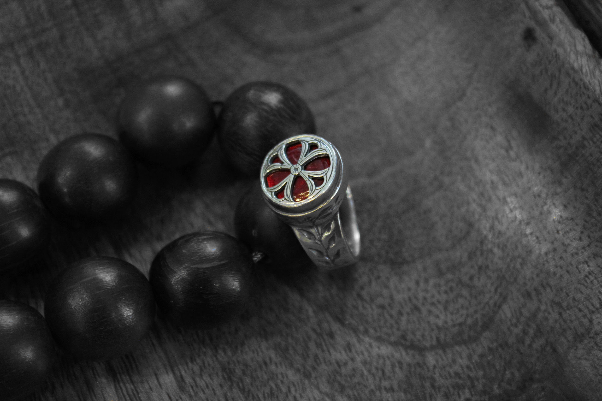 Χειροποίητο δαχτυλίδι Koukos Jewellery κατασκευασμένο από ασήμι με εγχάρακτο σχέδιο σαν λουλούδι με επίστρωση κόκκινου σμάλτου.