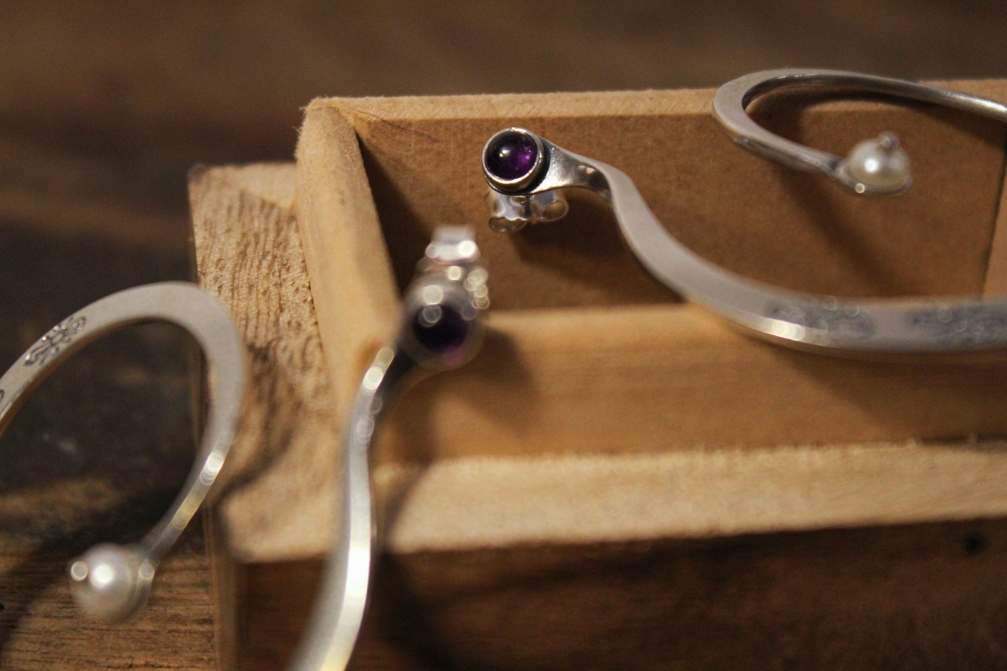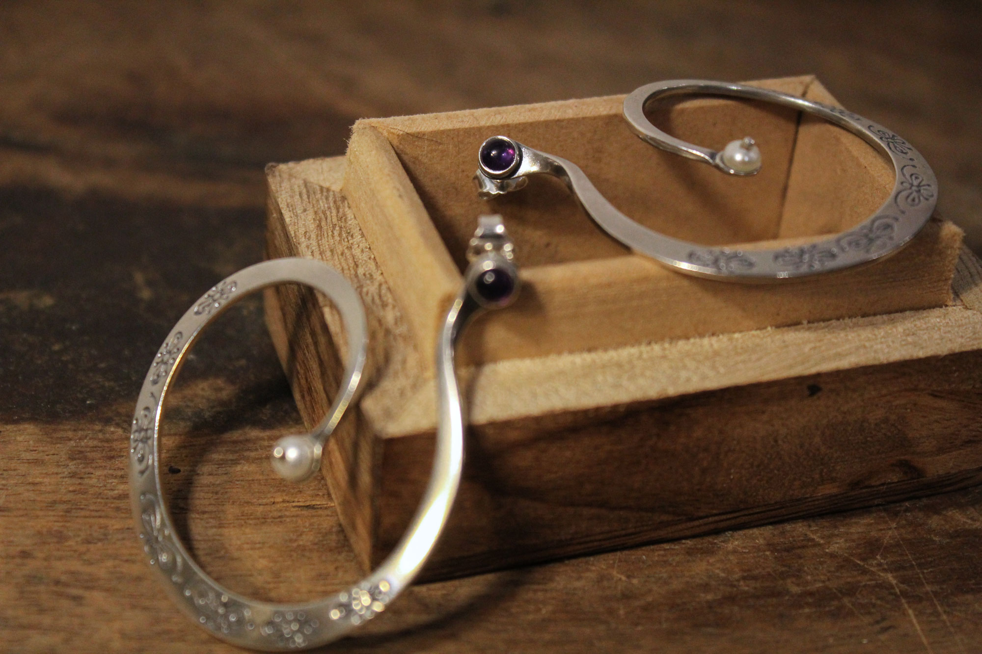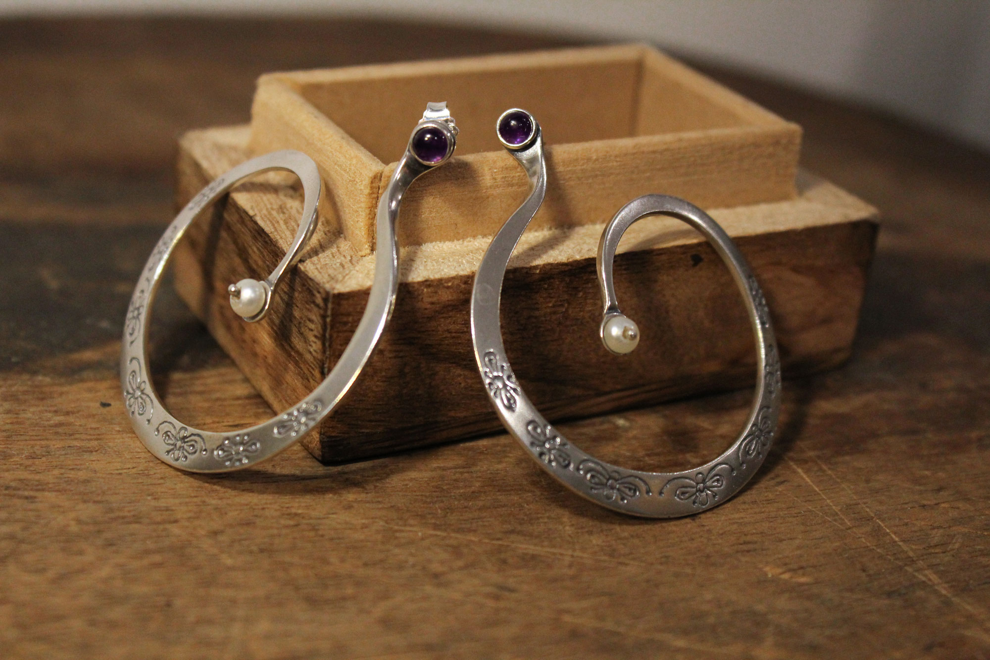 Καρφωτά σκουλαρίκια που δημιουργούν έναν ανοιχτό ανομοιόμορφο κύκλο με εγχάρακτα σχέδια στο κάτω μέρος και δύο μικρές πέτρες αμέθυστου και μαργαριταριού στην αρχή και στο τέλος του σκουλαρικιού αντίστοιχα.