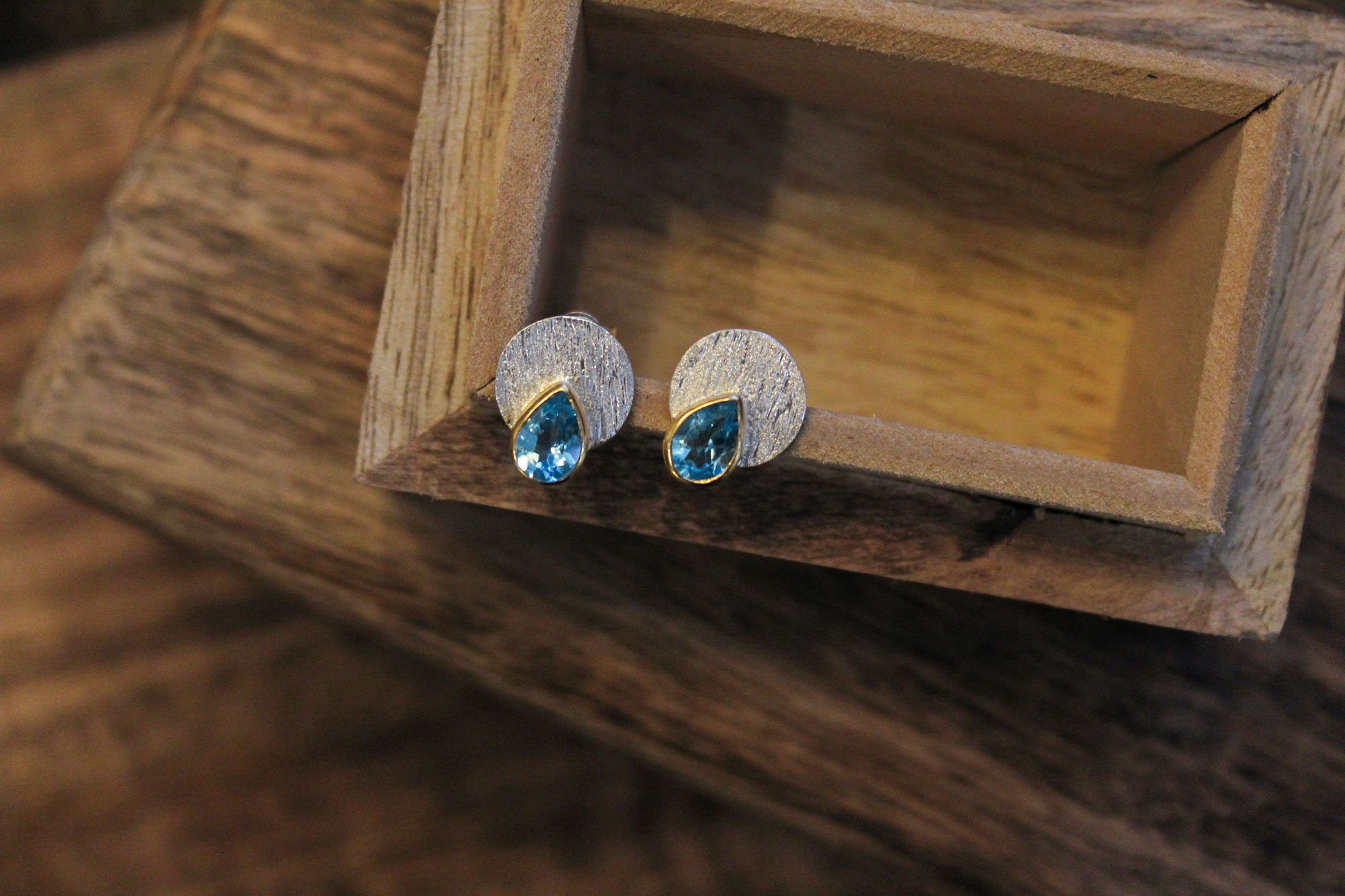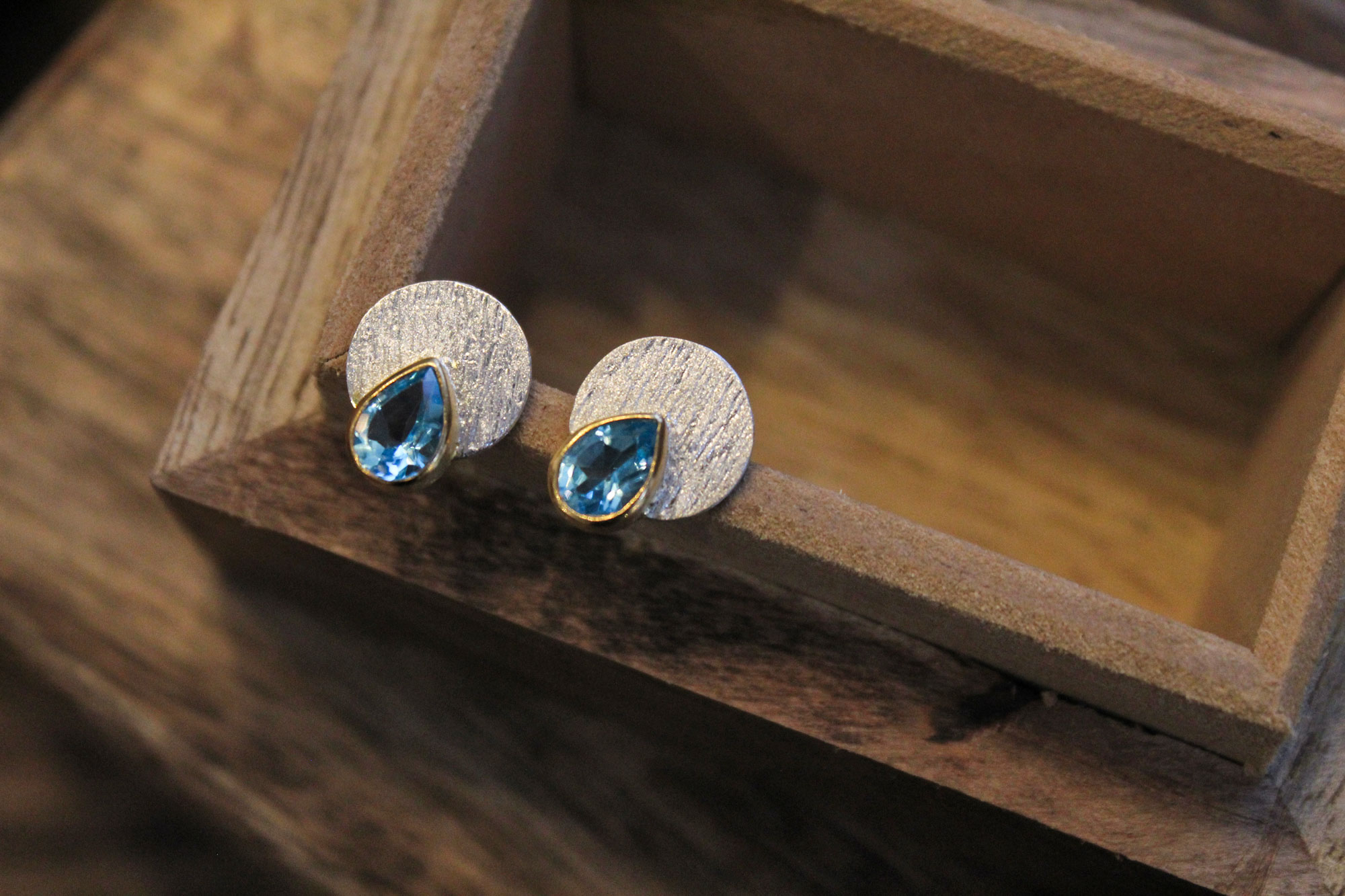 Χειροποίητα σκουλαρίκια κατασκευασμένα από ασήμι με επίχρυσα μέρη και μοναδικά πετρώματα Swiss Topaz σε σχήμα σταγόνας.