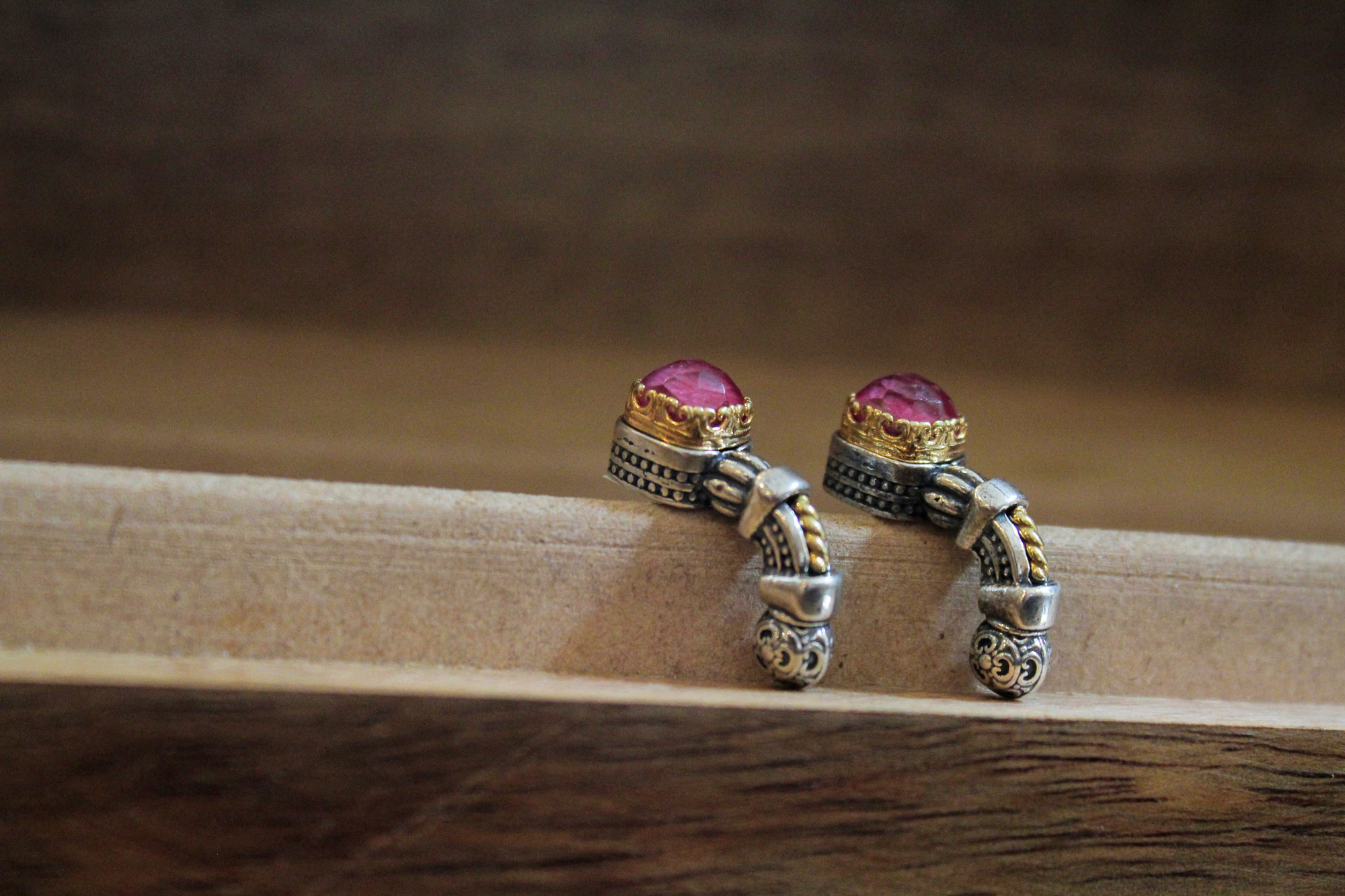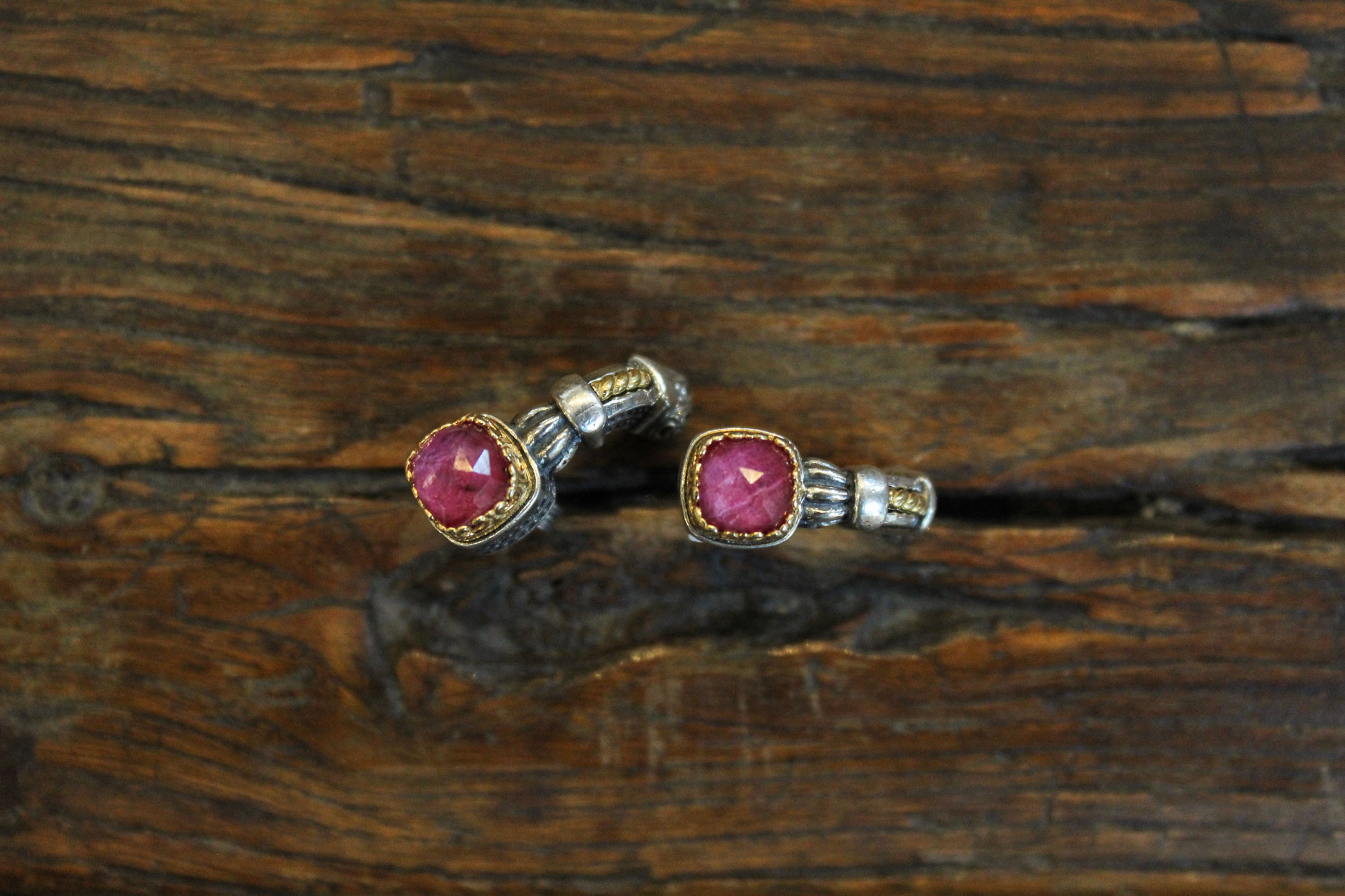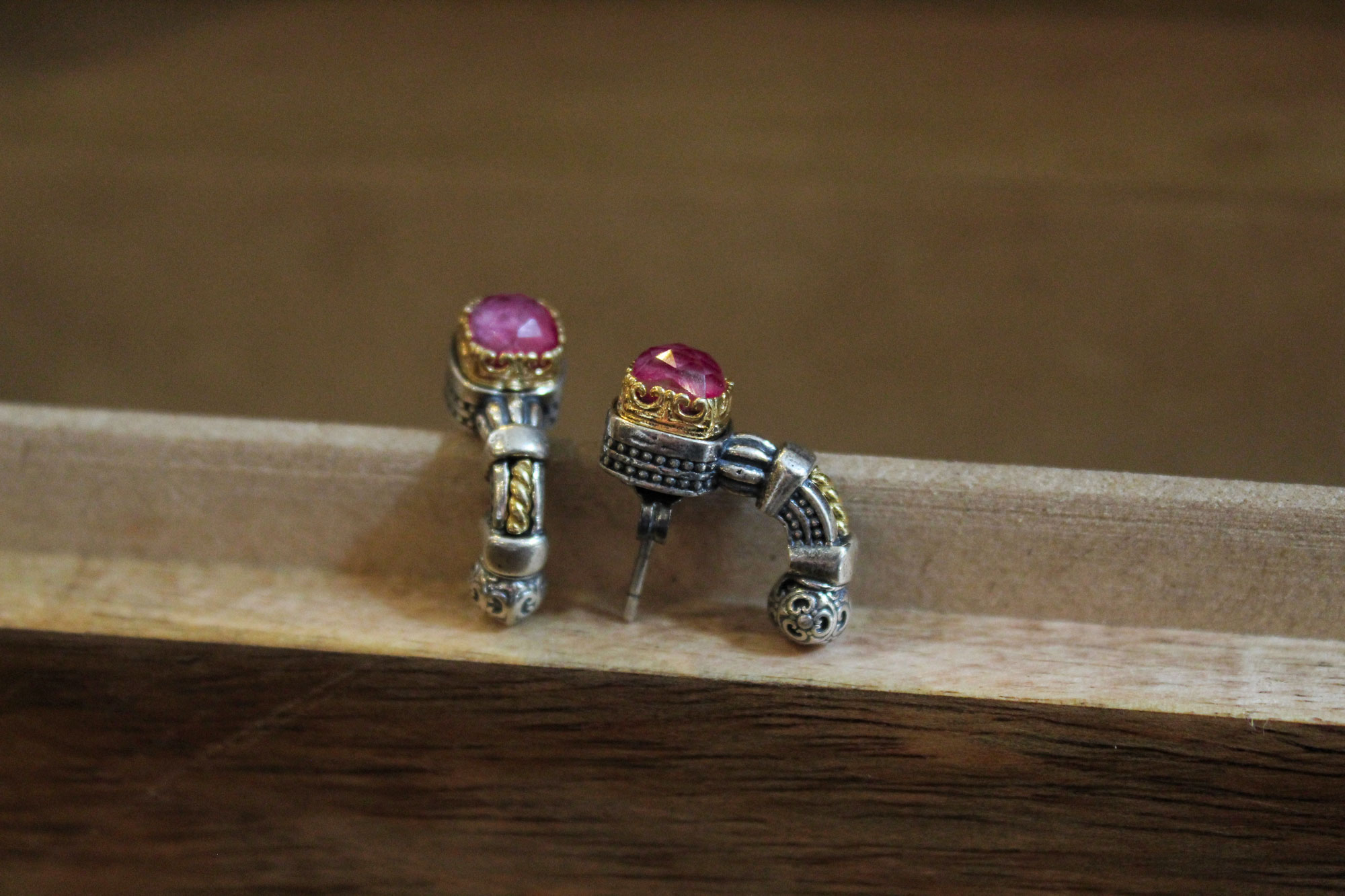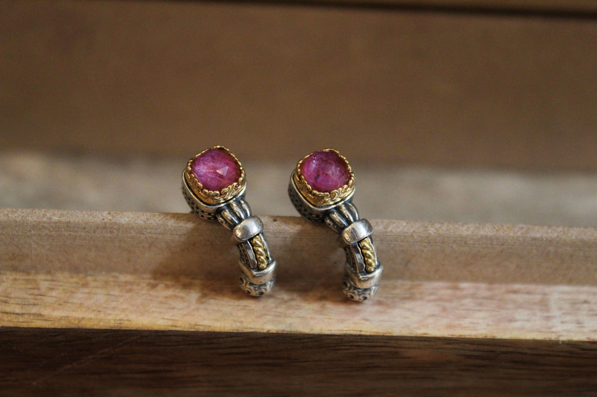 Laskaridis Jewelry χειροποίητα σκουλαρίκια κατασκευασμένα από ασήμι με επίχρυσα μέρη σε πρωτότυπο σχεδιασμό με ντουμπλέτες ρουμπινιού.