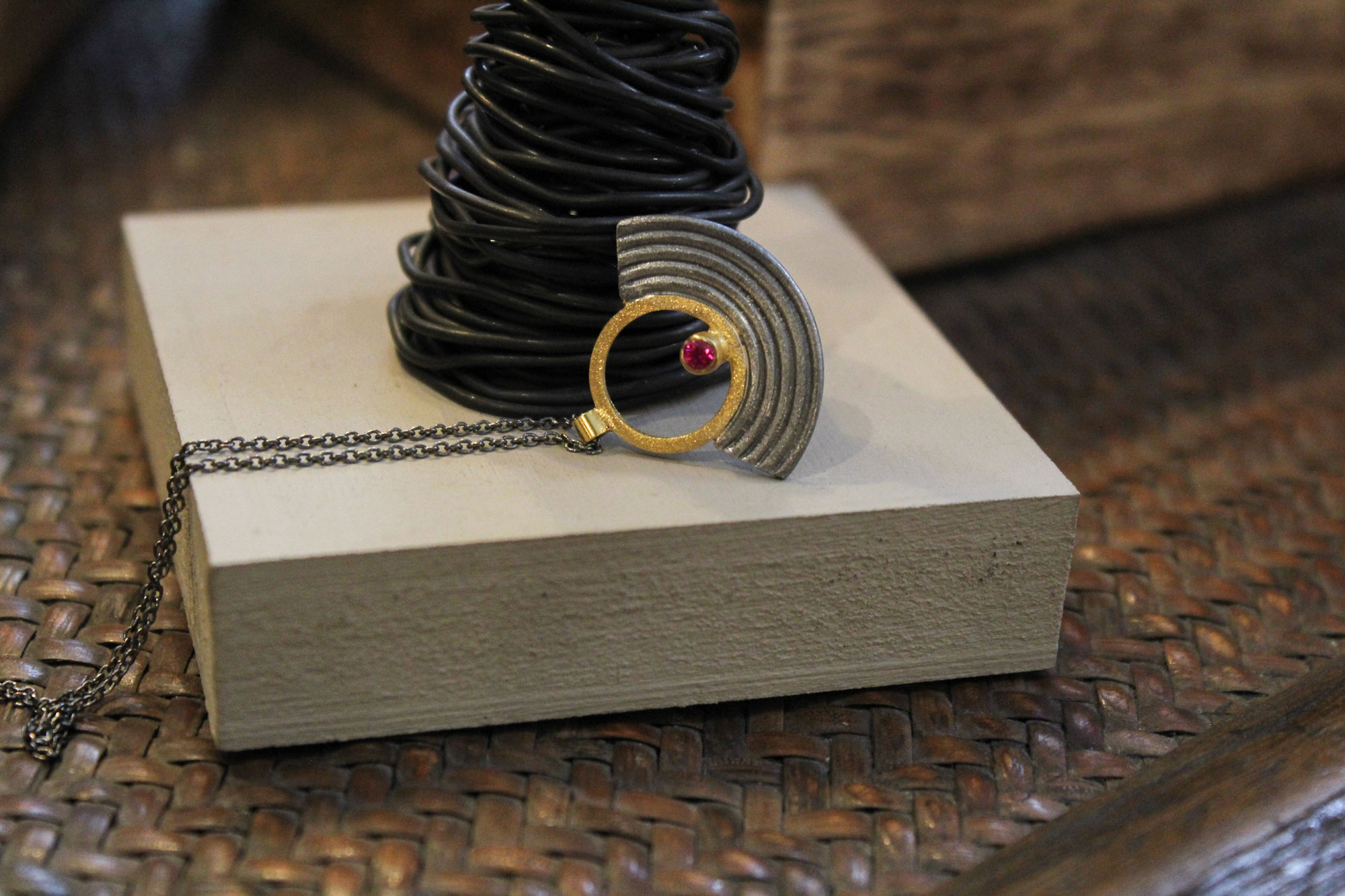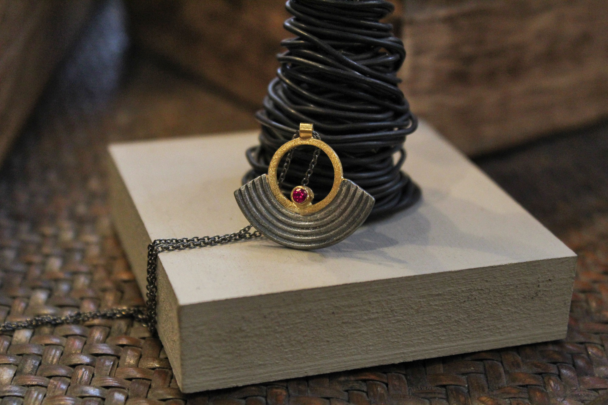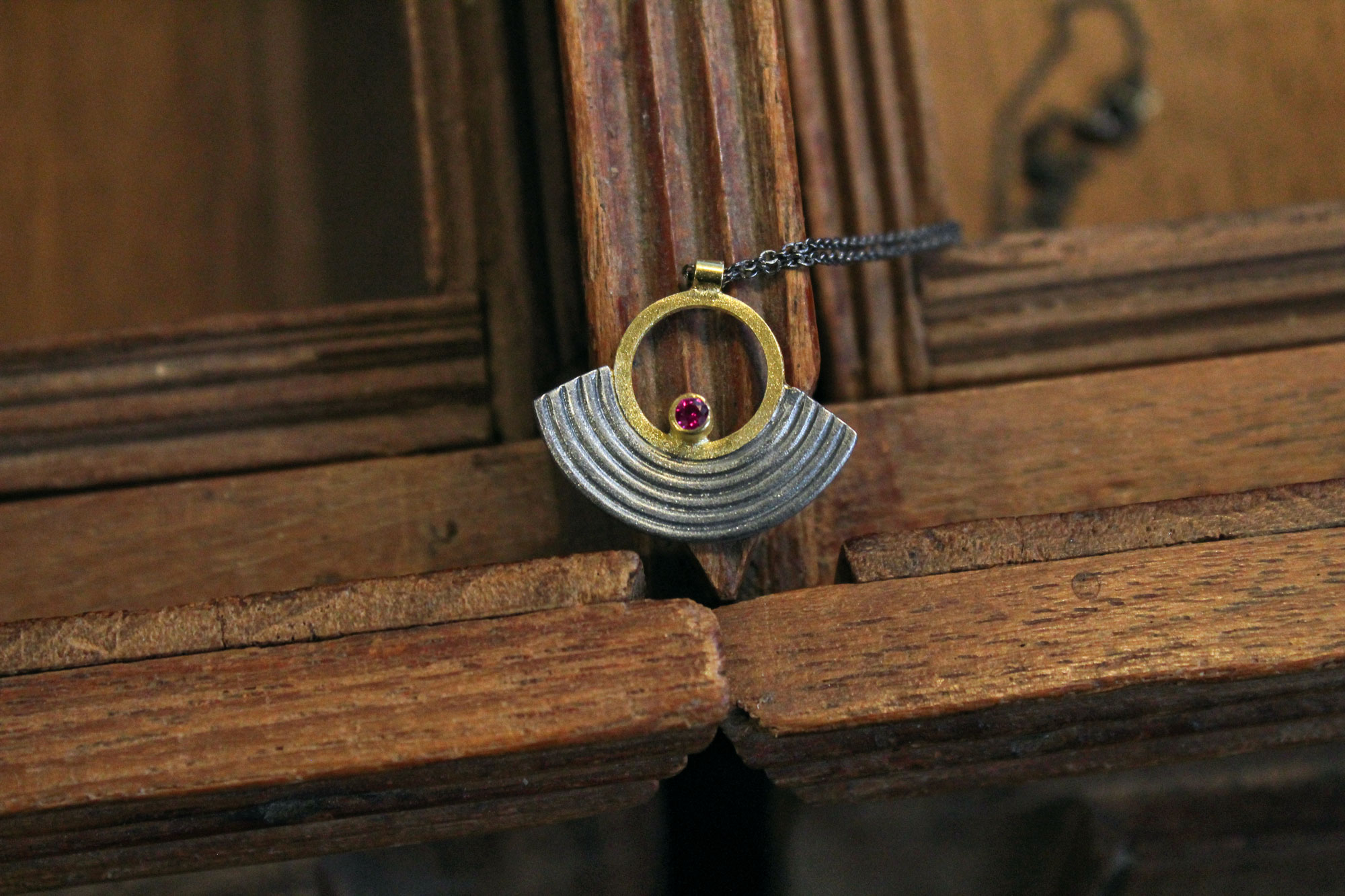 Χειροποίητο κολιέ κατασκευασμένο από οξειδωμένο ασήμι με επίχρυσα μέρη σε μοναδικό ανάγλυφο σχεδιασμό. Κοσμείται από μικρό φούξια πέτρωμα ζιρκόν.