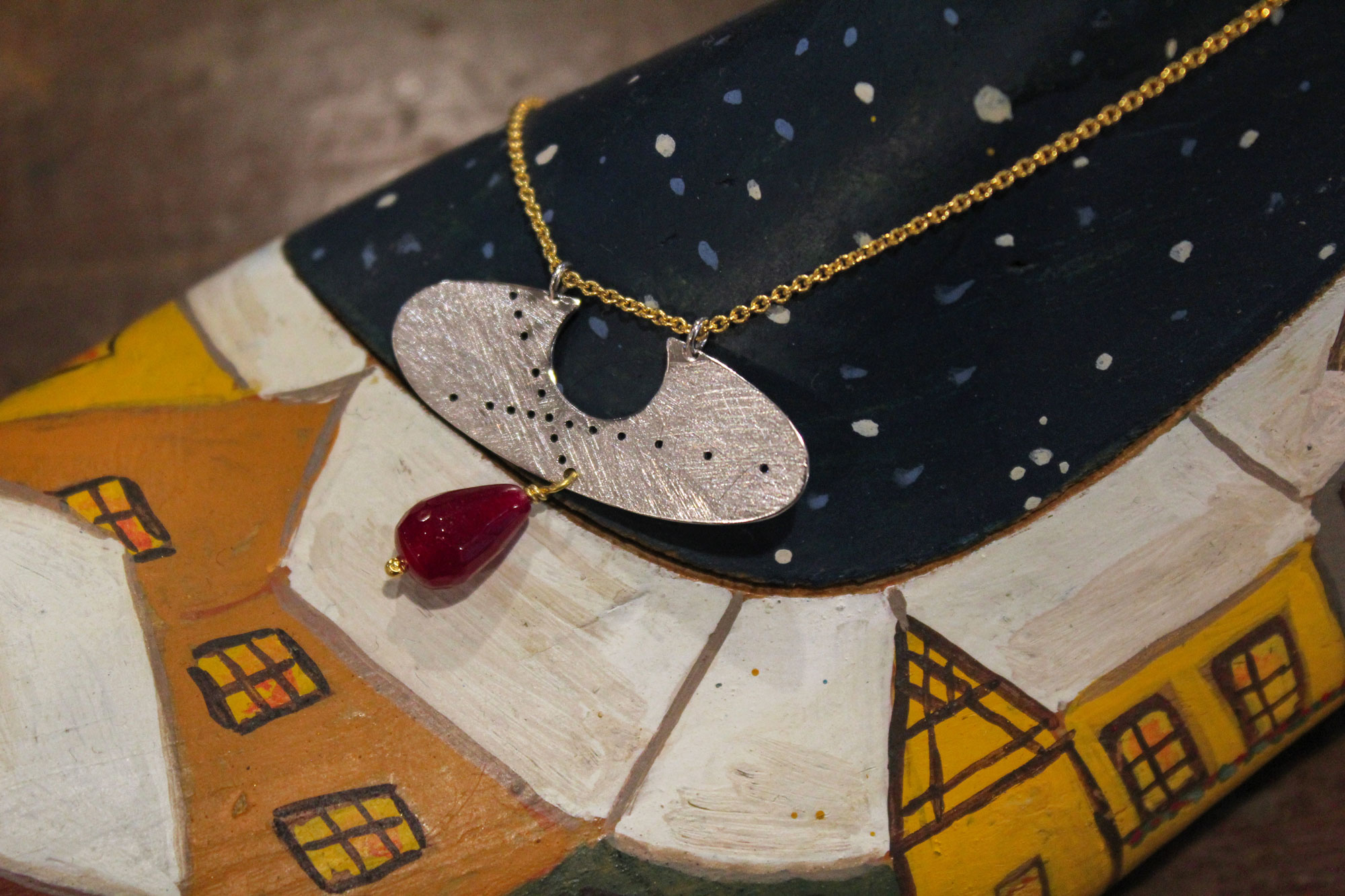CHRYSOULA SOFOU χειροποίητο κολιέ κατασκευασμένο από ασήμι με λευκή επιροδίωση και επίχρυση αλυσίδα 50cm. Κοσμείται από ταγιέ σταγόνα κόκκινου Jade.