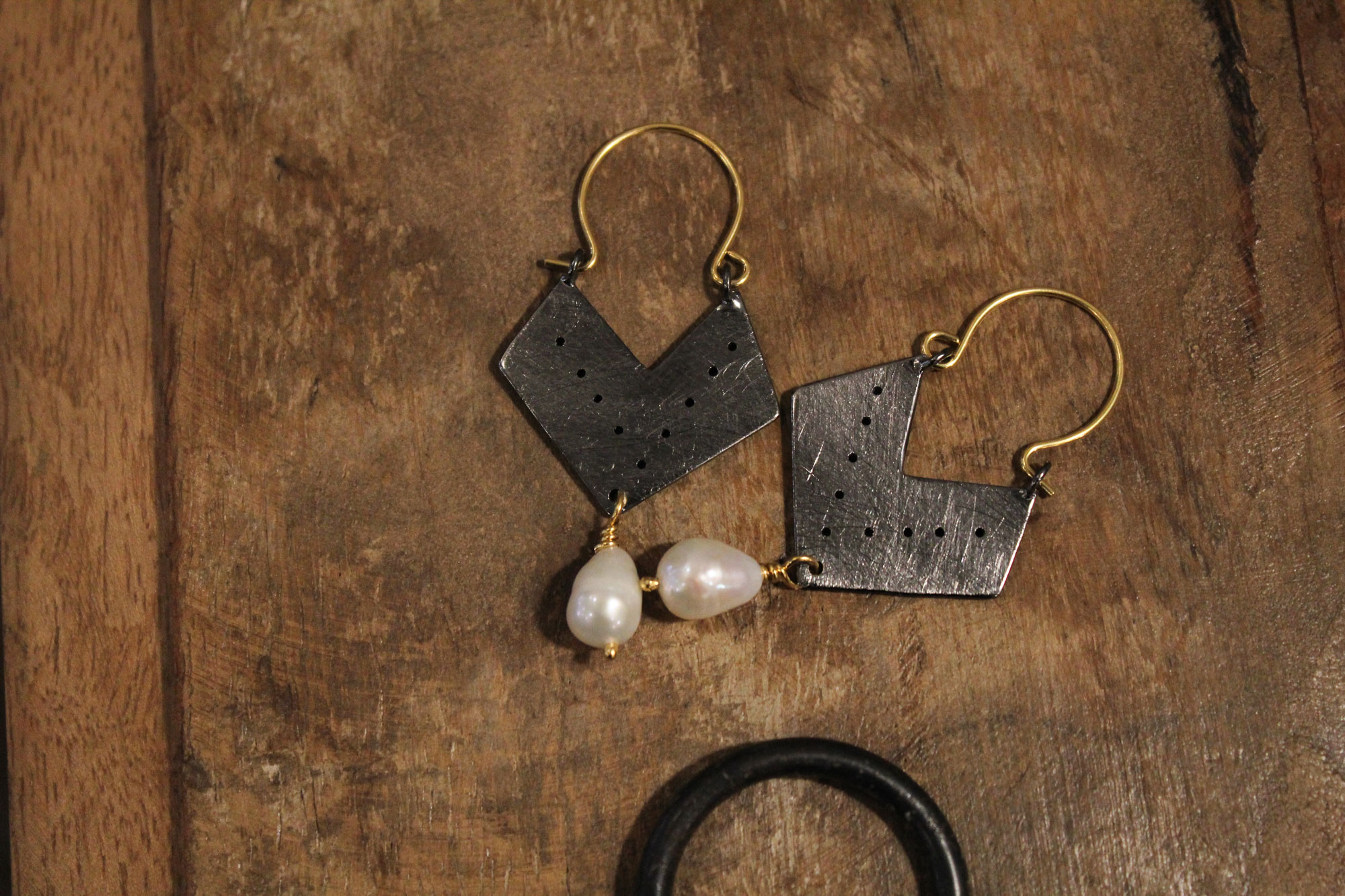 CHRYSOULA SOFOU μοναδικά σκουλαρίκια σε γεωμετρικό σχεδιασμό κατασκευασμένα από μαύρο, επιροδιωμένο ασήμι και επίχρυσα μέρη. Κοσμείται από μαργαριτάρια καλλιέργειας.