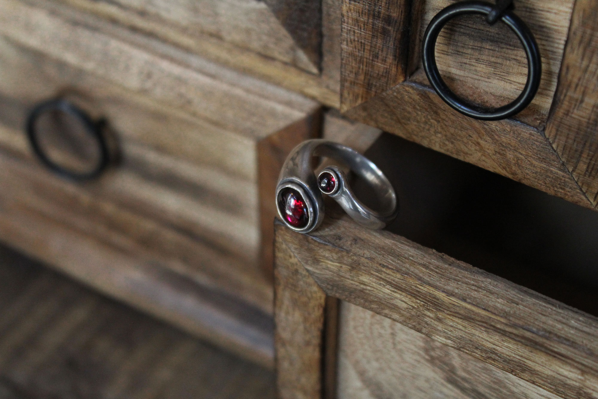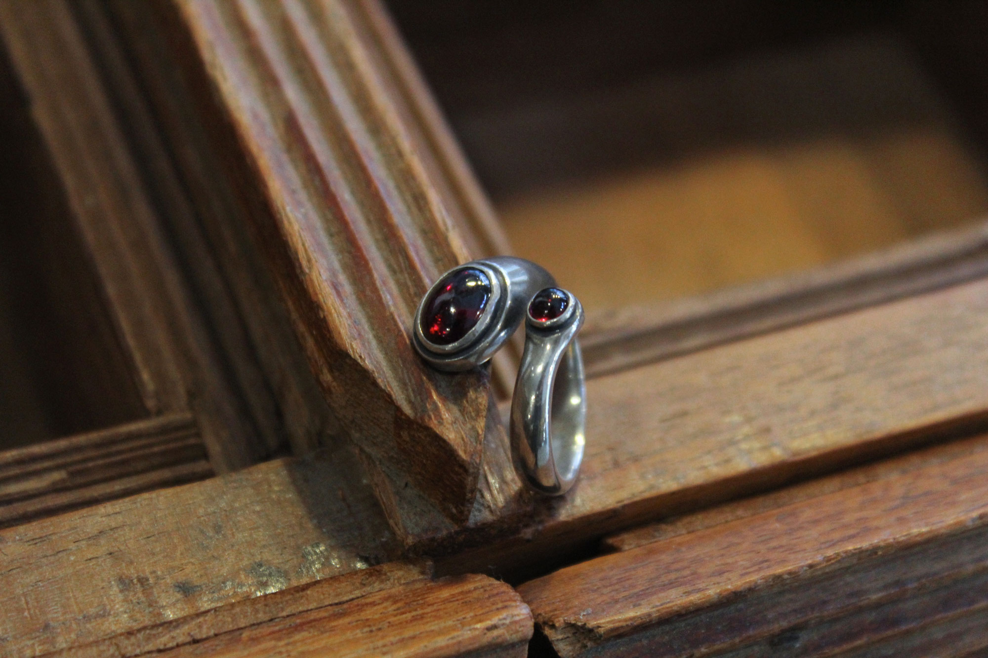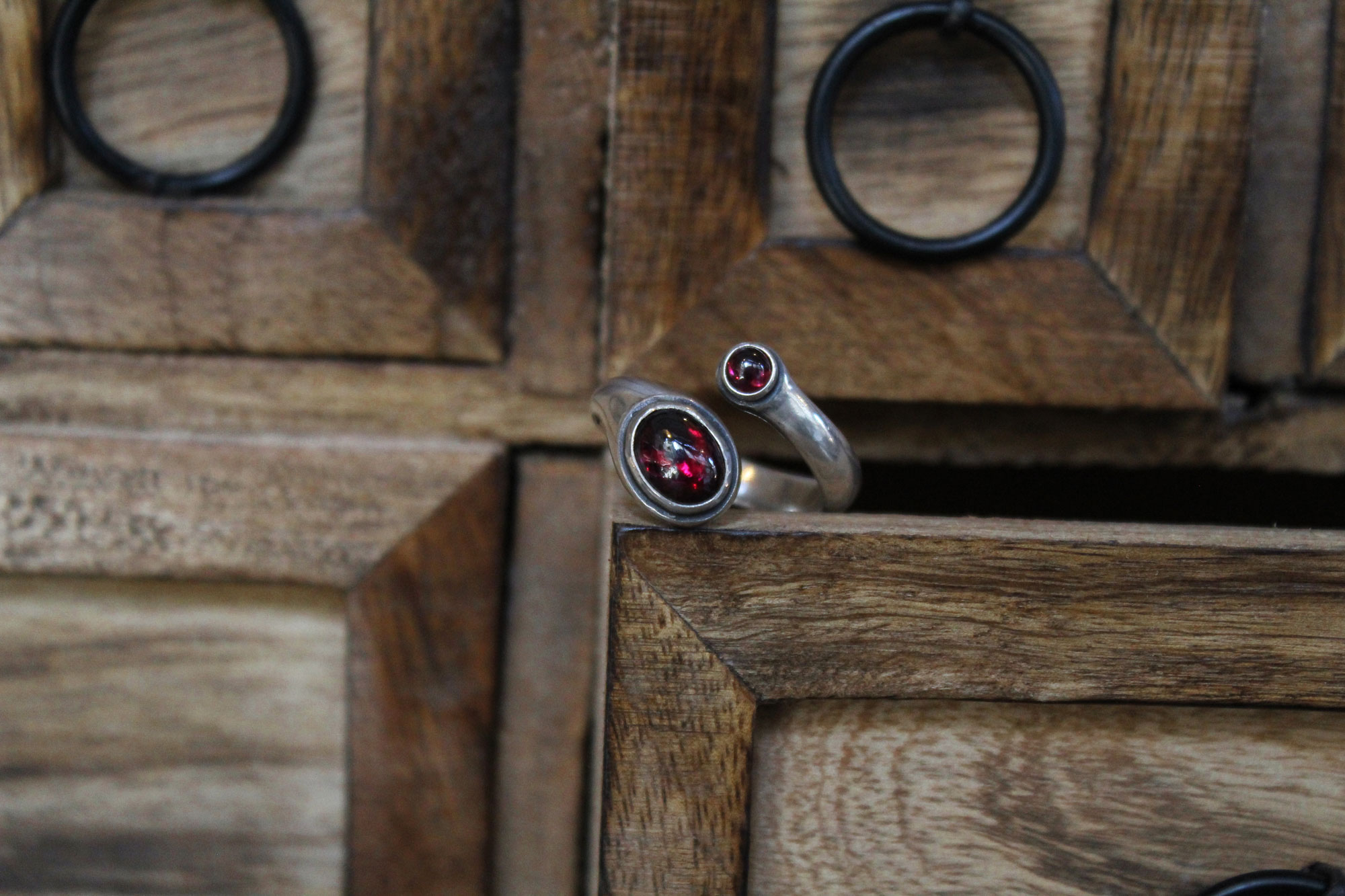 Koukos Jewellery χειροποίητο δαχτυλίδι σε μίνιμαλ γραμμή κατασκευασμένο από ασήμι με πετρώματα από γρανάδα.