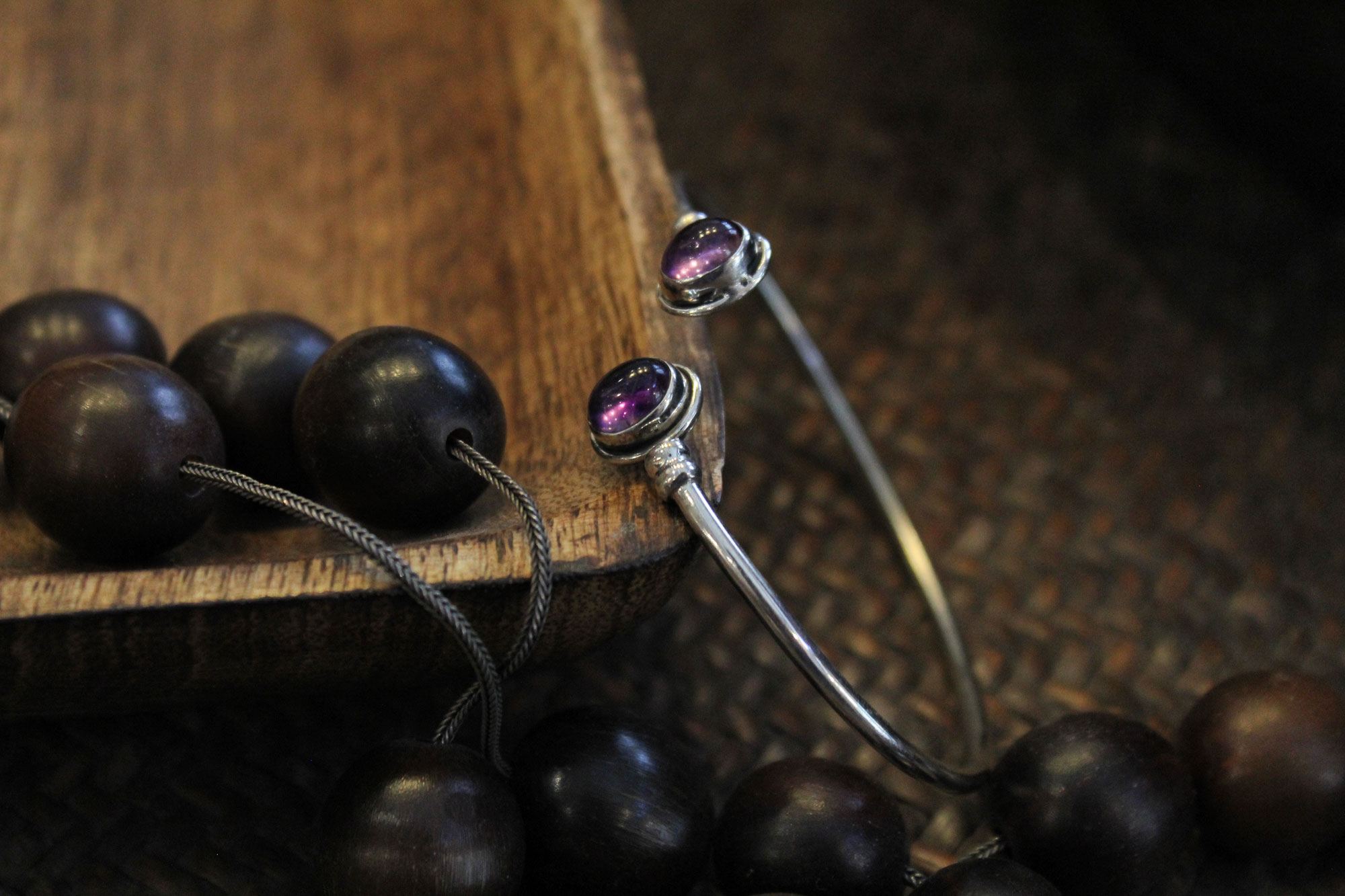 Ασημένια οβάλ χειροπέδα σε λιτή γραμμή με μοναδικά πετρώματα αμέθυστου.