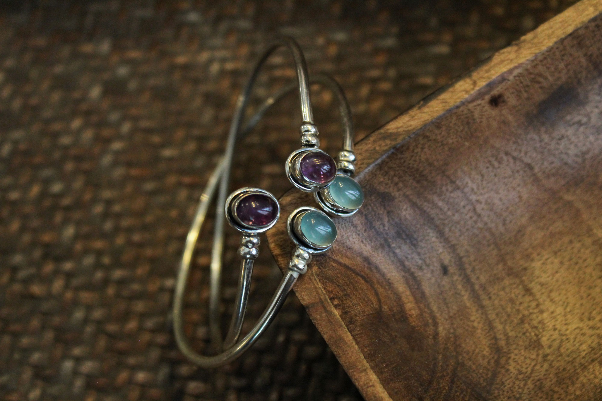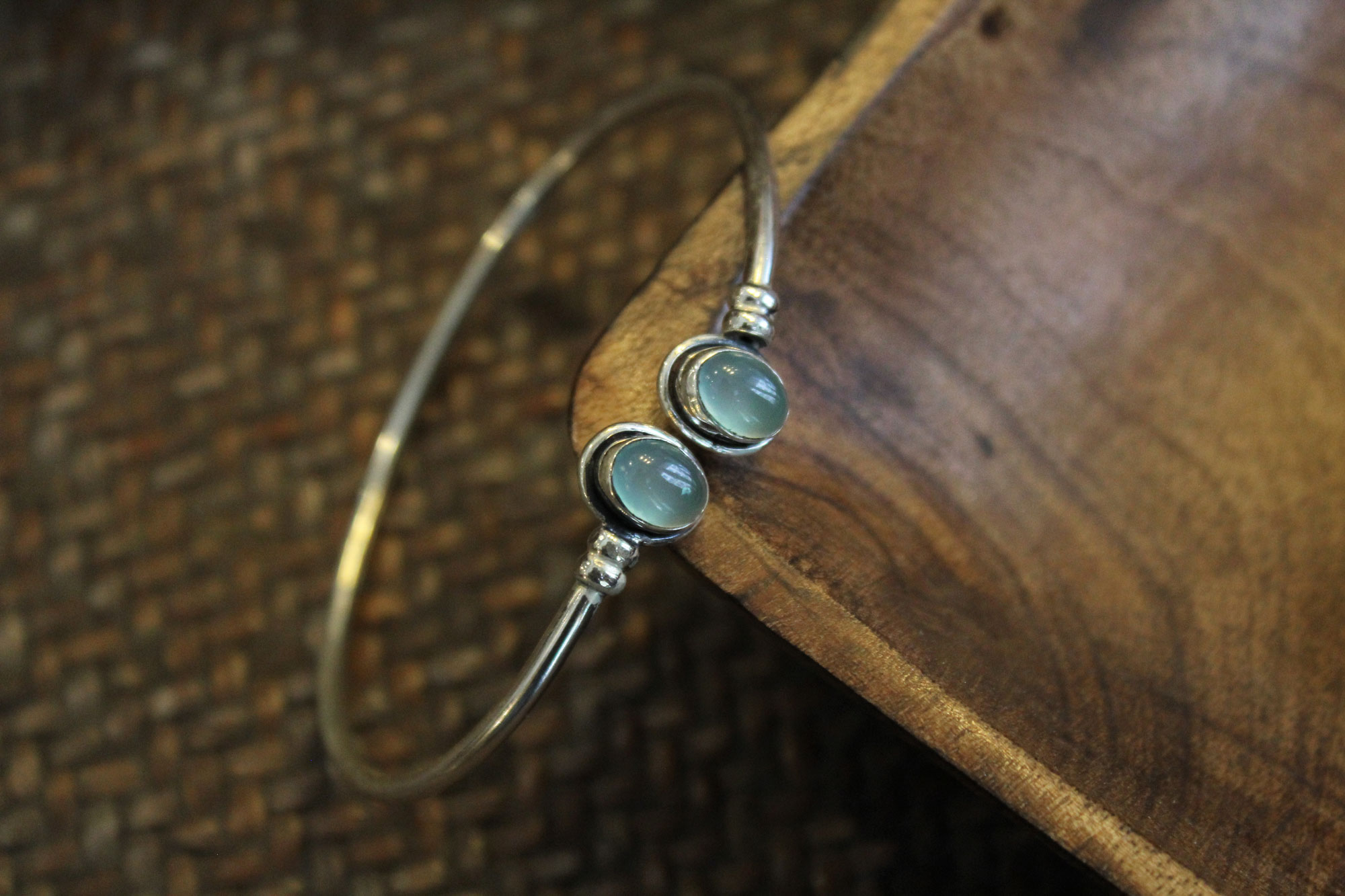 Ασημένια οβάλ χειροπέδα σε απλή γραμμή με πετρώματα από χαλκηδόνιο.