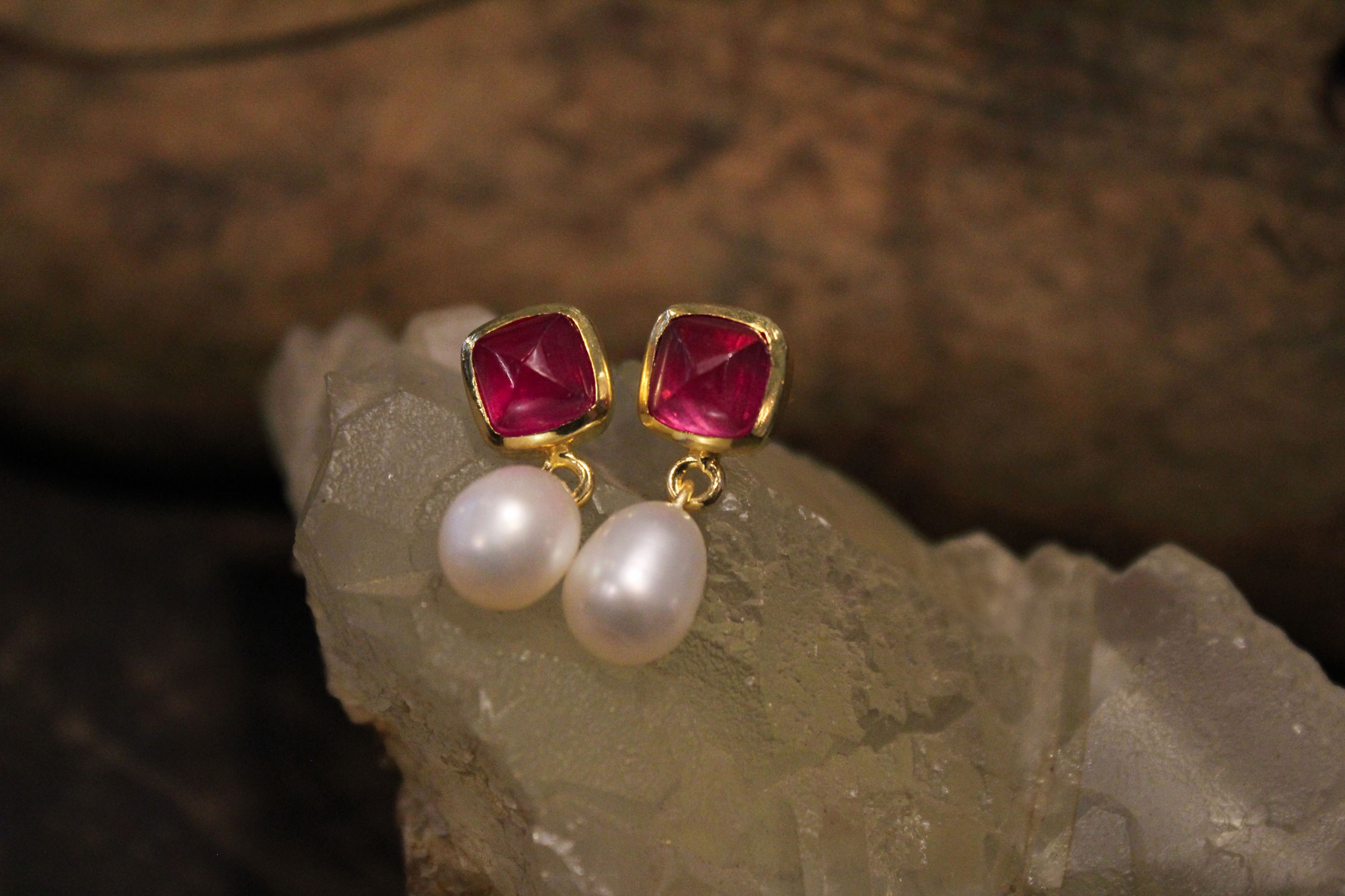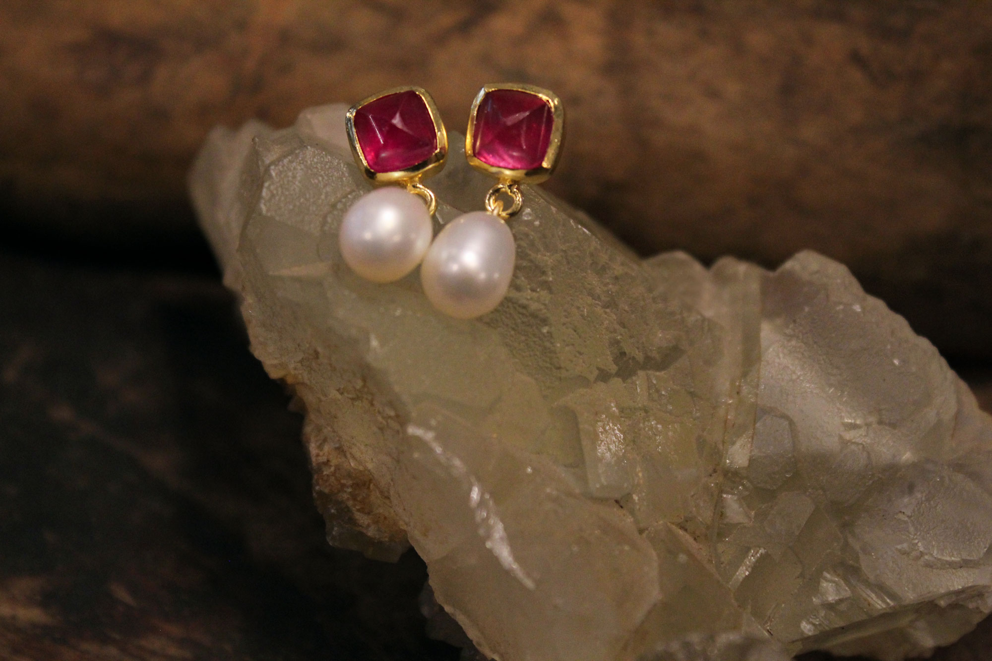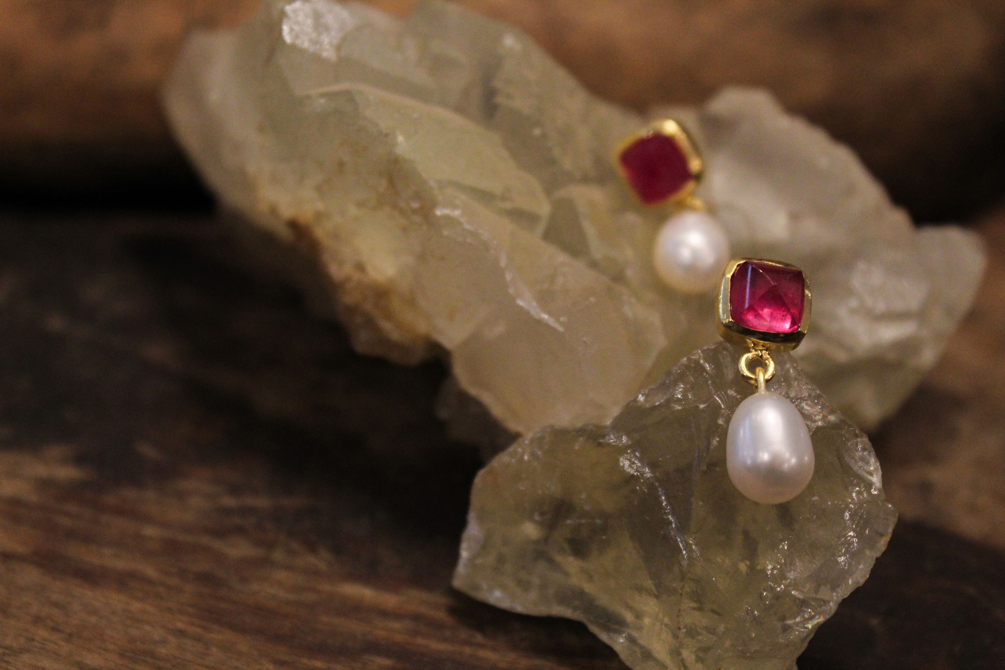 Χειροποίητα σκουλαρίκια κατασκευασμένα από επιχρυσωμένο ασήμι (18Κ) με ταγιέ πετρώματα ρουμπελίτη και μαργαριτάρια καλλιέργειας!