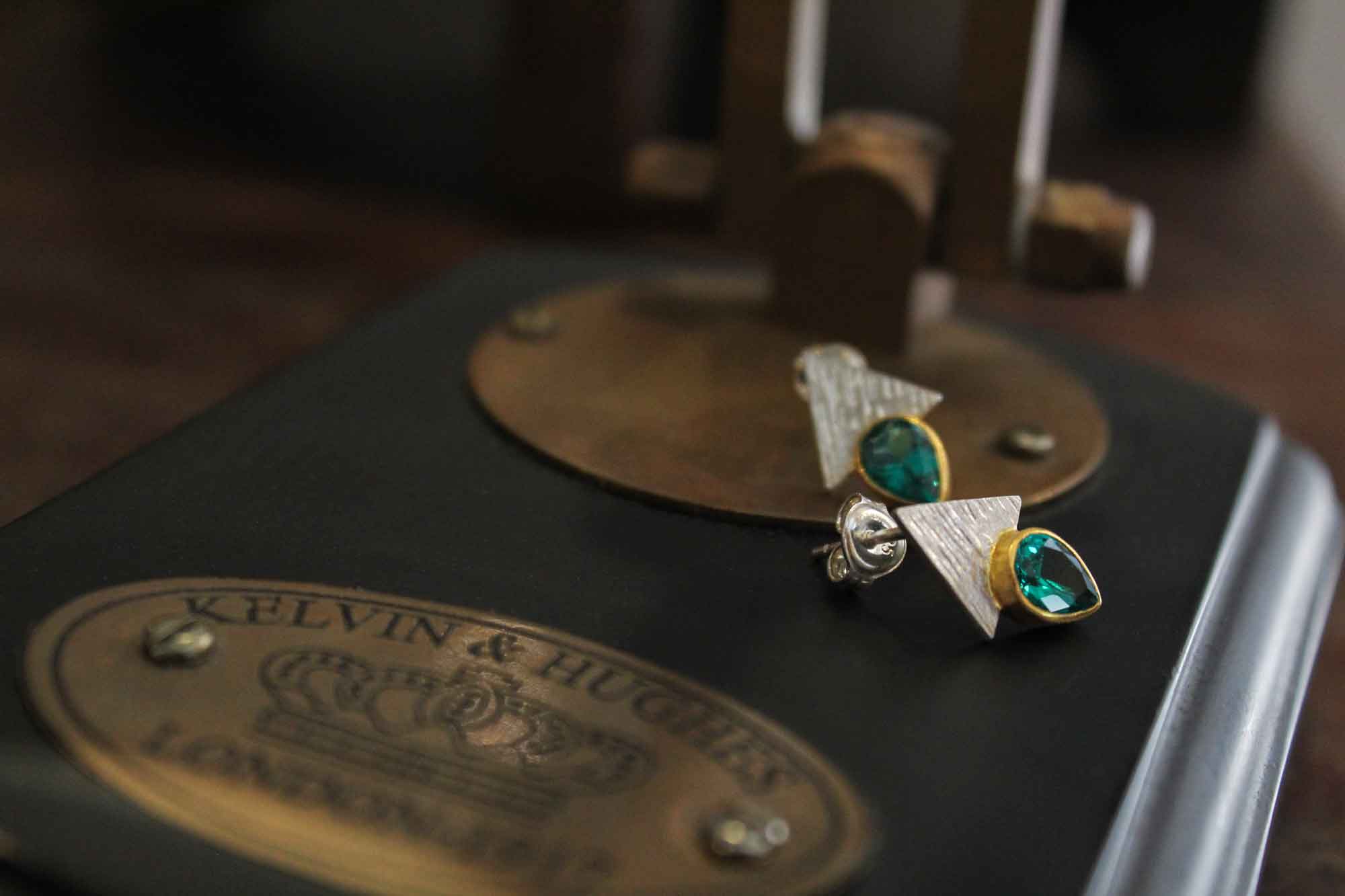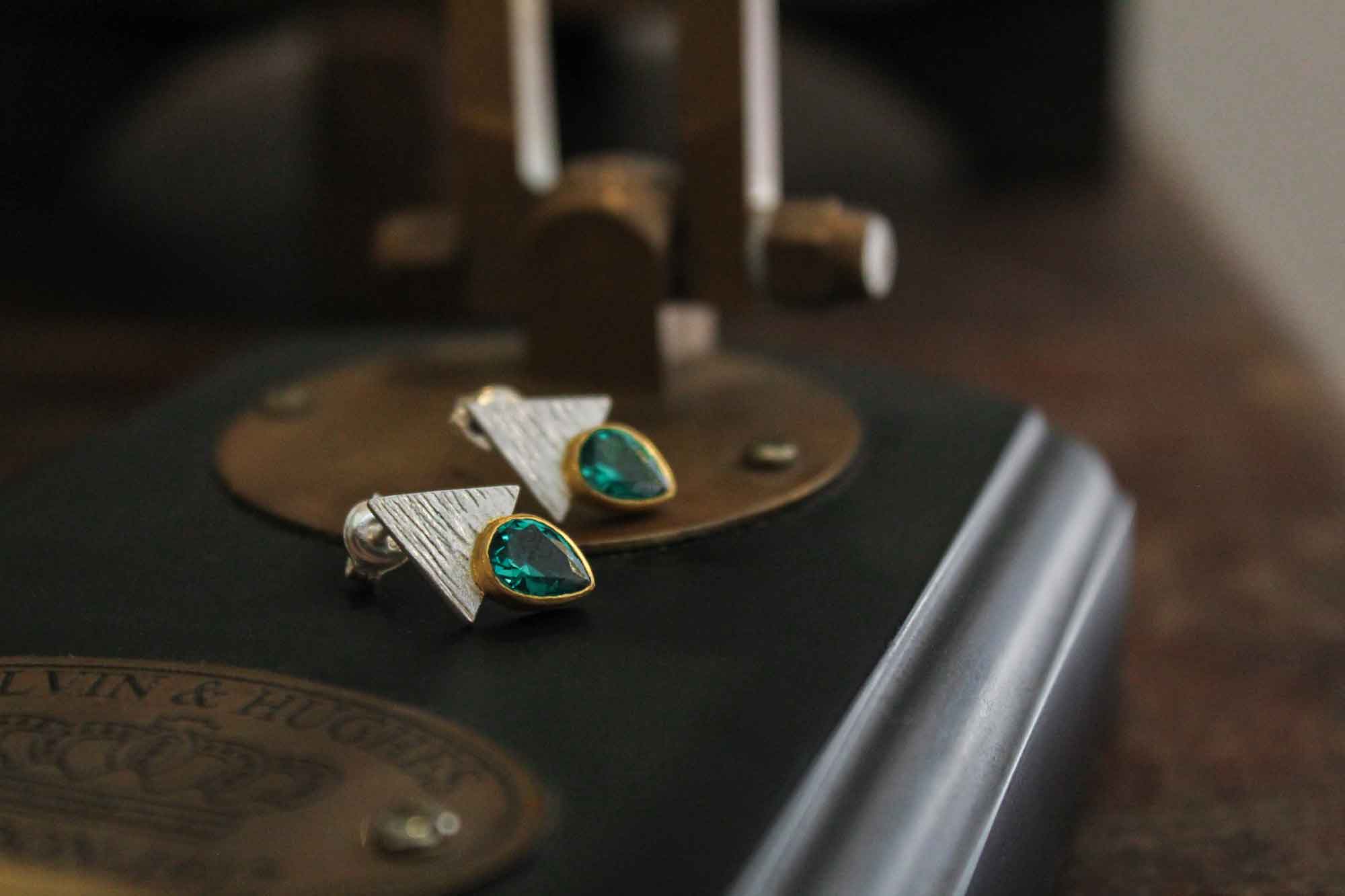 Ασημένια σκουλαρίκια μοναδικού σχεδιασμού διά χειρός Αλέξανδρου Ράλλη με επίχρυσα μέρη και πετρώματα ζιργκόν βαμμένα με λέιζερ σε πράσινη σκούρα απόχρωση.