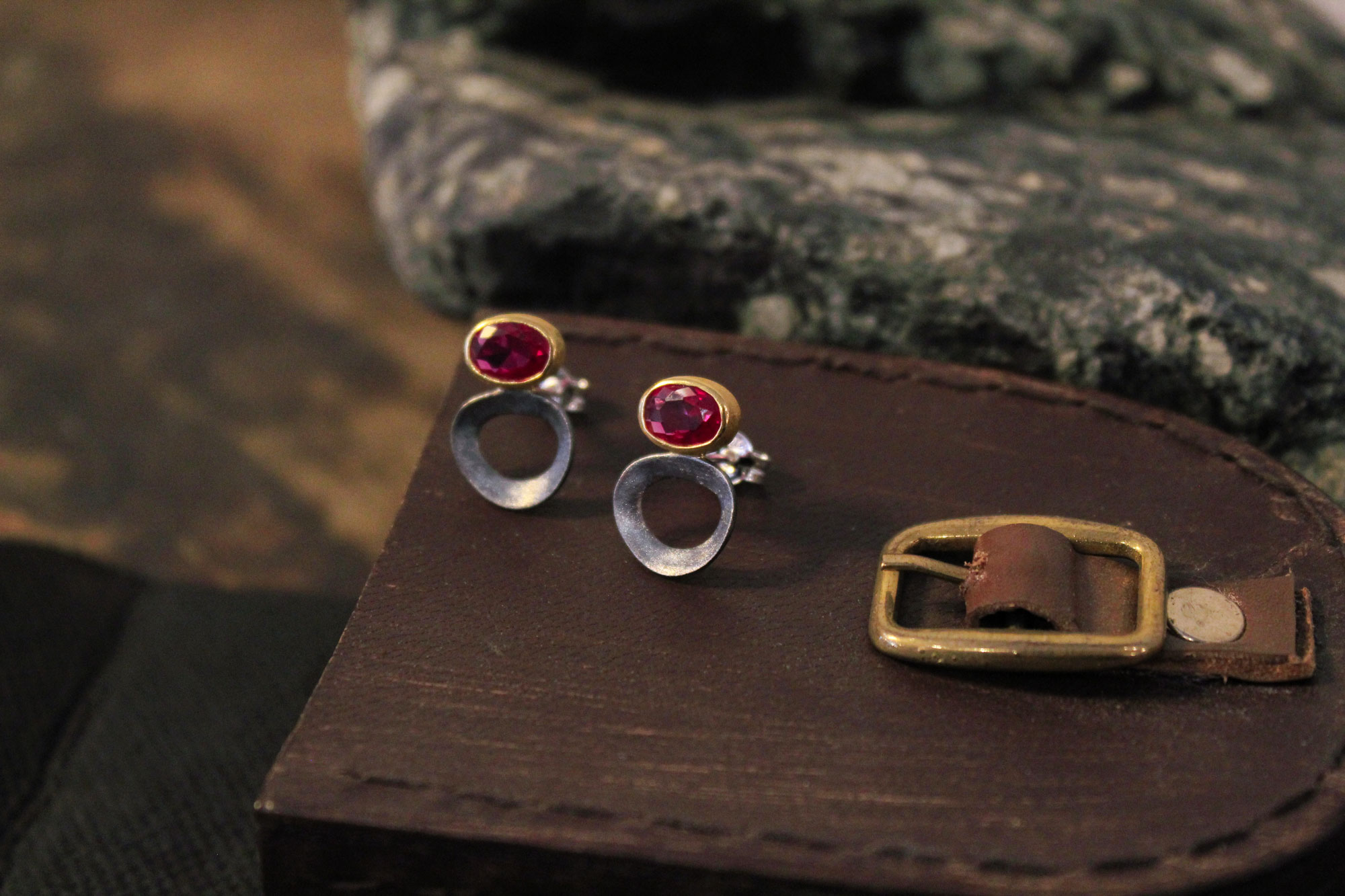 Χειροποίητα σκουλαρίκια κατασκευασμένα από οξειδωμένο ασήμι με επίχρυσα μέρη και ζιρκόνια σε φούξια απόχρωση.
