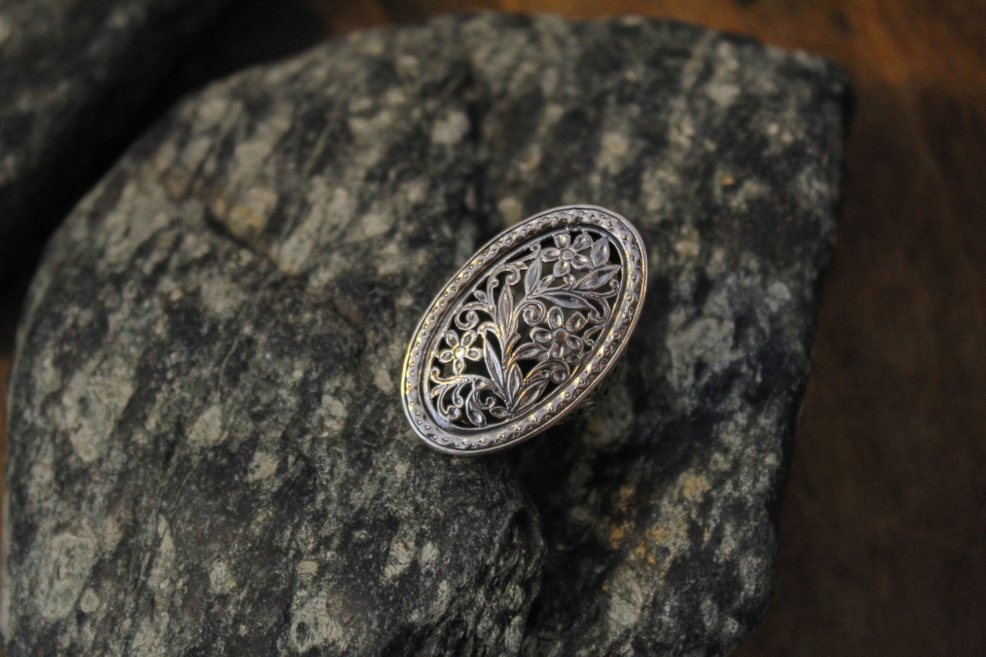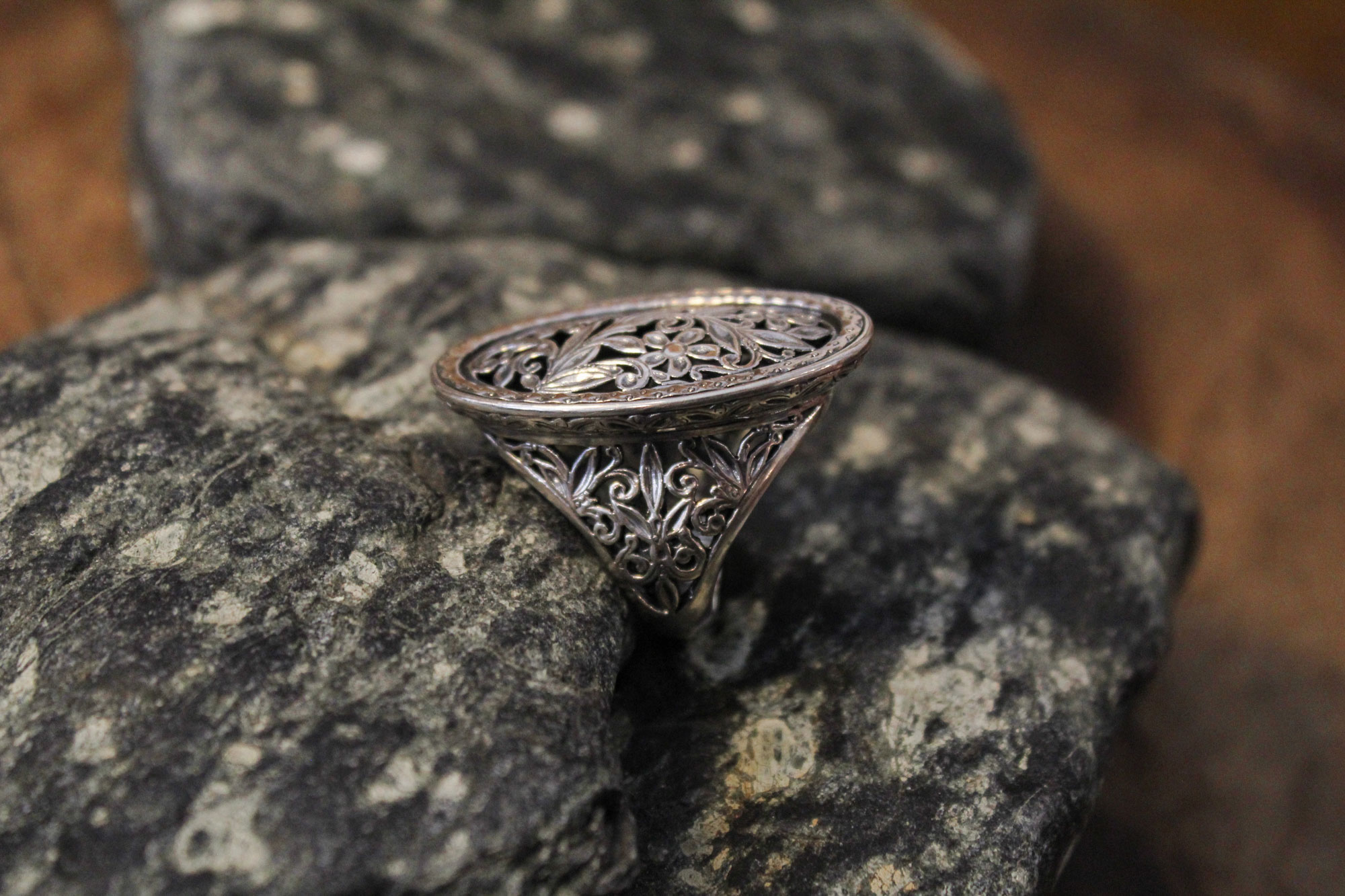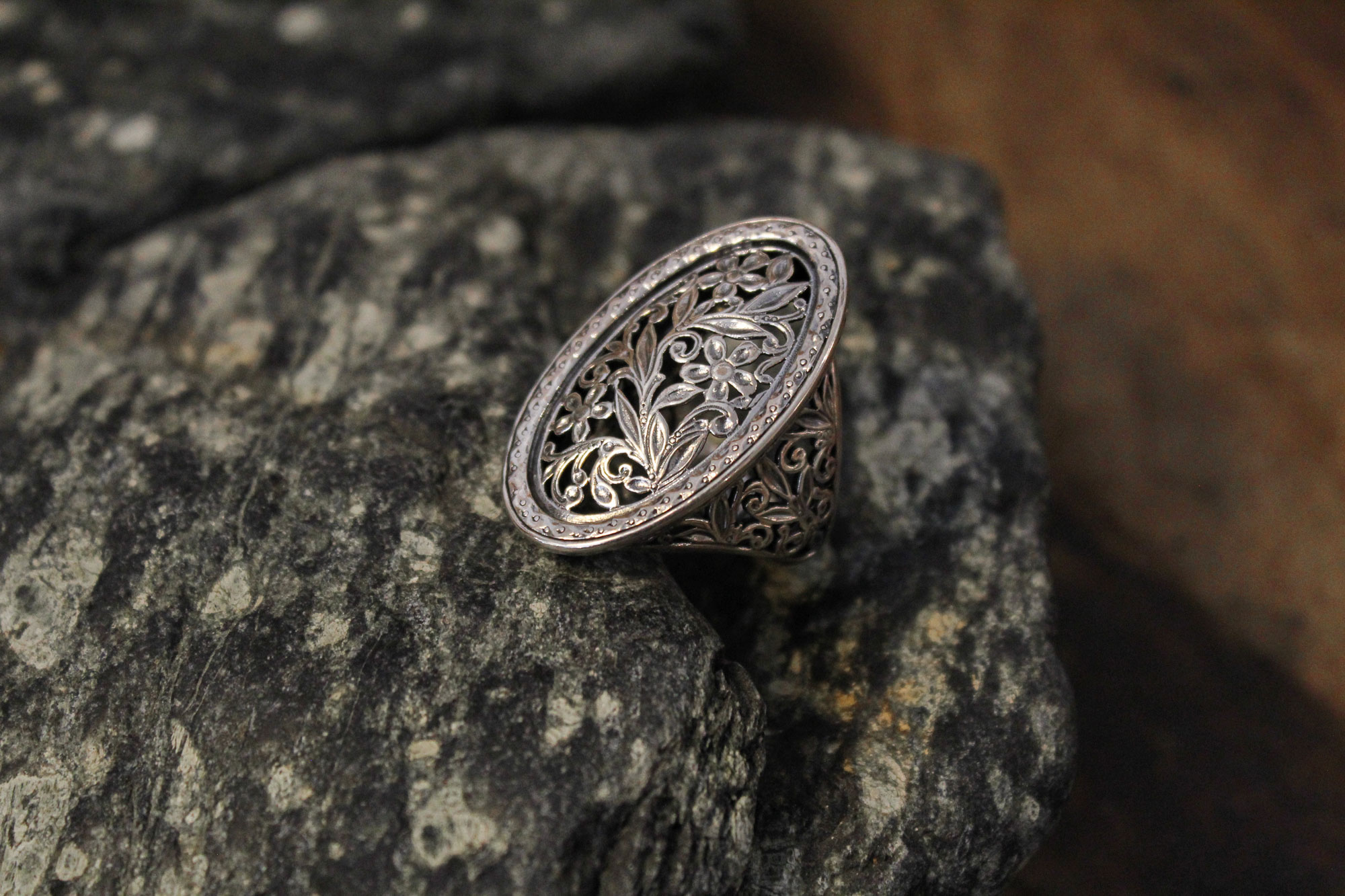 Gerochristo Jewelry χειροποίητο δαχτυλίδι κατασκευασμένο από ασήμι με εντυπωσιακό διάτρητο σχεδιασμό.