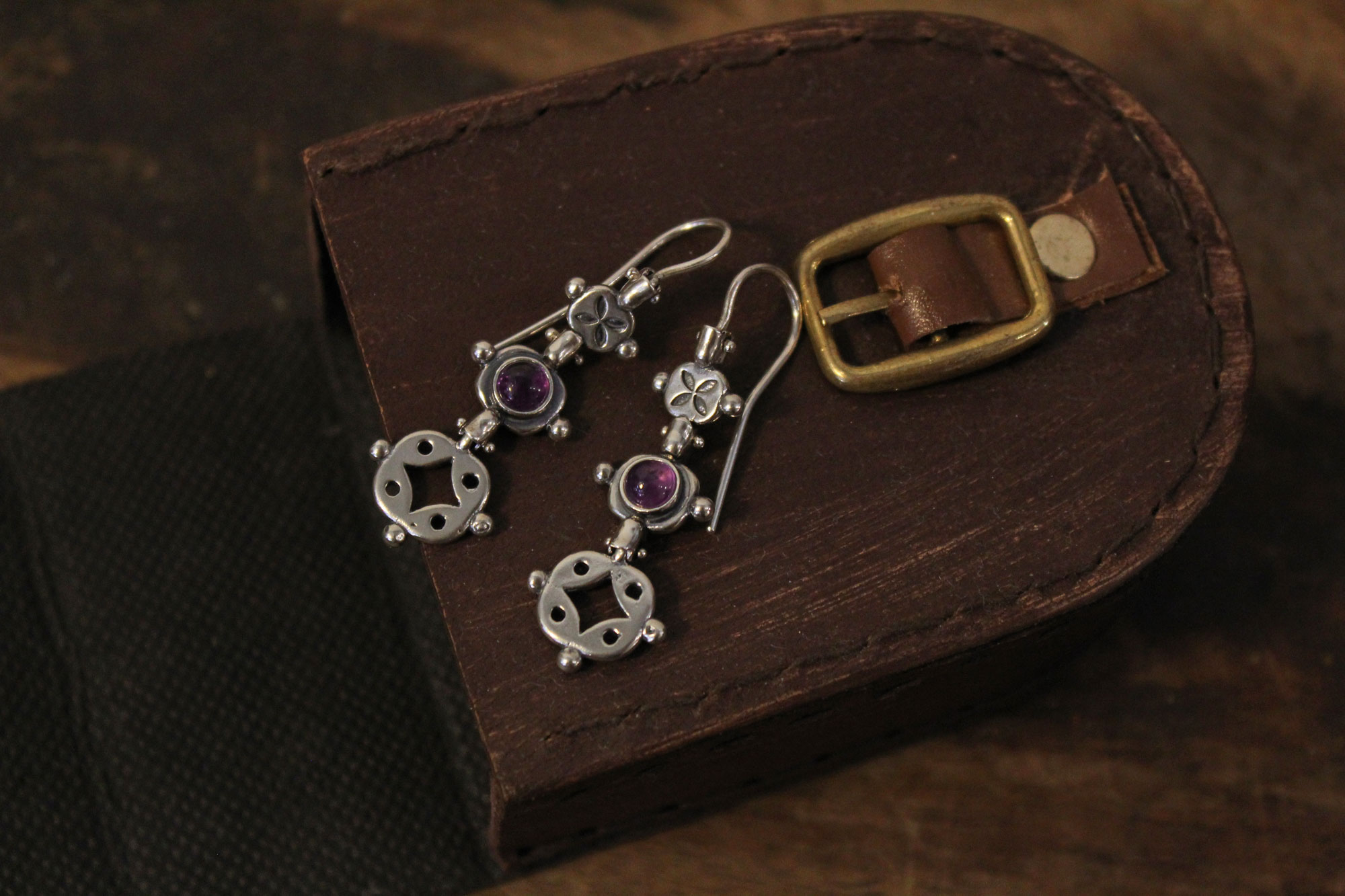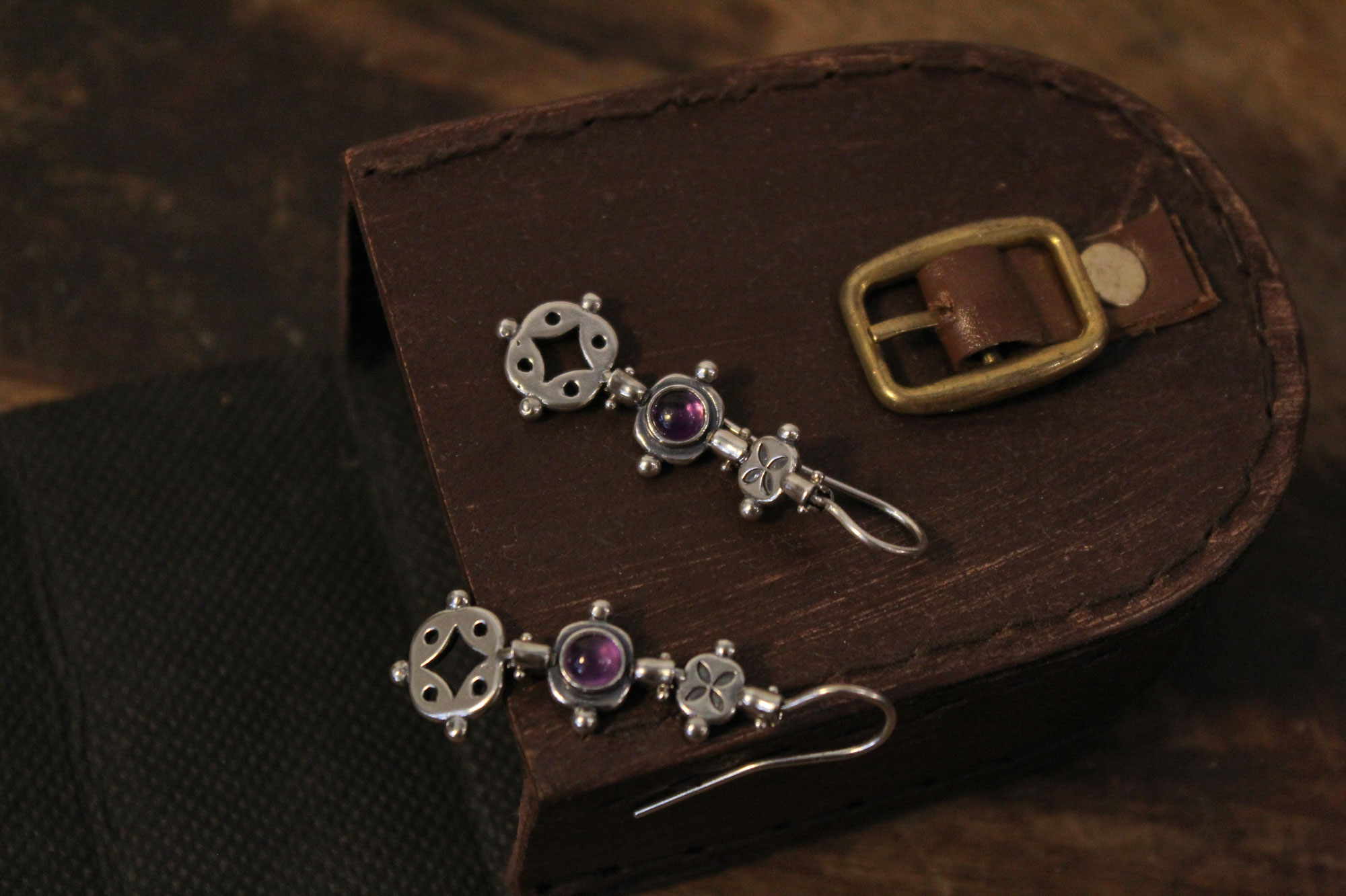 Koukos Jewellery χειροποίητα σκουλαρίκια κατασκευασμένα από ασήμι σε λιτό σχεδιασμό με διάτρητα σχέδια και στρογγυλά πετρώματα αμέθυστου.